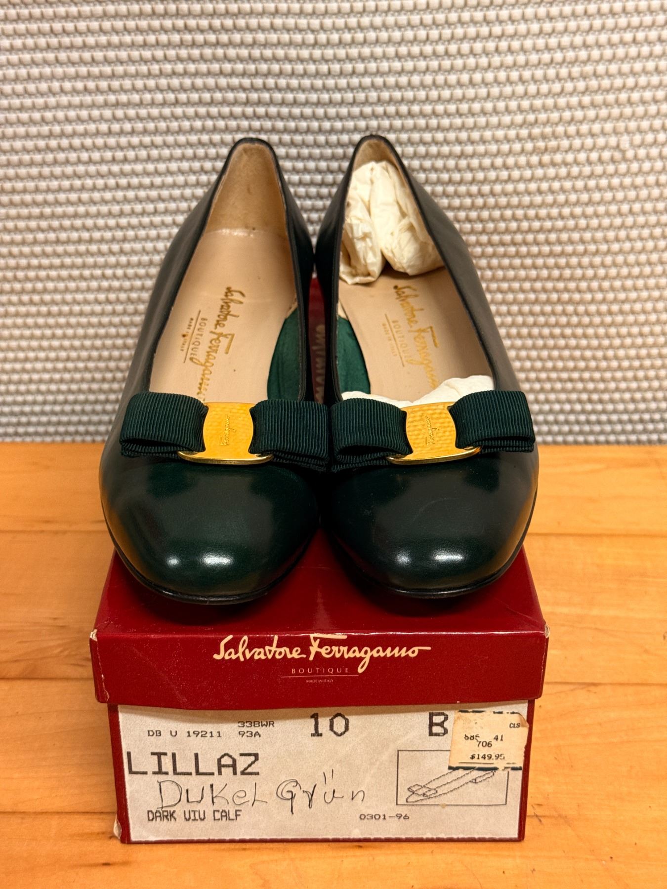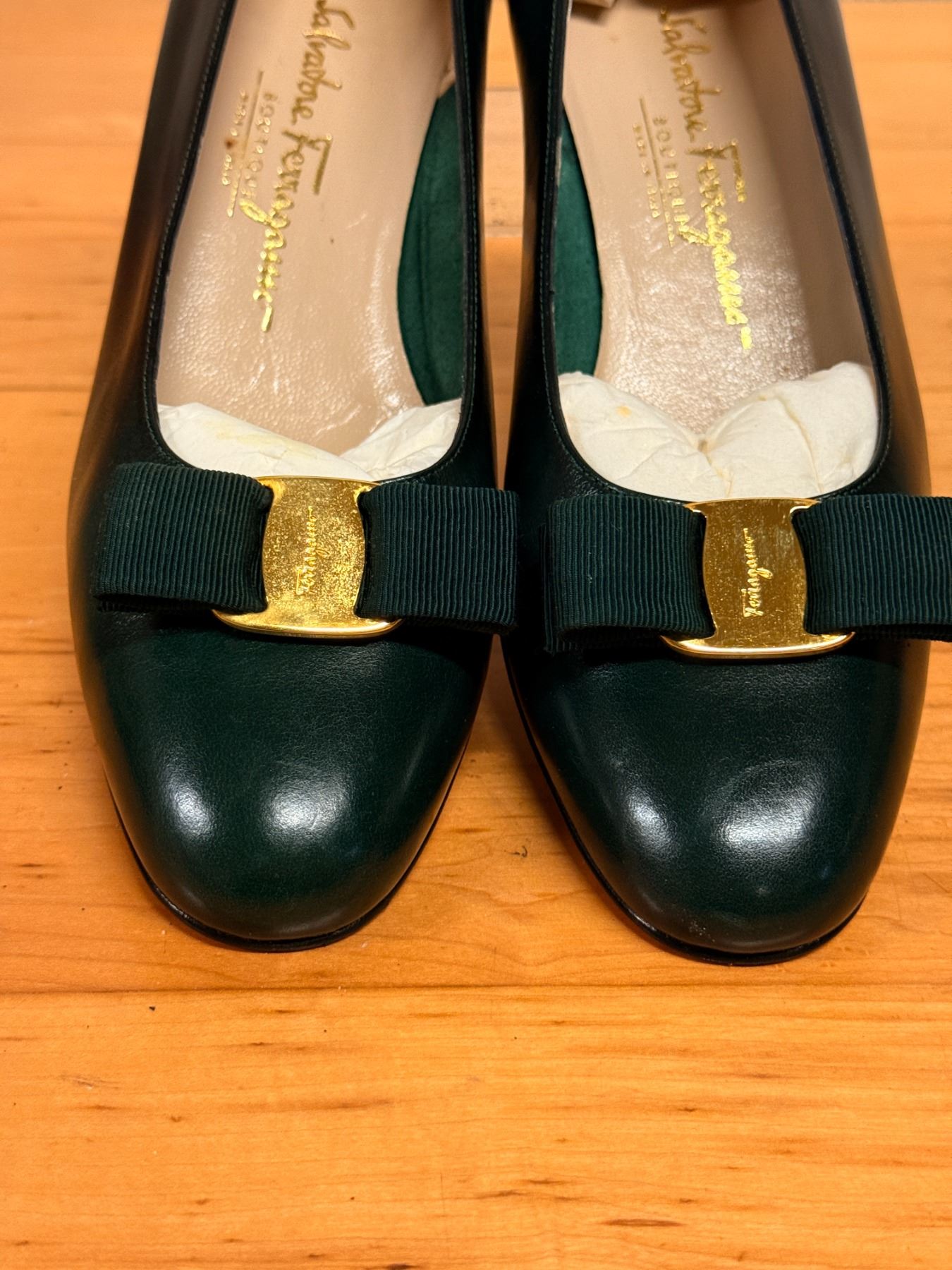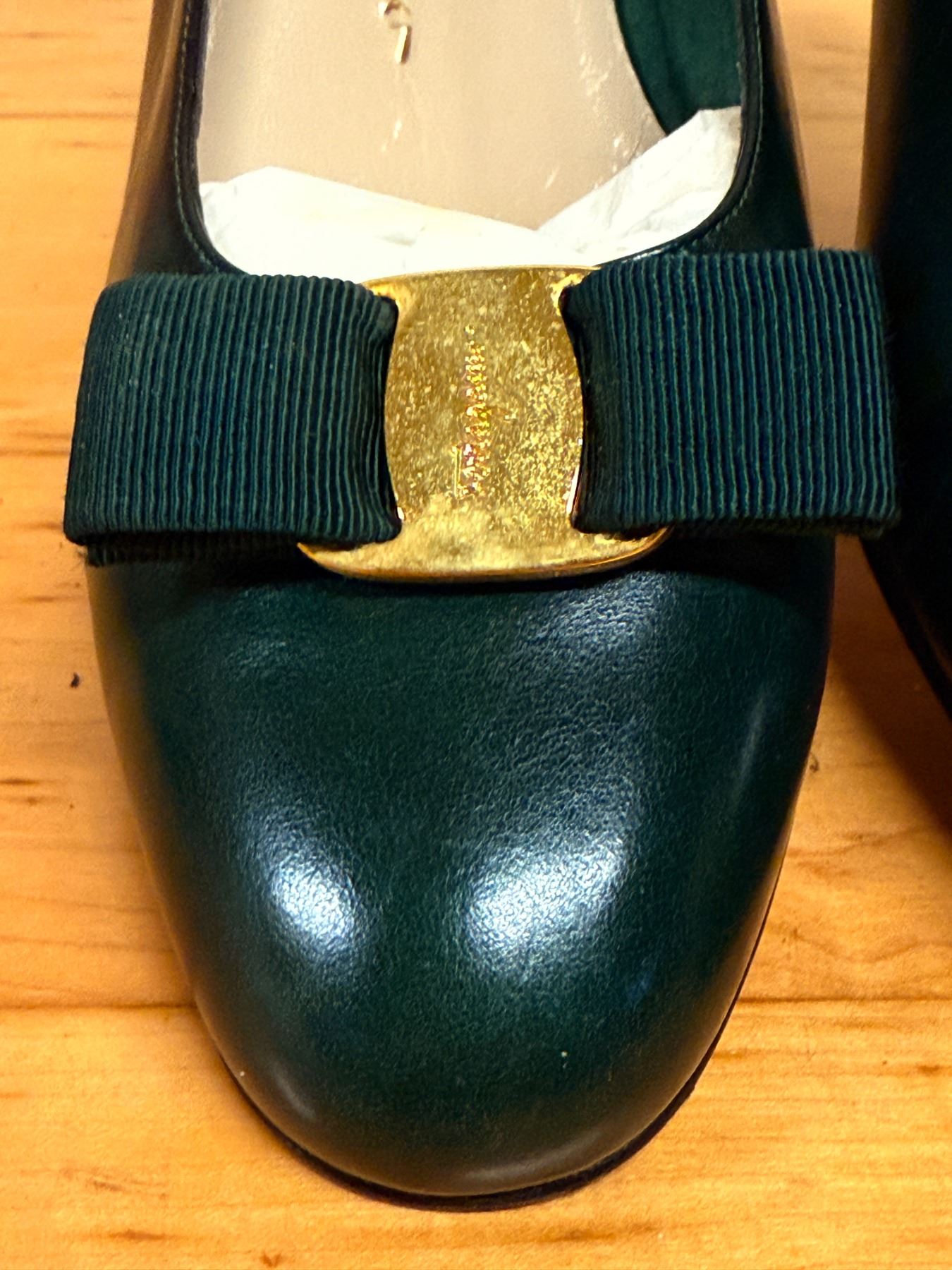 NEW Ferragamo Vara Dark Green Leather Flats Sz 10 B (heel needs repair)