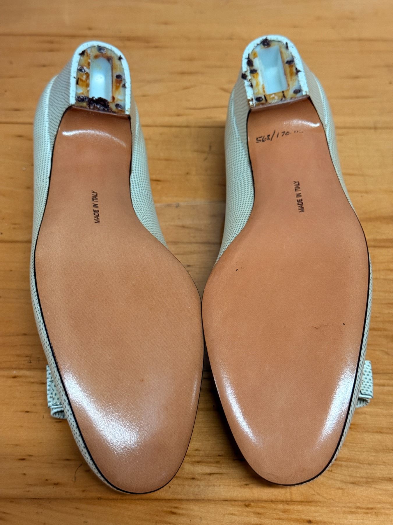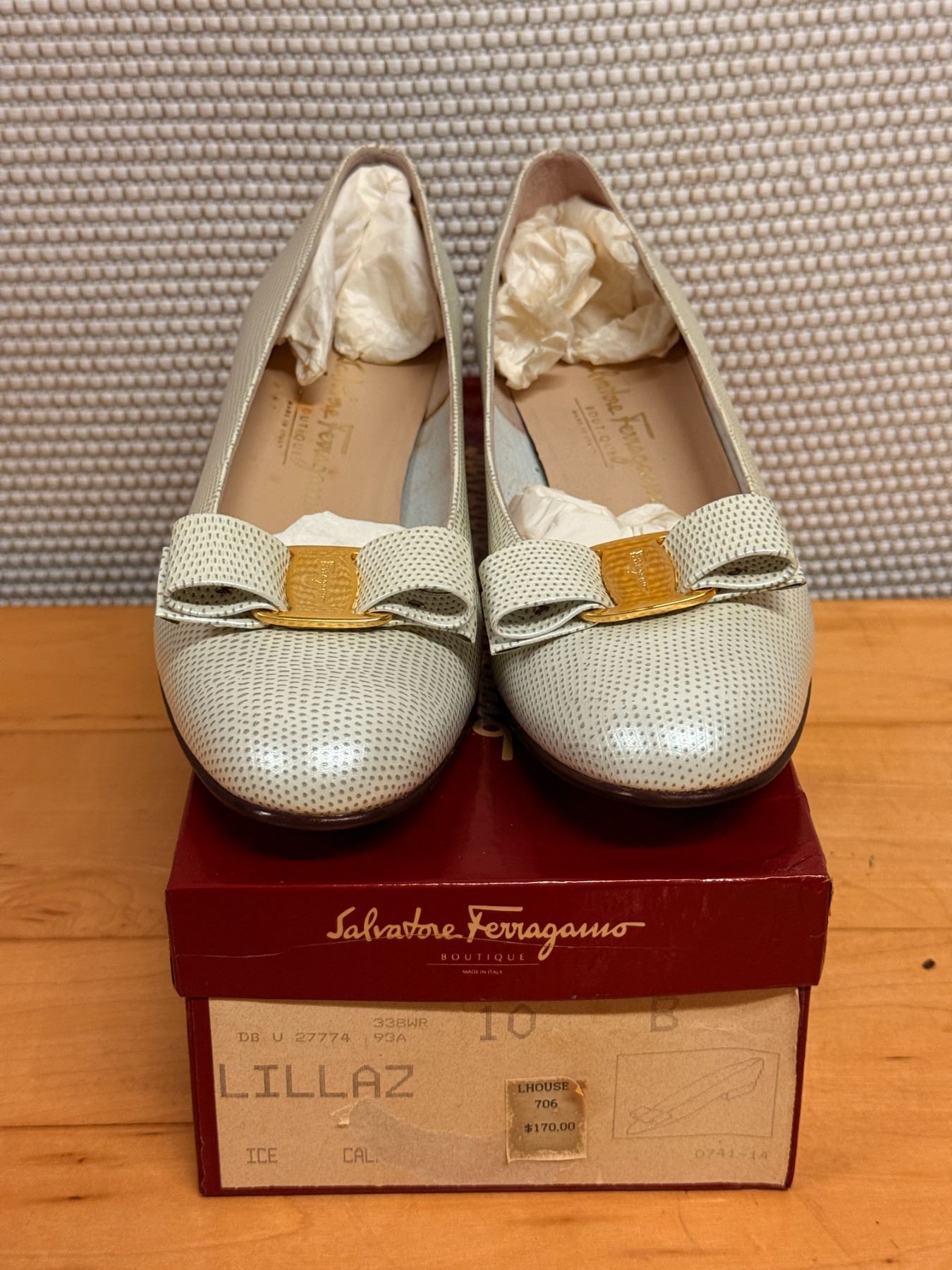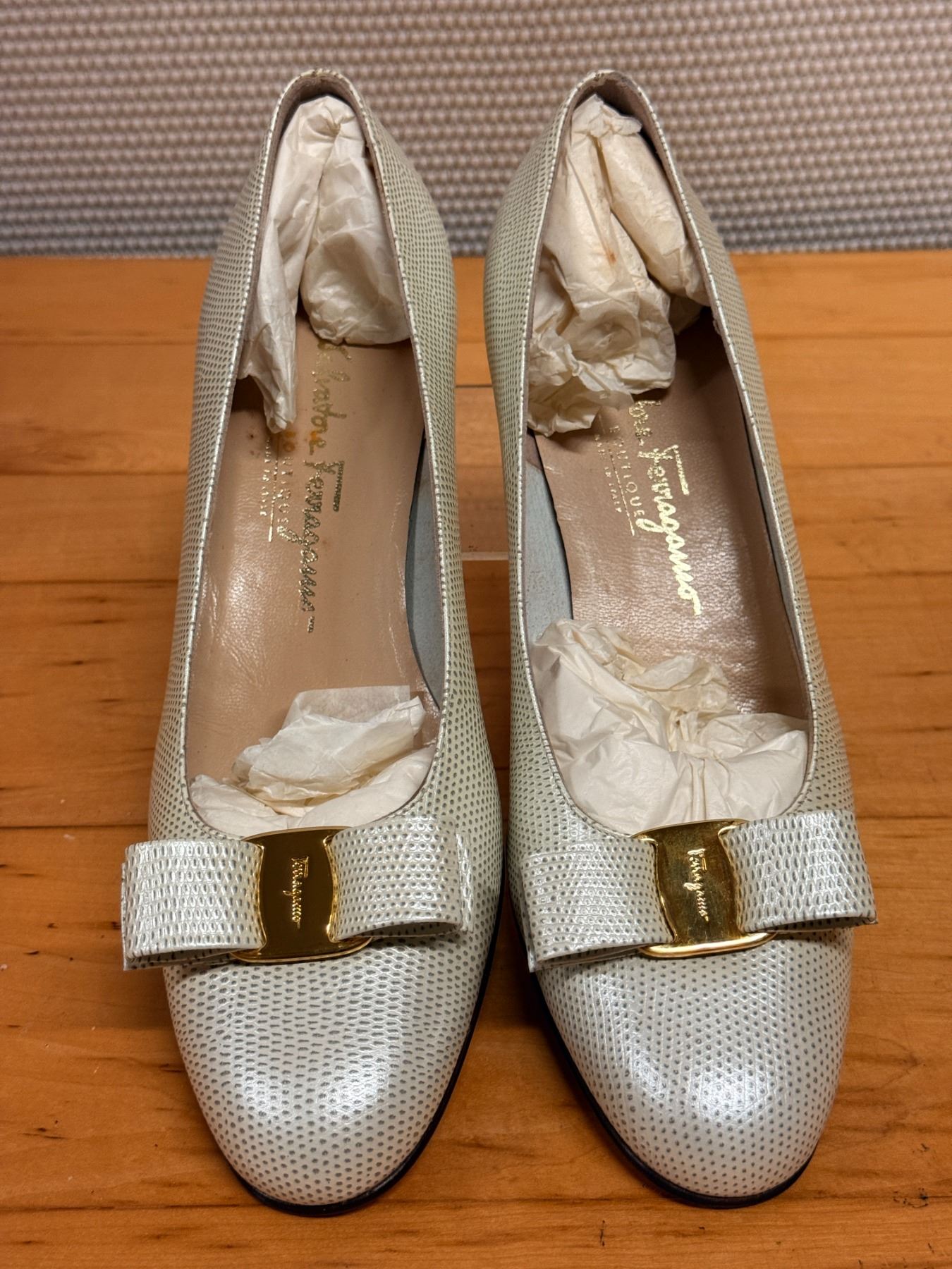 The shoes feature the brand's iconic grosgrain ribbon bow and gold-tone "Vara" plaque on the front. New and unworn, stored for years; heel requires repair due to storage wear.