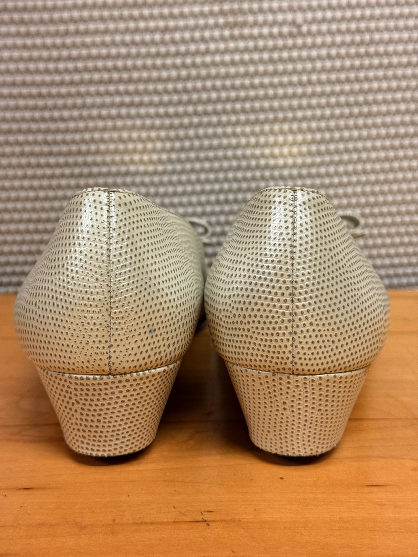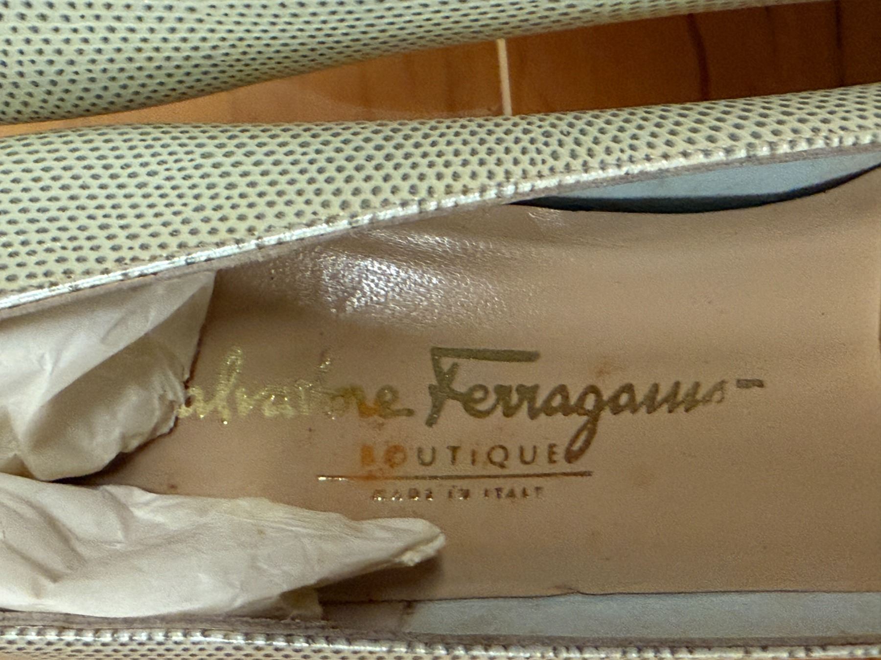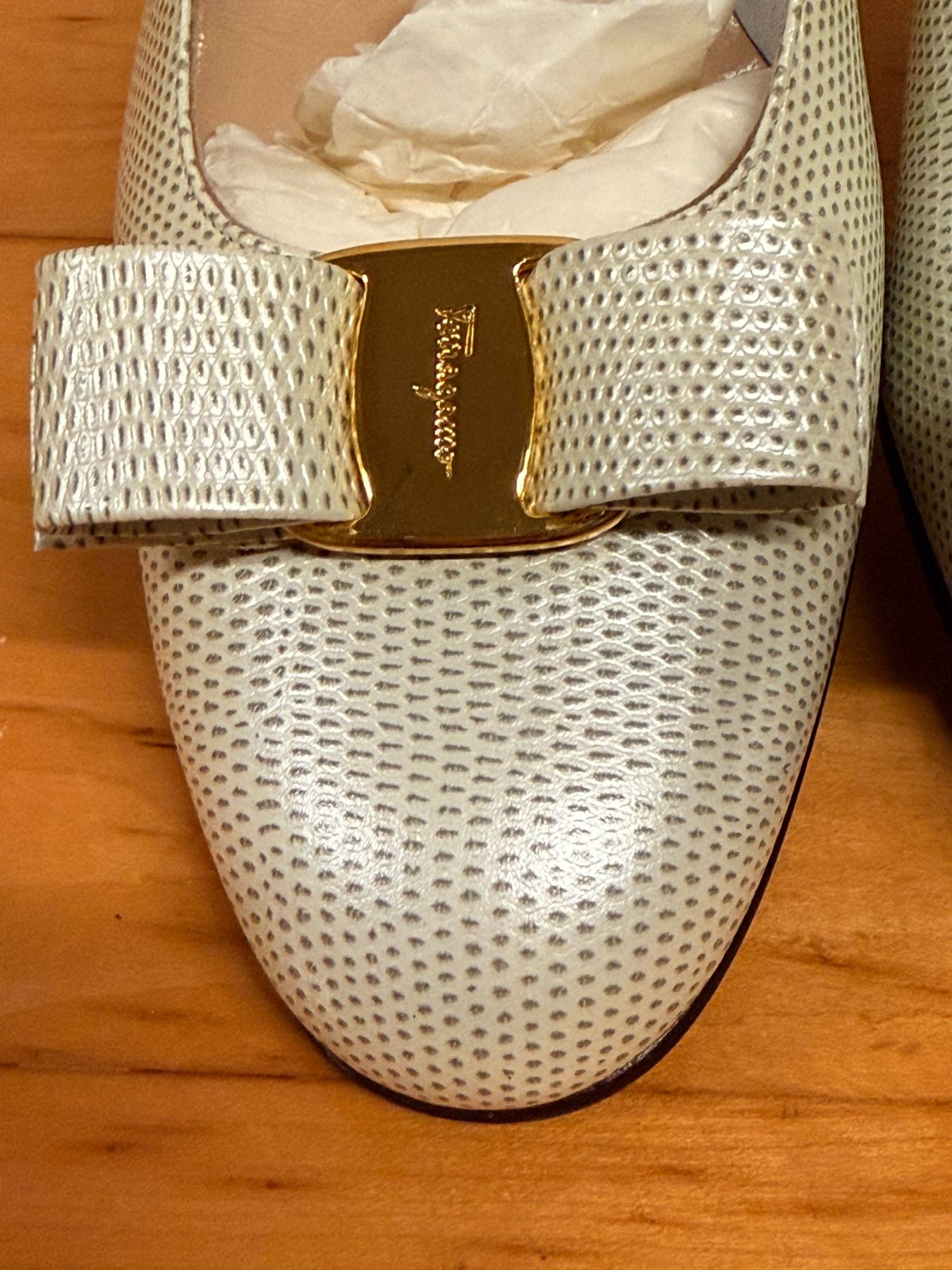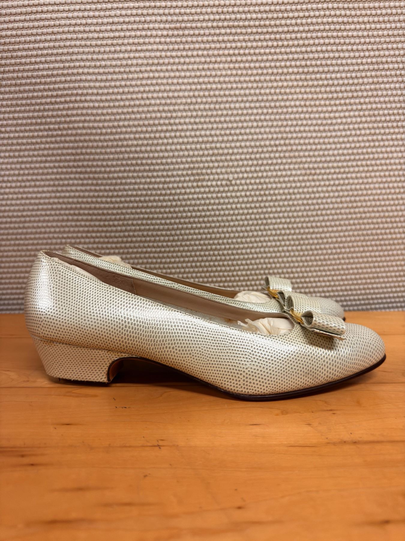 The shoes feature the brand's iconic grosgrain ribbon bow and gold-tone "Vara" plaque on the front. New and unworn, stored for years; heel requires repair due to storage wear.