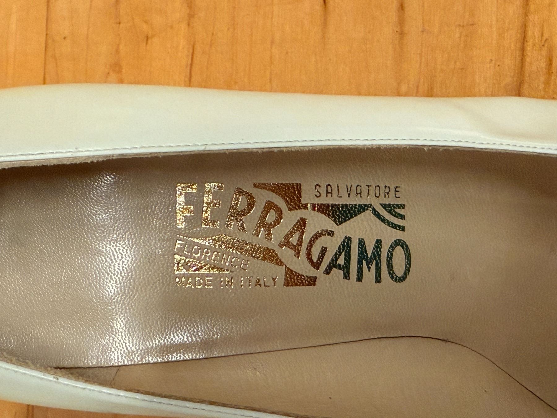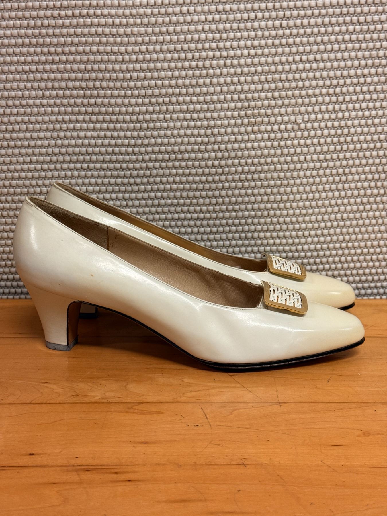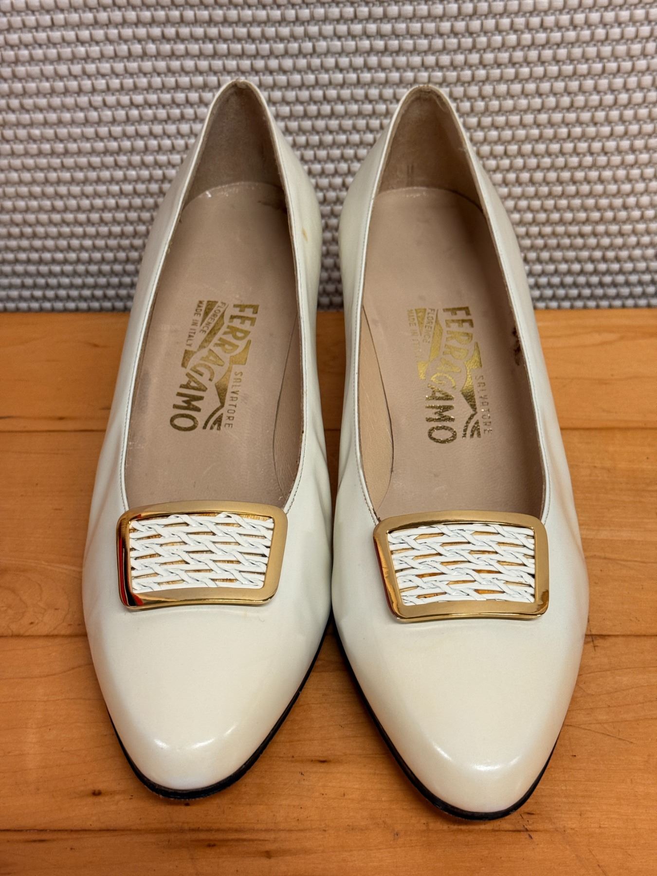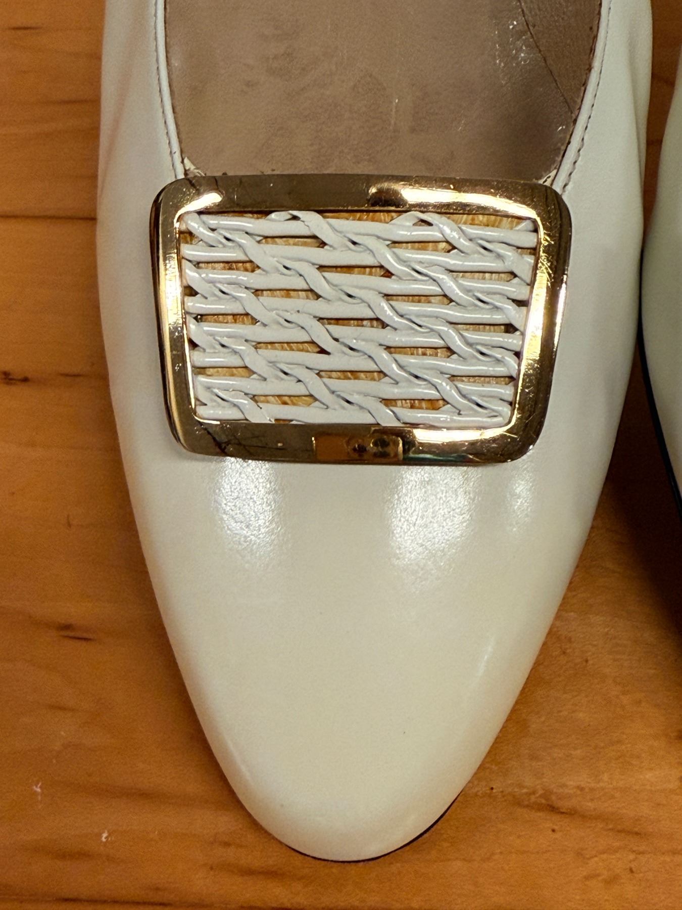 Vintage Salvatore Ferragamo white leather flats featuring gold-trimmed woven-style buckles, pointed toes, and classic Italian craftsmanship. Elegant, polished, and timeless. New and unworn, stored for years; heel requires repair due to storage wear.