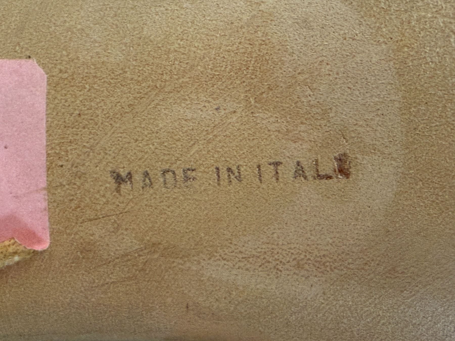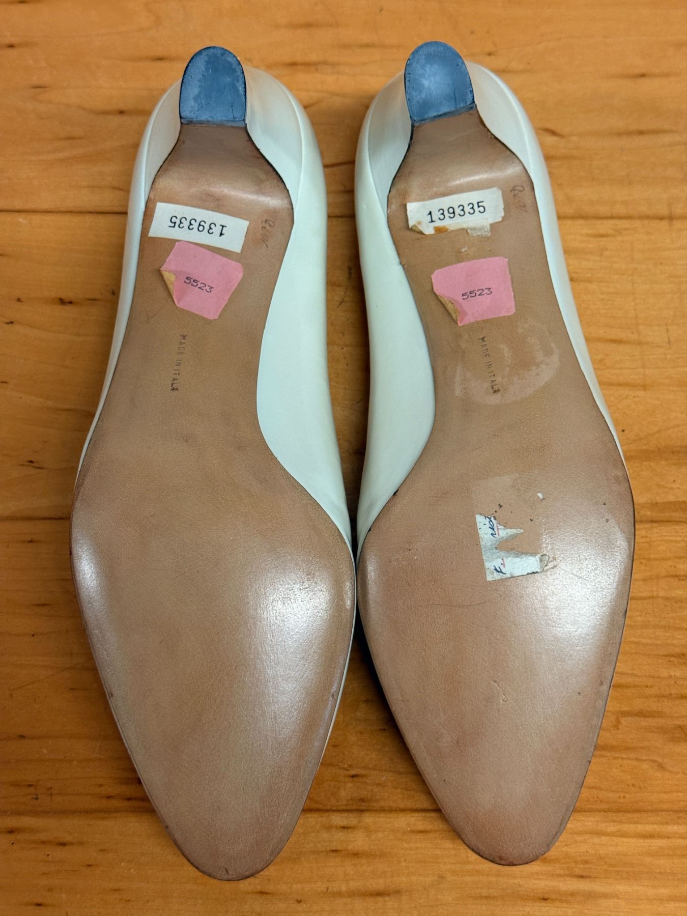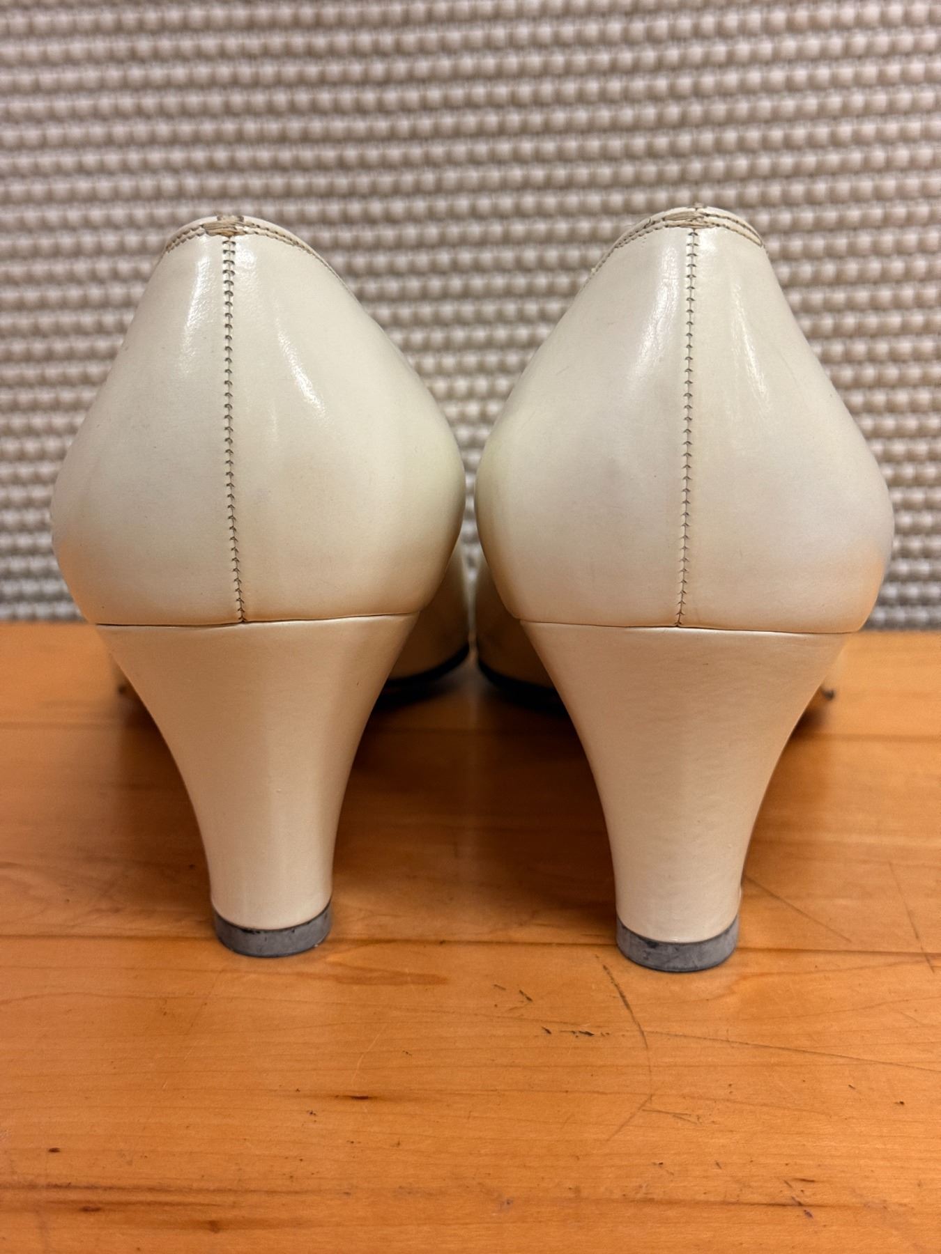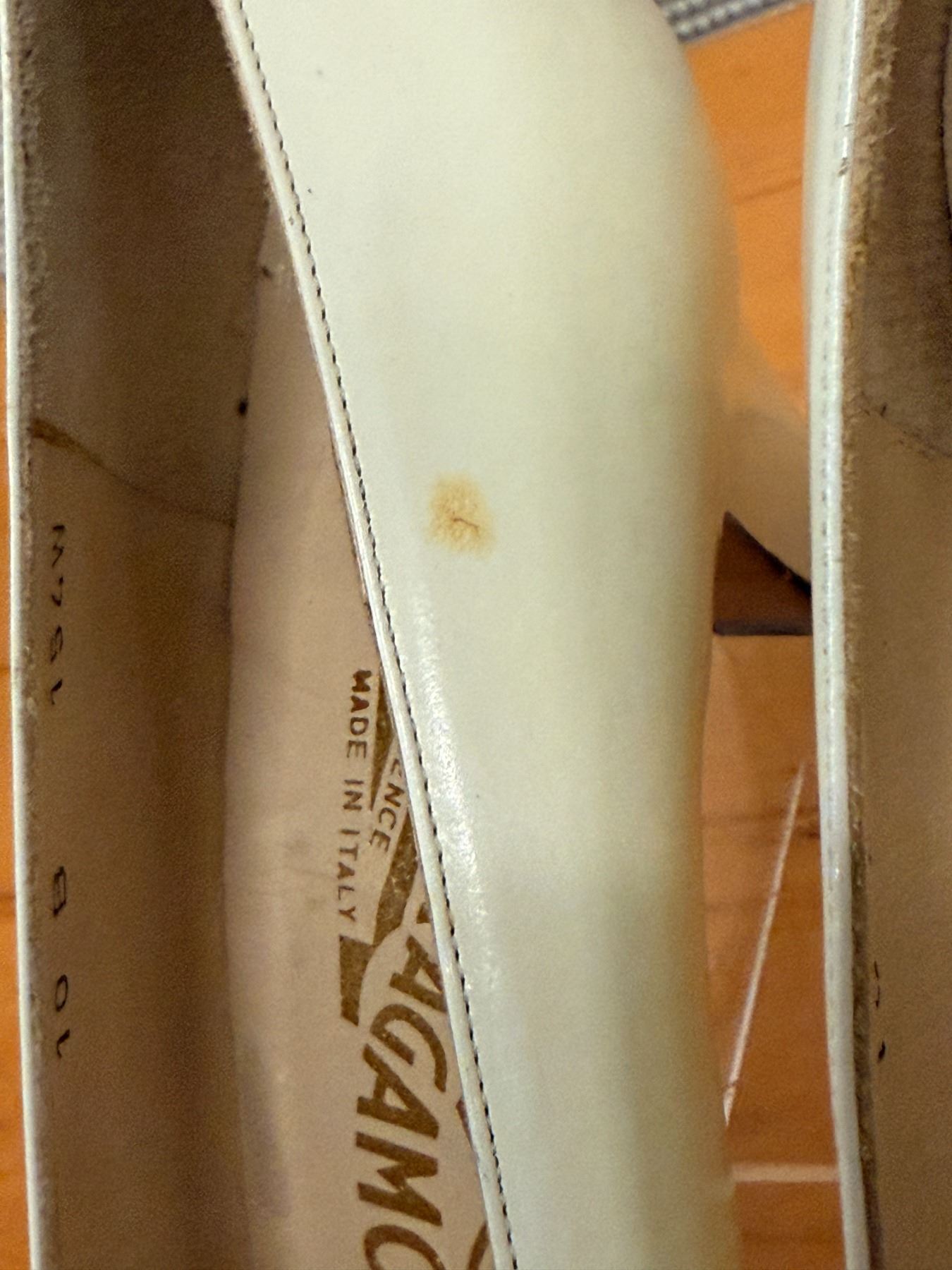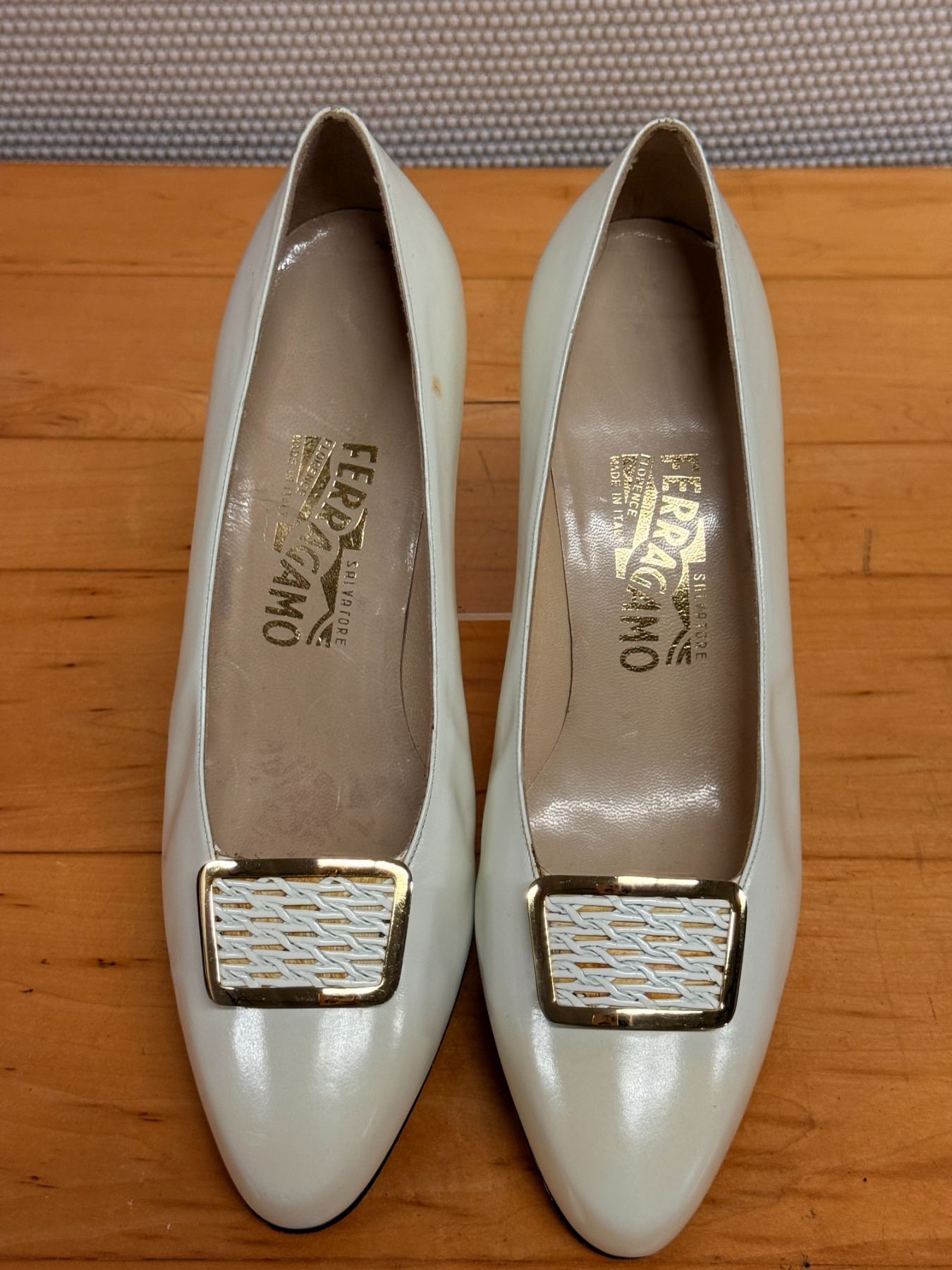 Vintage Salvatore Ferragamo white leather flats featuring gold-trimmed woven-style buckles, pointed toes, and classic Italian craftsmanship. Elegant, polished, and timeless. New and unworn, stored for years; heel requires repair due to storage wear.