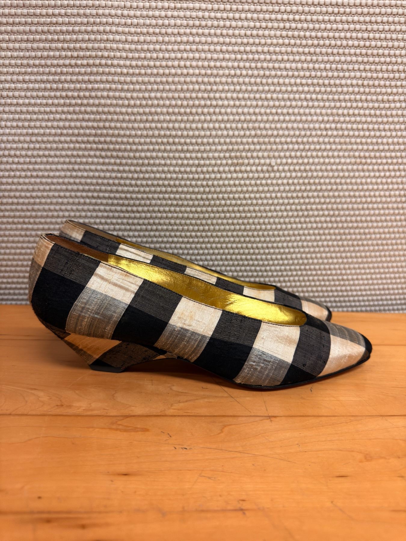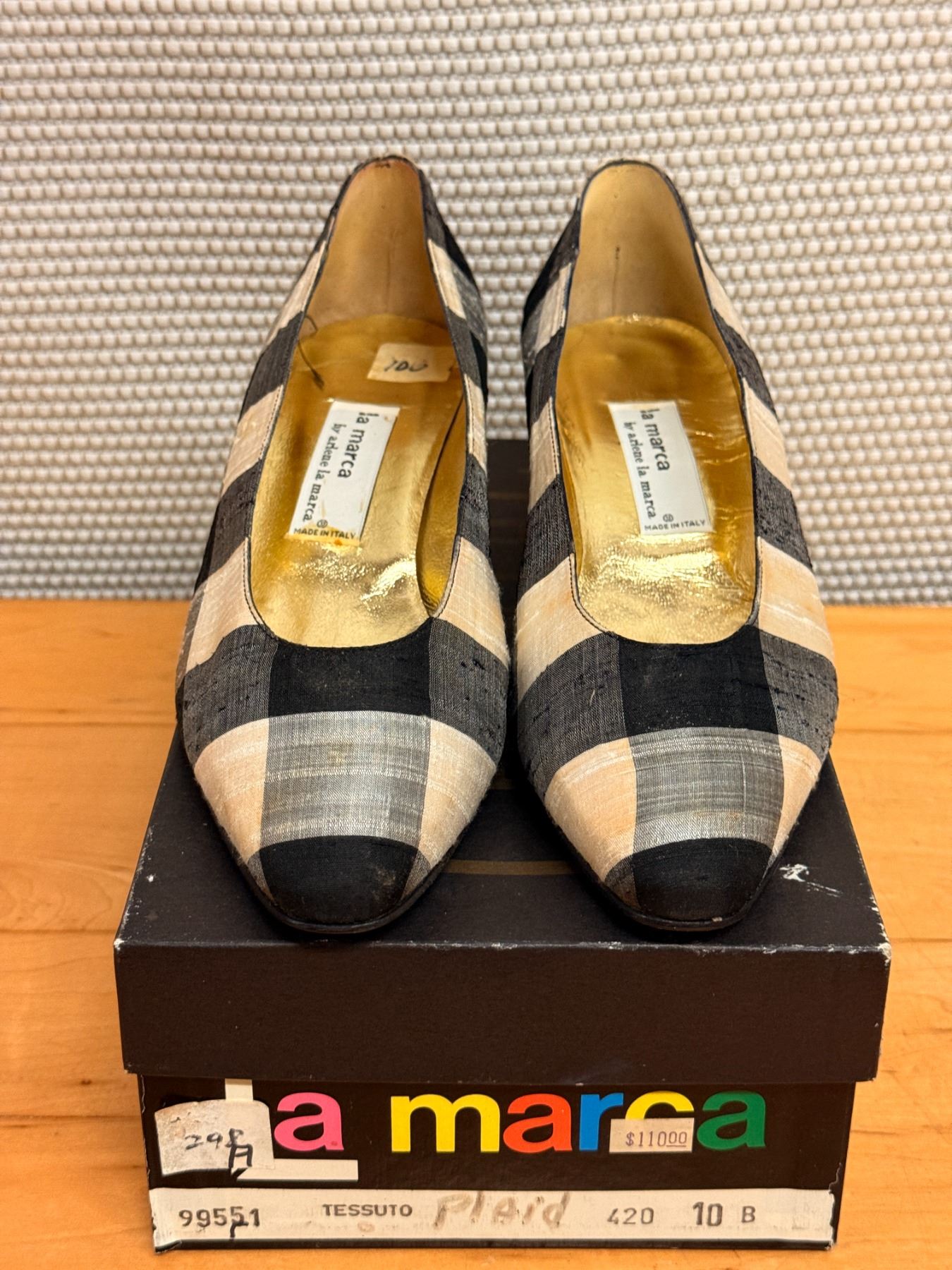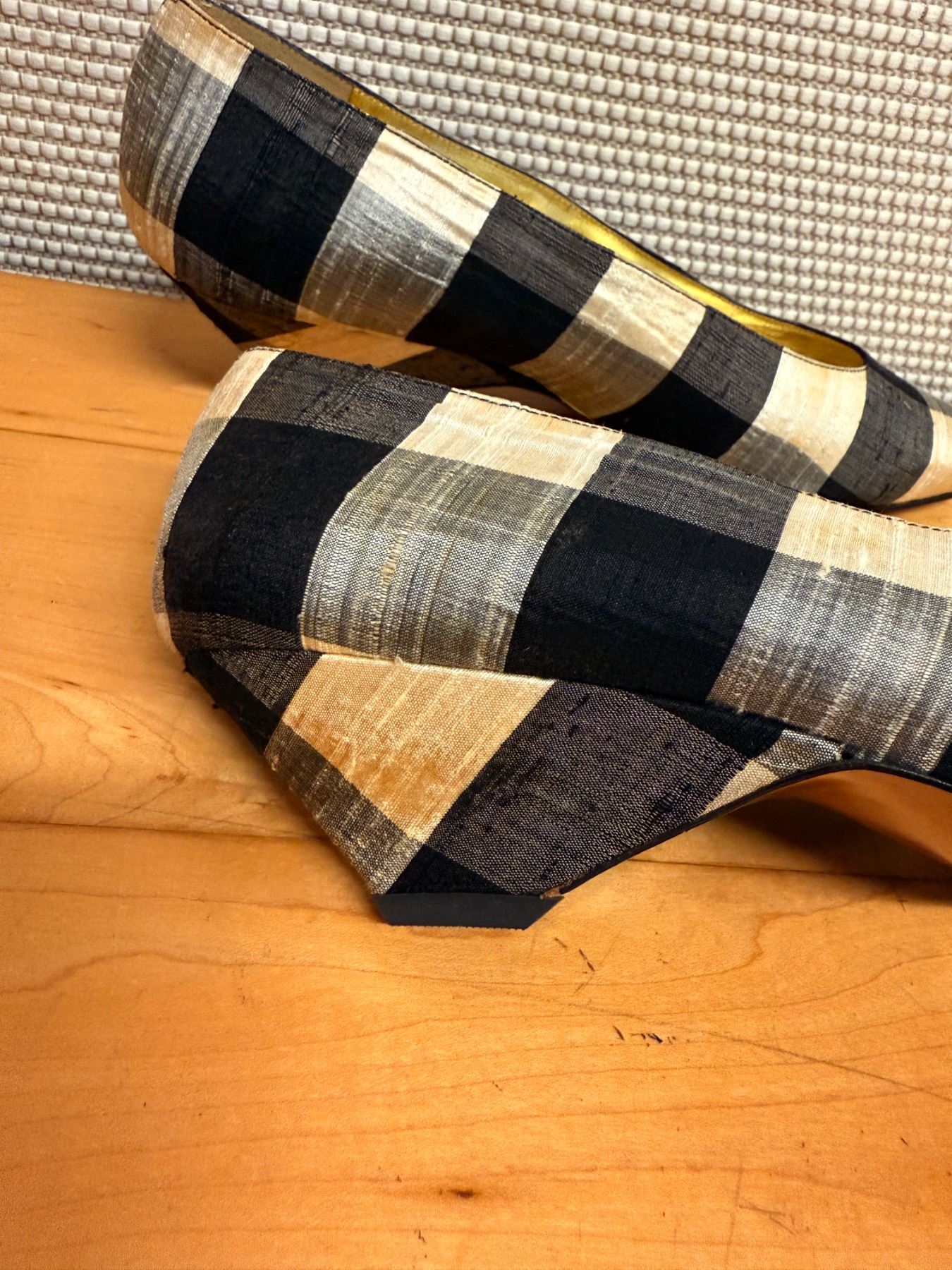 Vintage La Marca Italian-made pointed flats featuring a black and taupe plaid textile exterior, gold insole finish, and classic slip-on design. Unique, stylish, and lightweight. New and unworn, stored for years; heel requires repair due to storage wear.