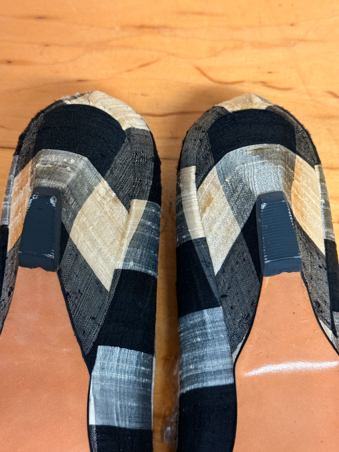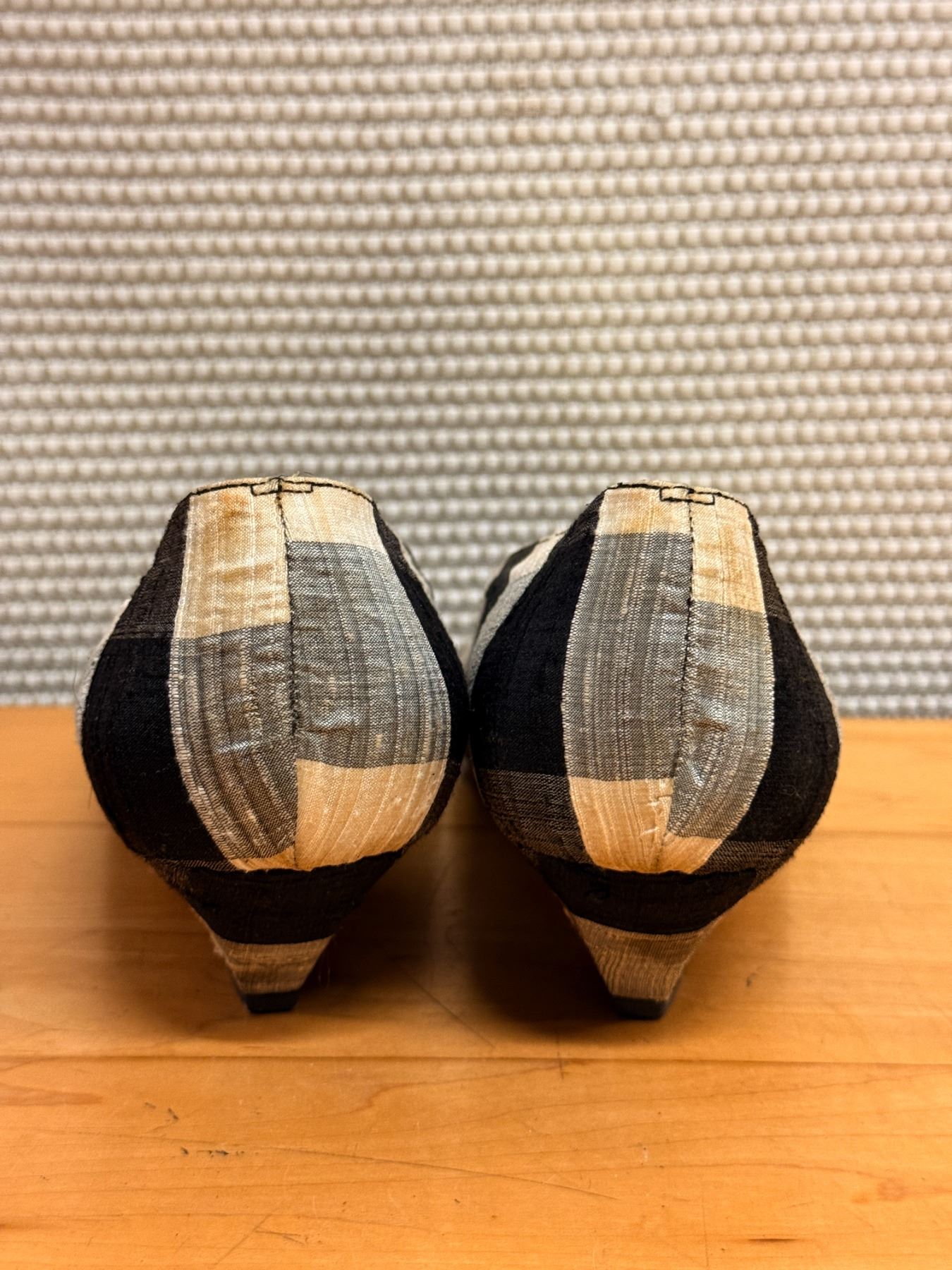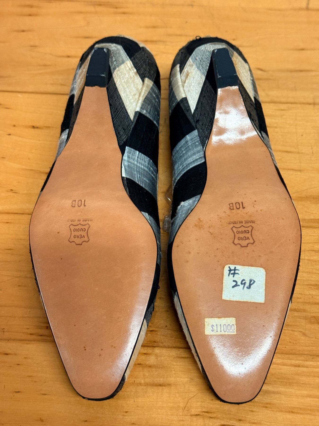 Vintage La Marca Italian-made pointed flats featuring a black and taupe plaid textile exterior, gold insole finish, and classic slip-on design. Unique, stylish, and lightweight. New and unworn, stored for years; heel requires repair due to storage wear.