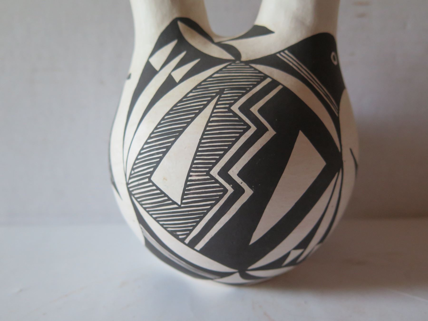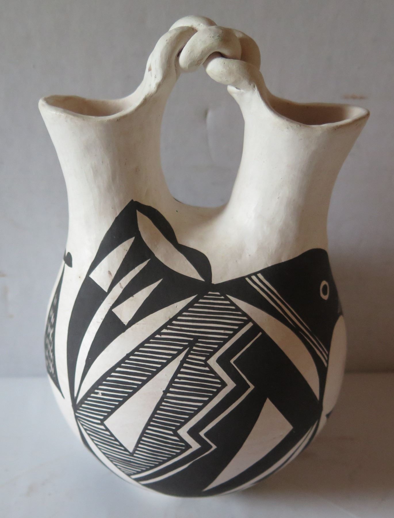 Native American Indian Acoma Wedding Vase w/ Twisted Handle, Signed M S Juanico 7.5" Tall
