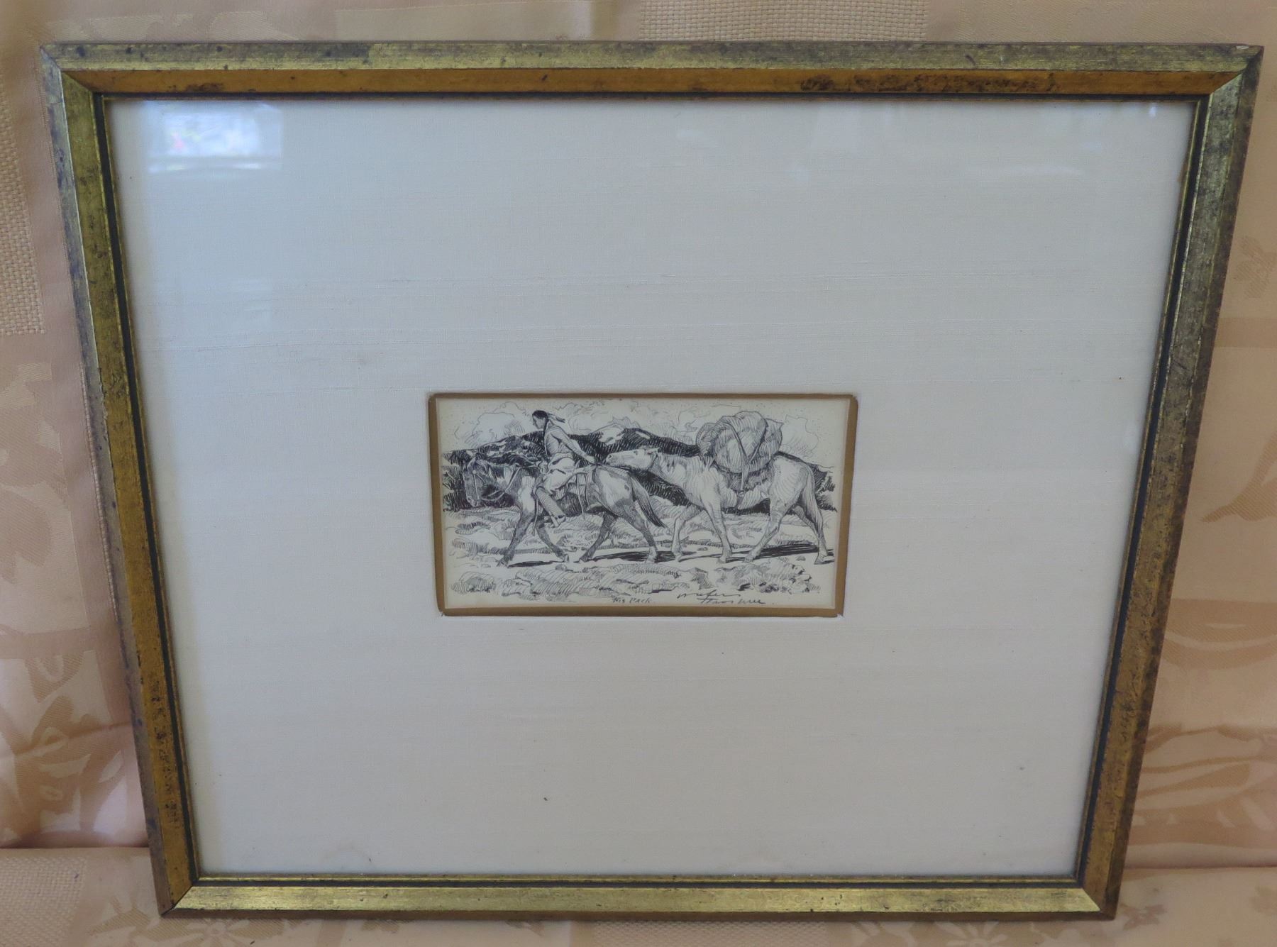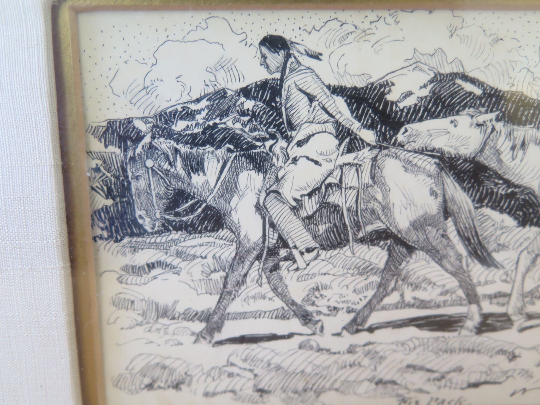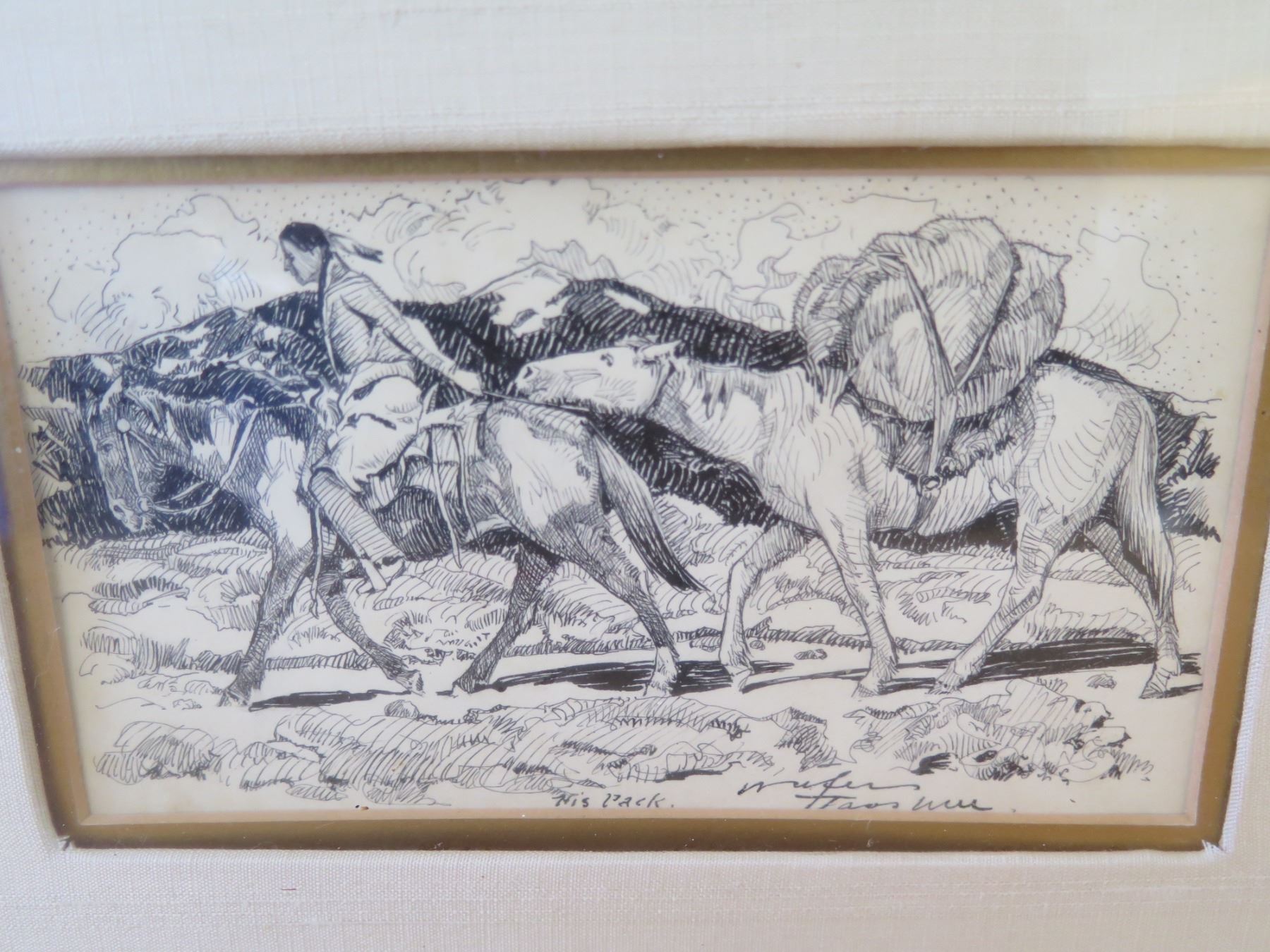 Native American on Horseback “His Pack” Pen and Ink Sketch, Signed by Artist Wafer?, Taos, NM, Framed & Matted 17"x14"