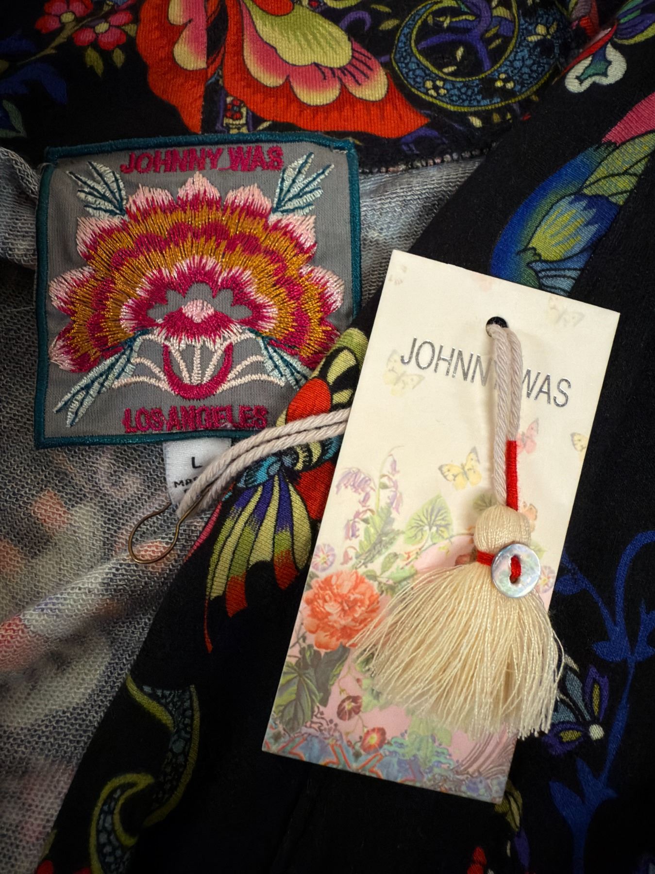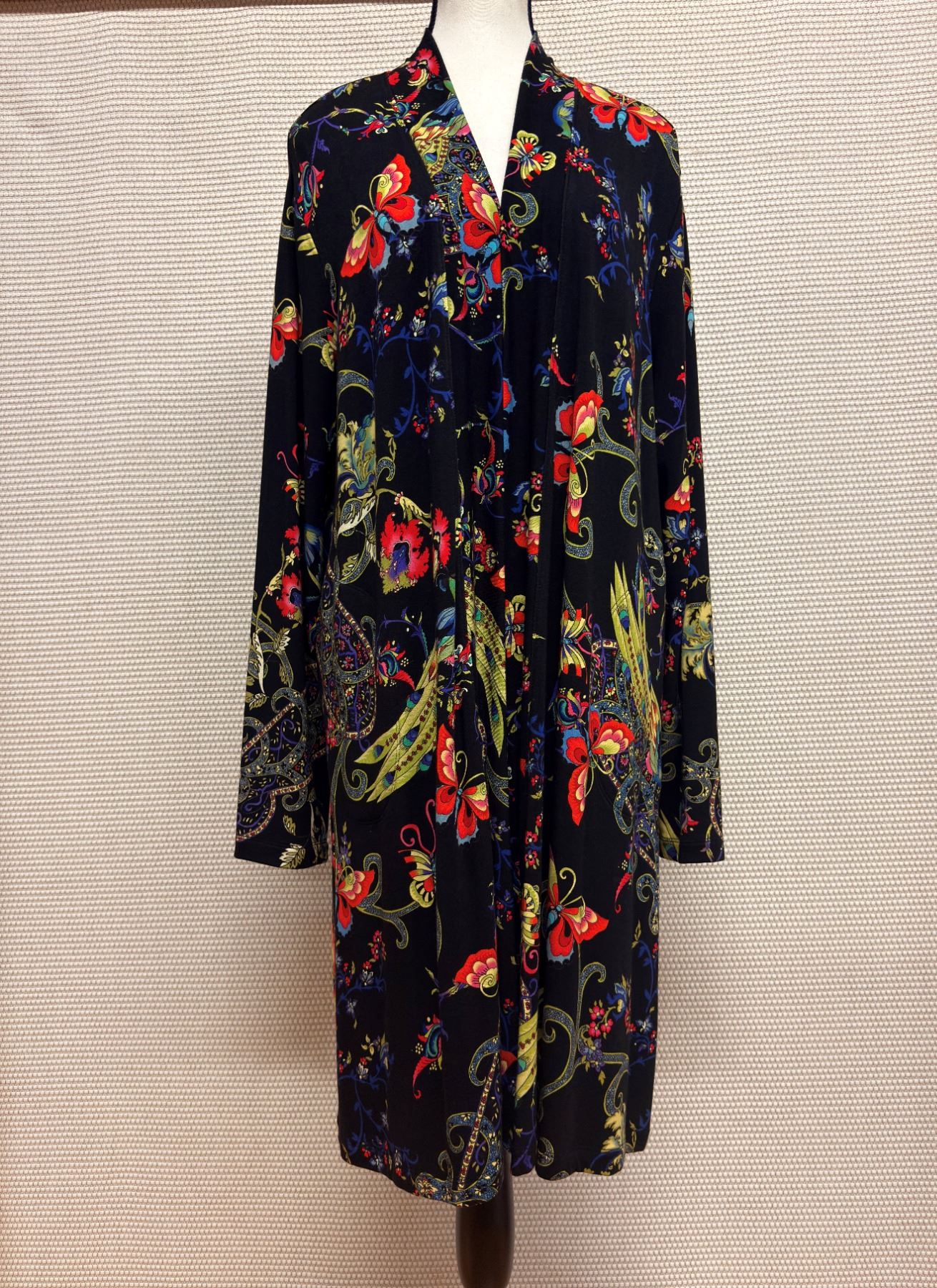 New Johnny Was Women's Black Kimono Coat w/ Butterfly Motif, Size L, 38"L