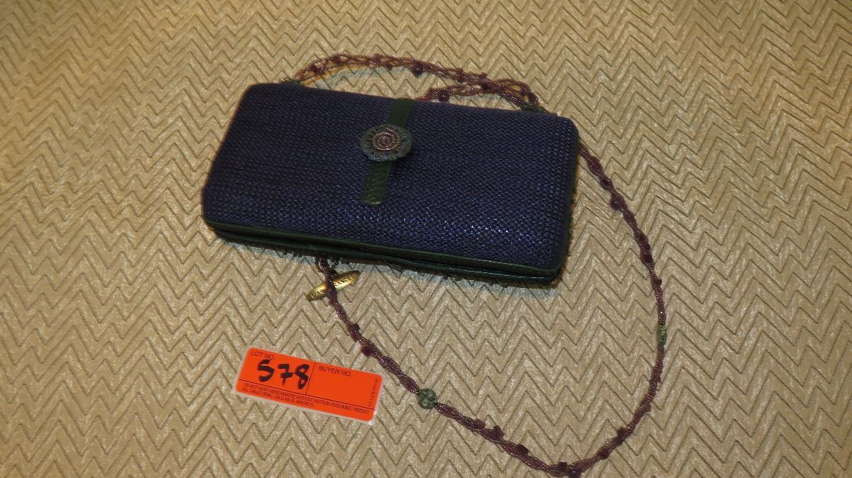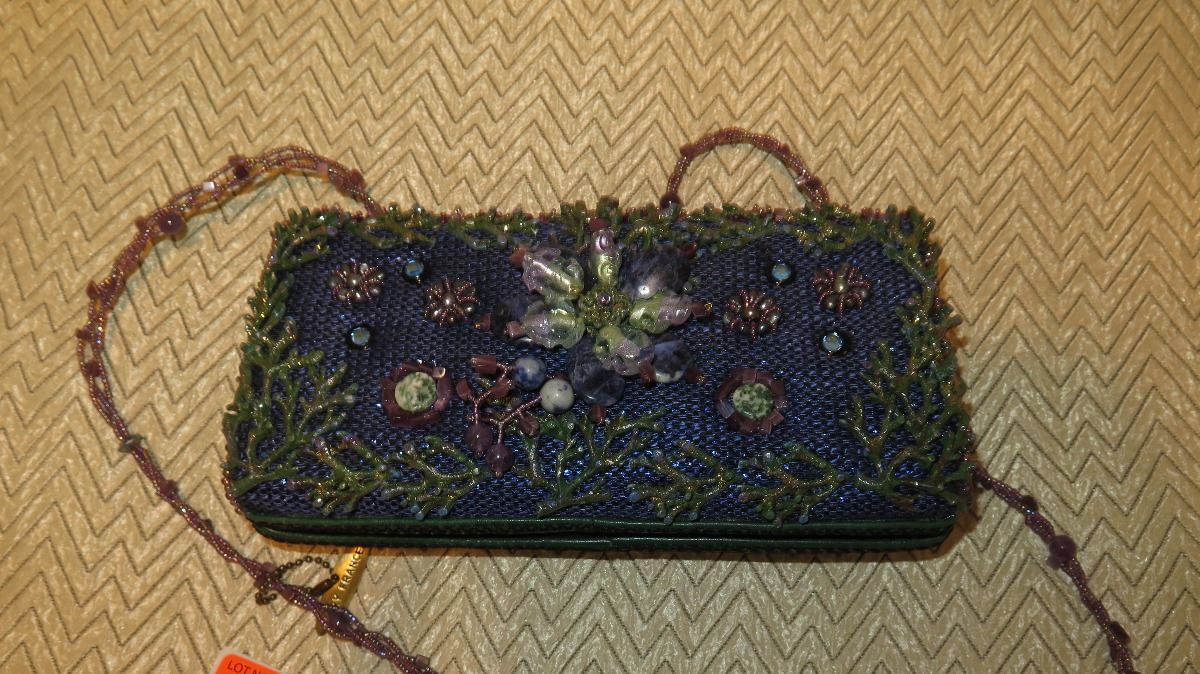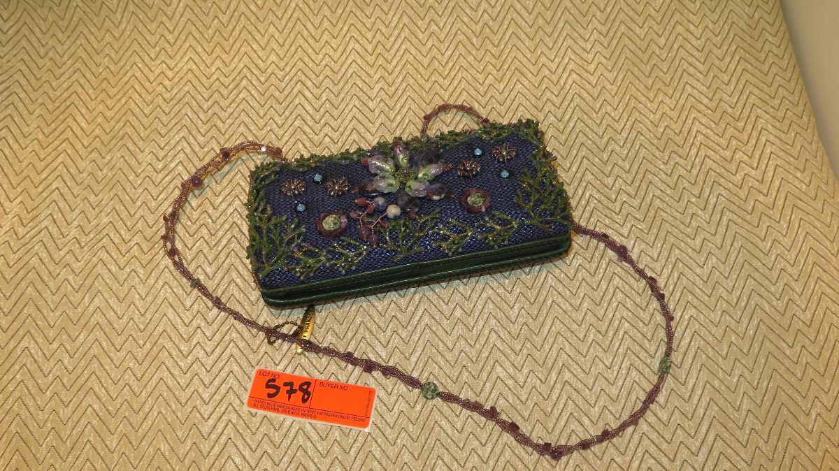 New Mary Frances Beaded Bag: Blue Mesh Clutch w/Green Ocean Coral Motif
