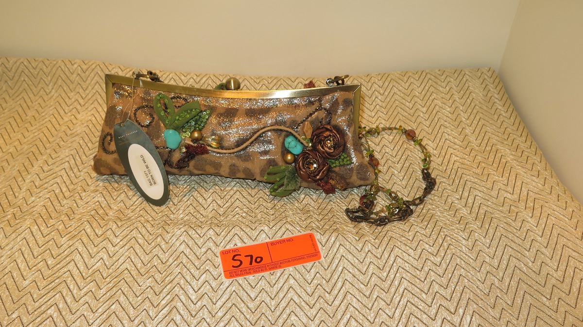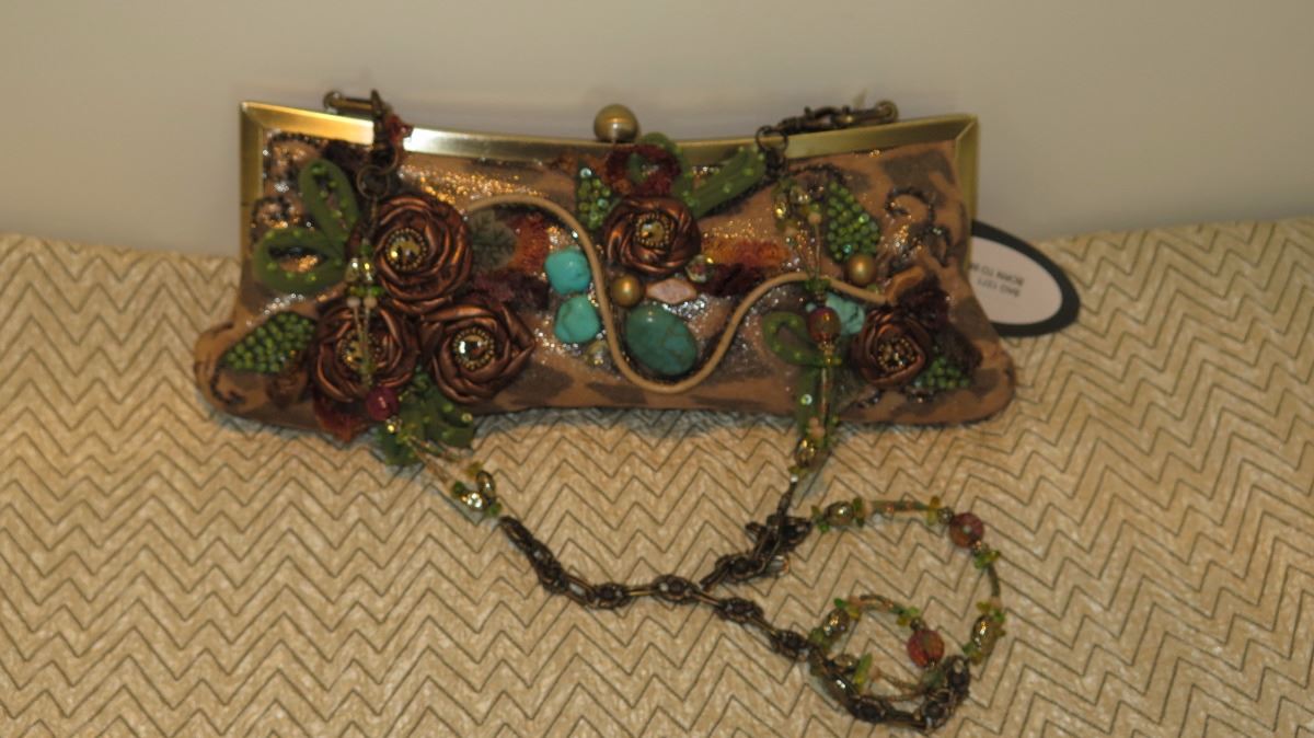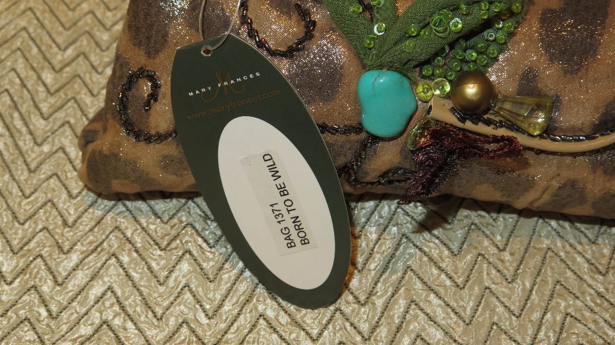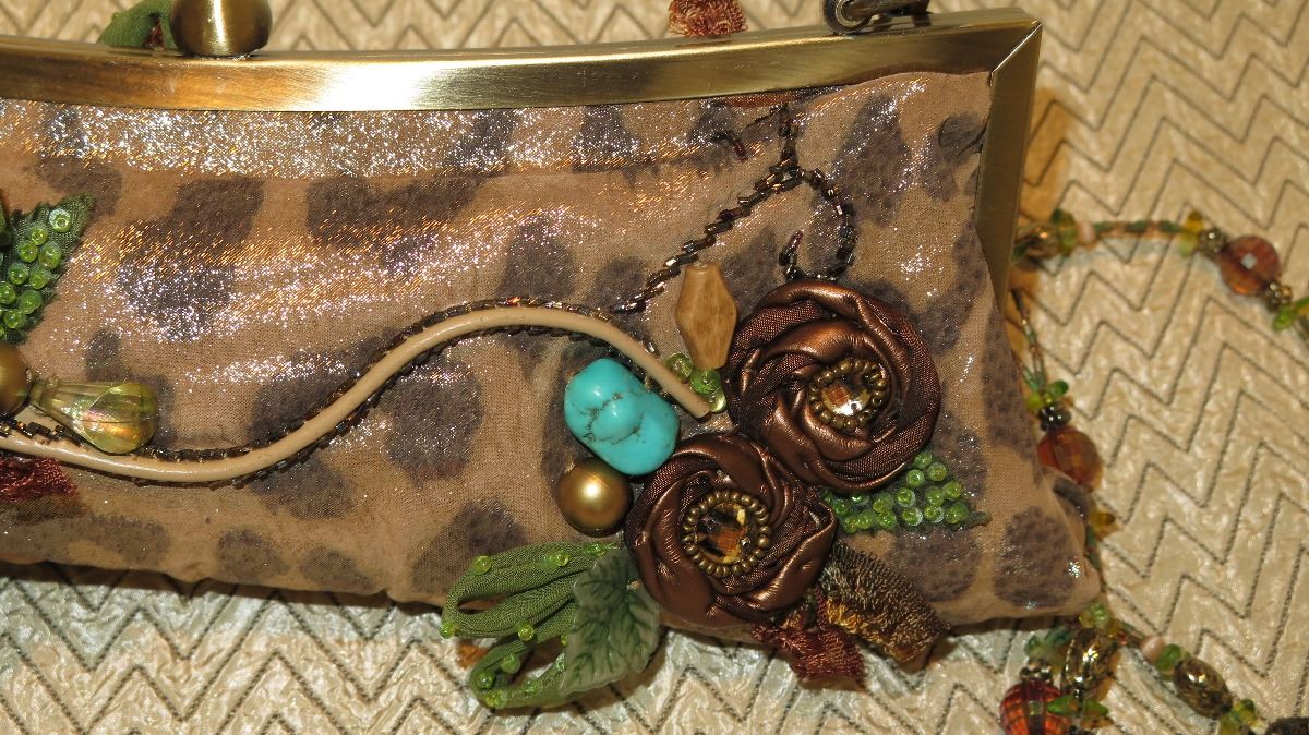 New Mary Frances Beaded Bag: "Born to Be Wild" Shimmery Leopard w/Satin Rosettes, Brass Accents