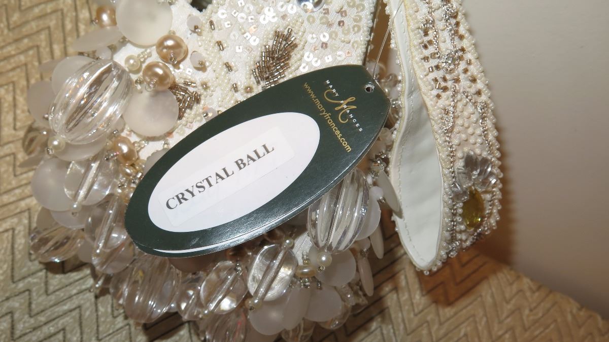 New Mary Frances Beaded Bag: "Crystal Ball" White Satin Pouch w/White Crystal Beads