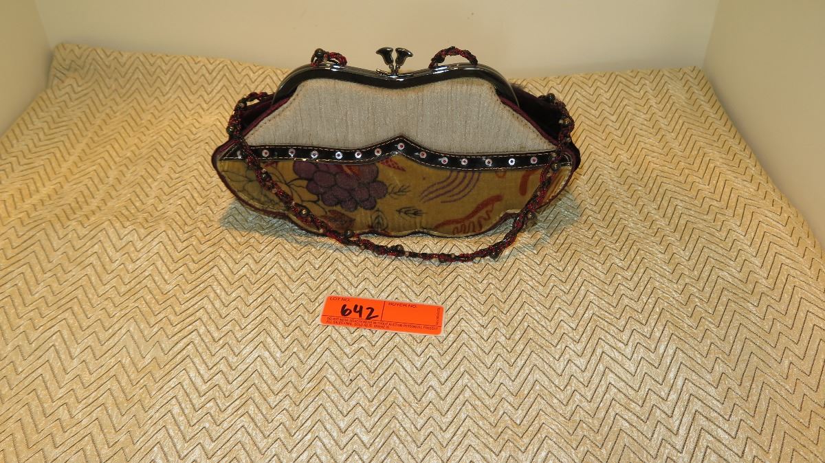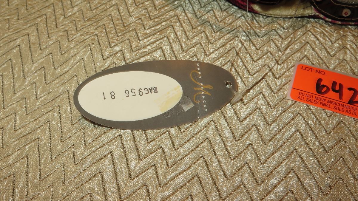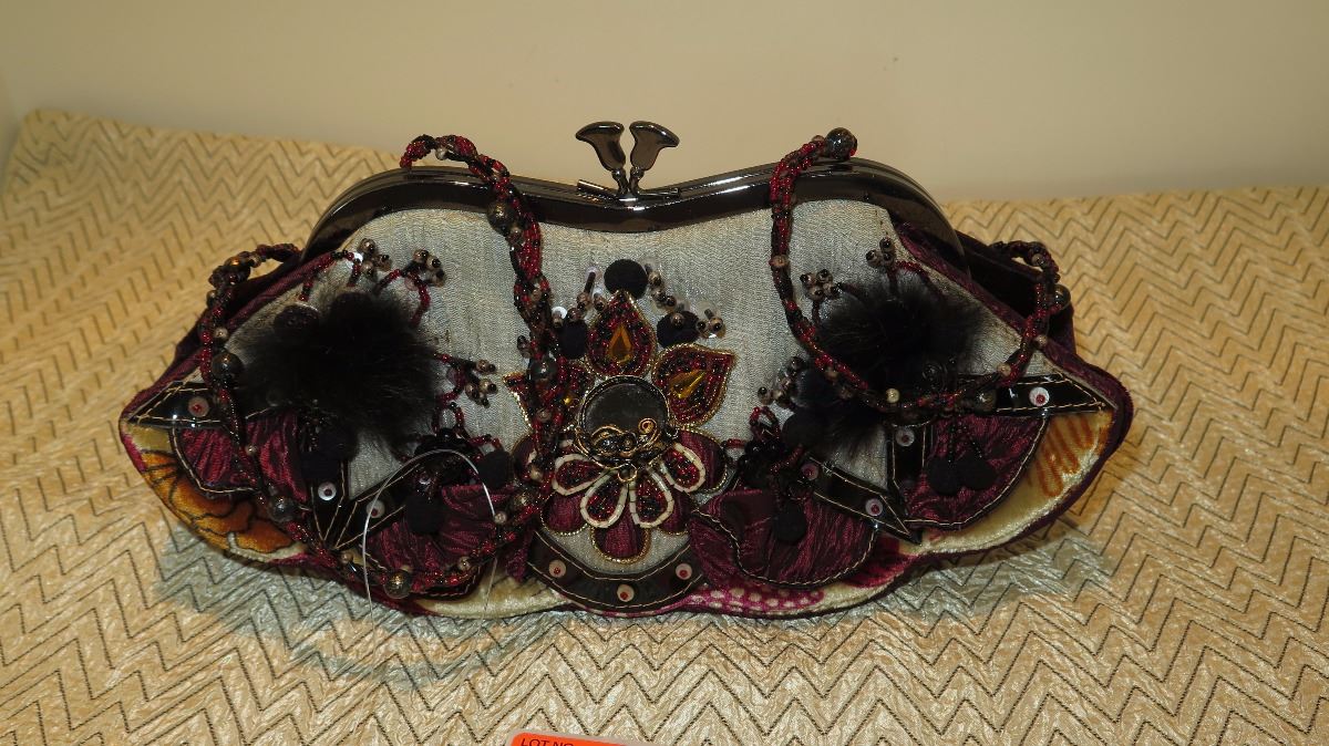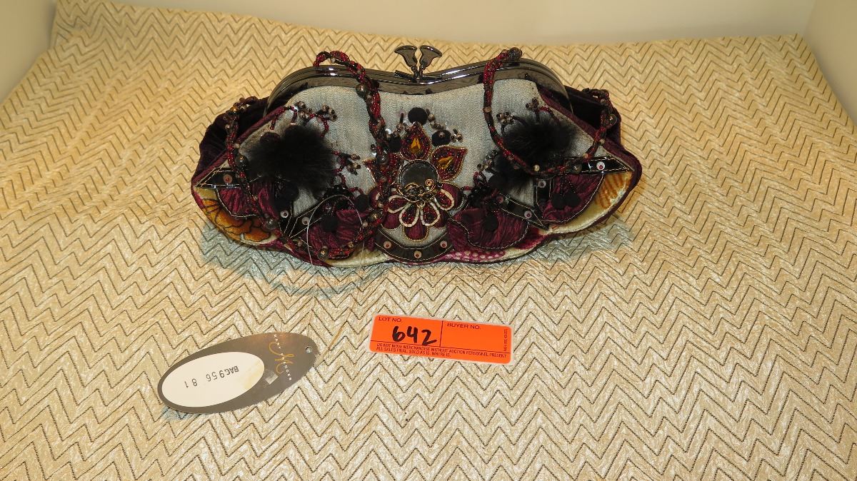 New Mary Frances Beaded Bag: Lt. Gray Fabric Clutch w/Crimson Accents
