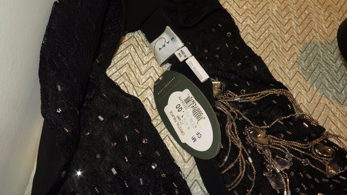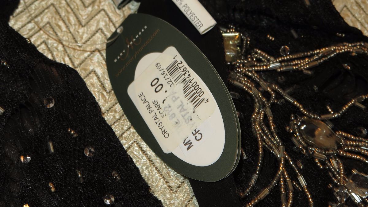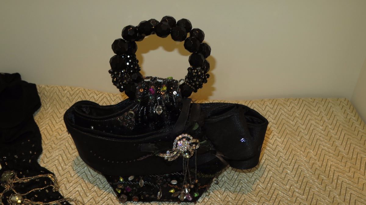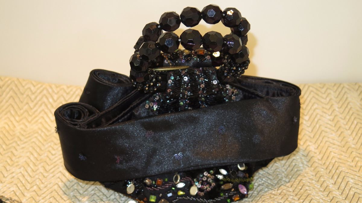 New Mary Frances Beaded Handbag: Black Satin w/Beaded Handles and Black Scarf