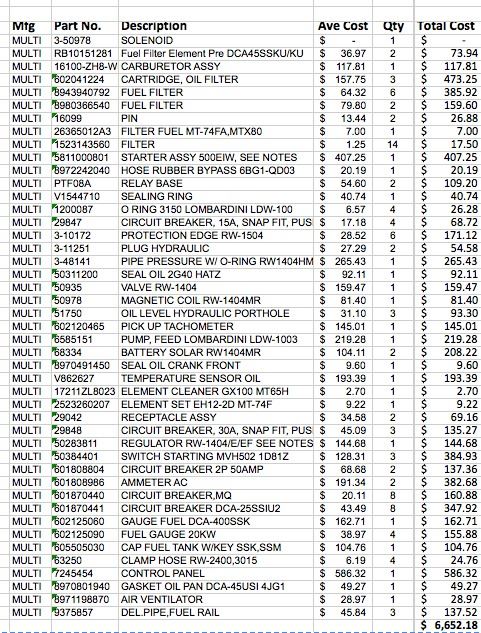 New Parts: Control Panel, Starter Assembly, Feed Pump, Oil Temp Sensor, Regulators, many more. $6652 Value. The pictures show a representative sample of what's in the box. See picture showing itemized inventory list, part numbers and quantities.