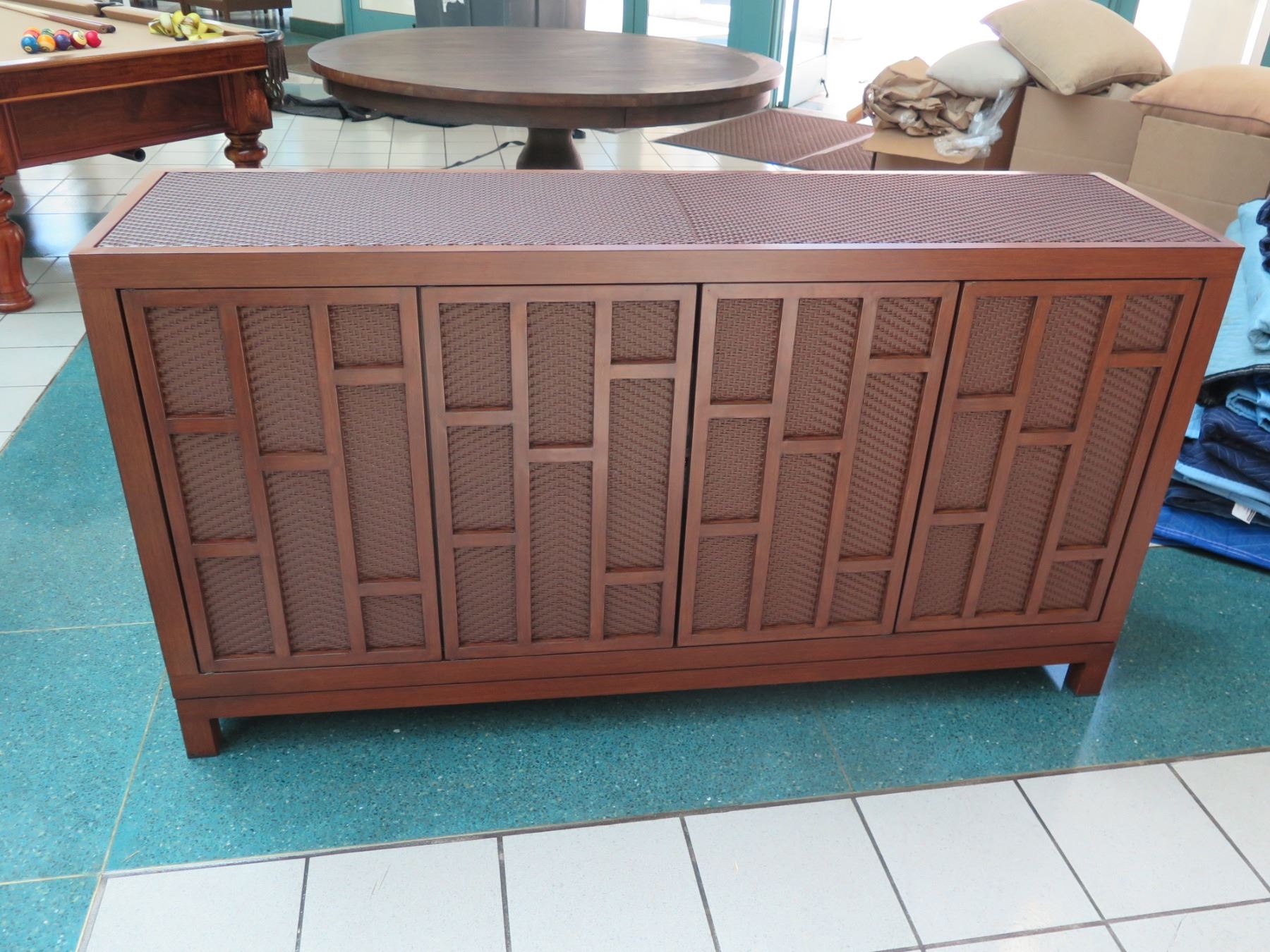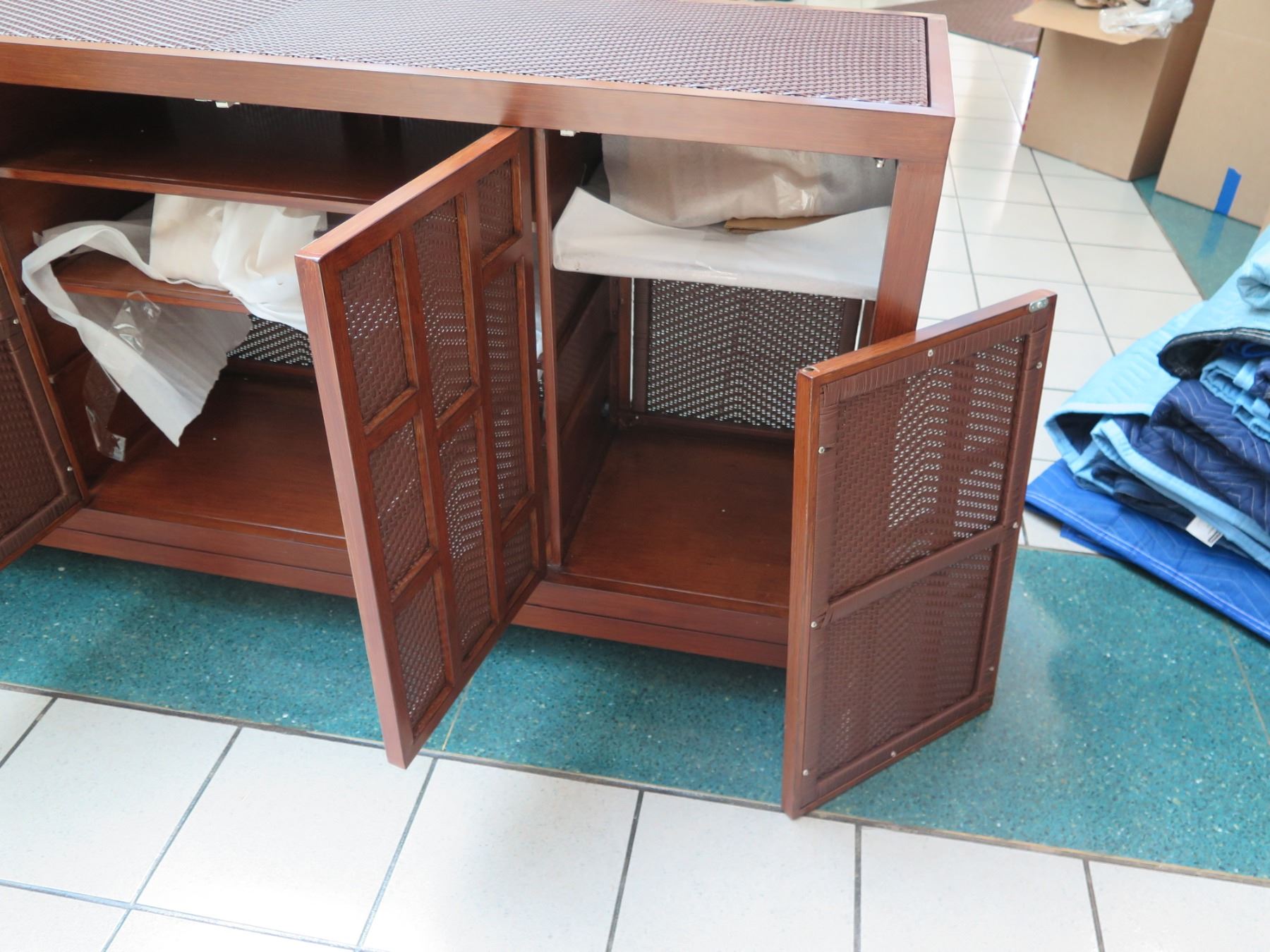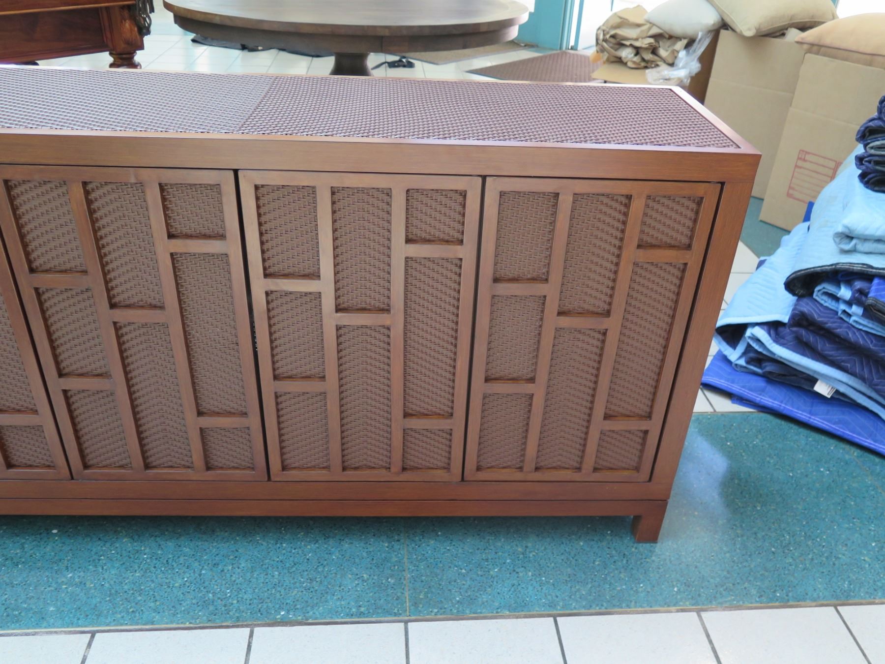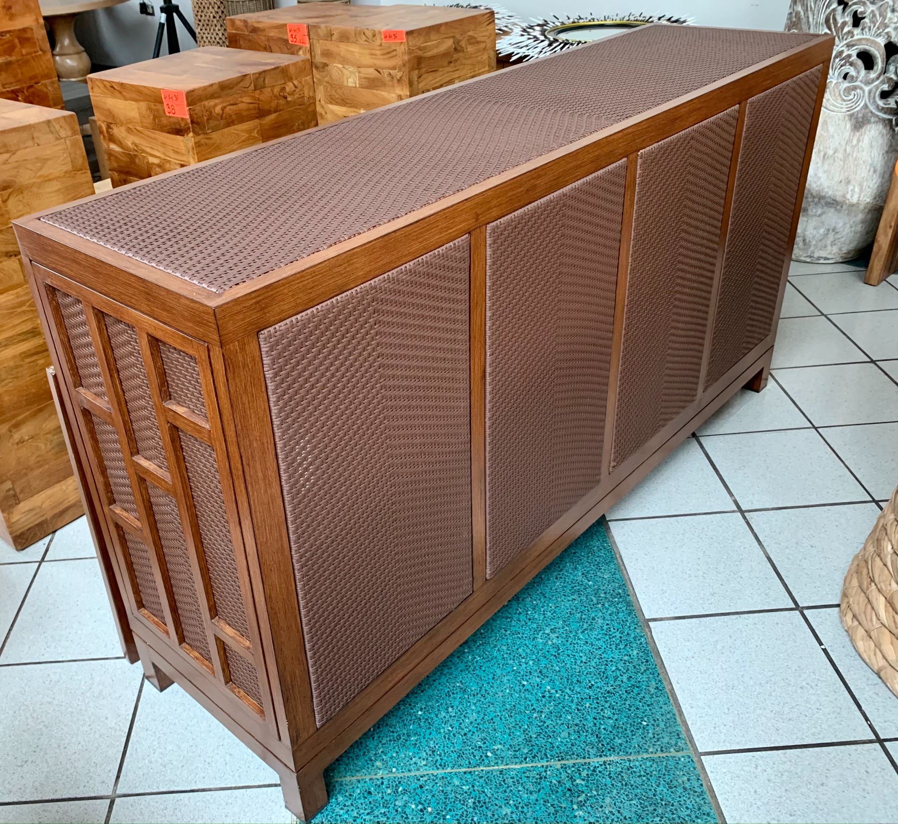 New & Unused Woven 4-Door Sideboard Cabinet 68" x 18" x 36"H. One panel door is dis-attached as shown in the second to the last photo. It stays in place in the closed position and the opened position, but comes off if you attempt to swing it outward or inward. Was just unpacked from manufacturer's box & packaging when it arrived to Honolulu from Lanai. It was never put to use.