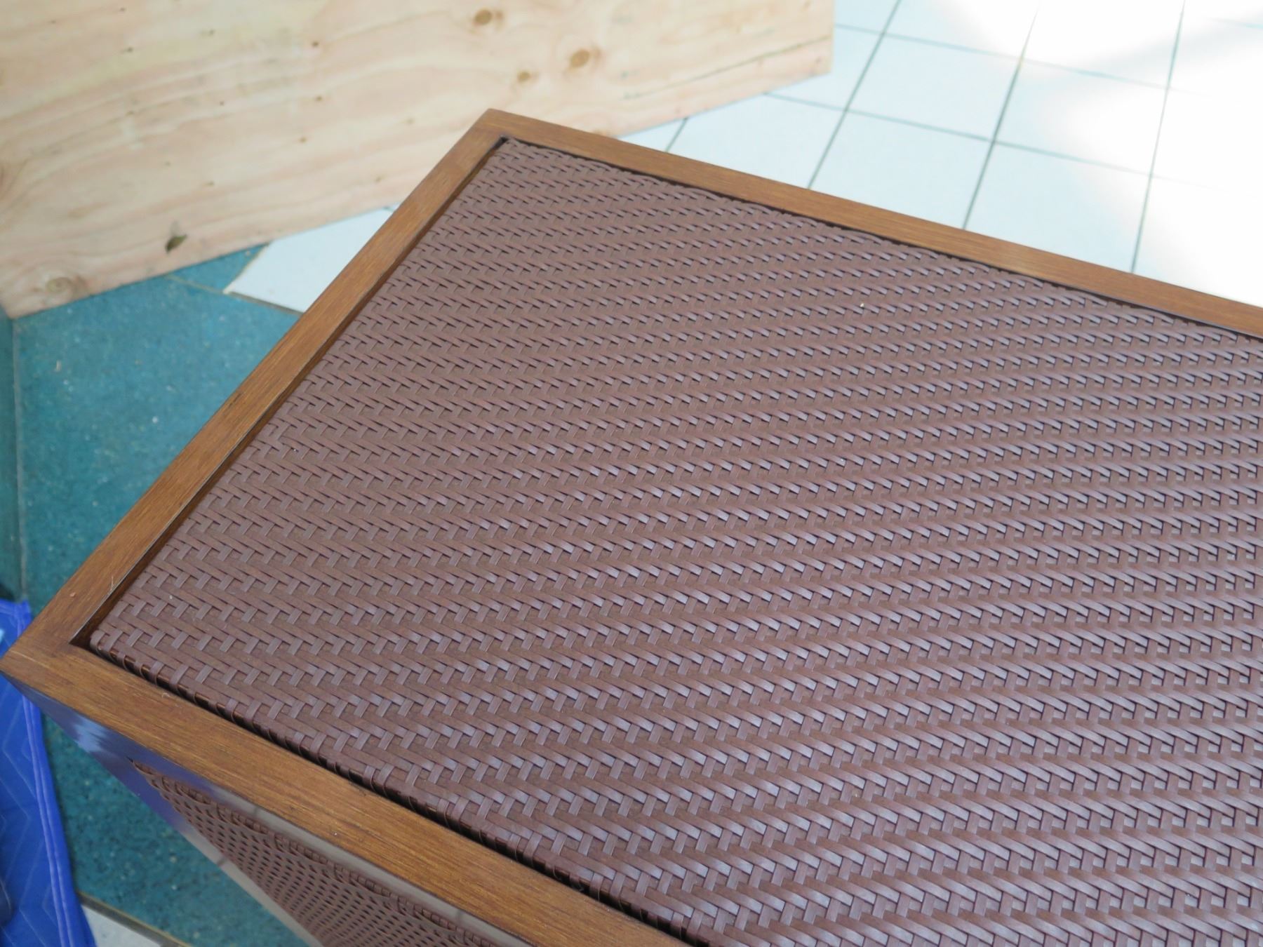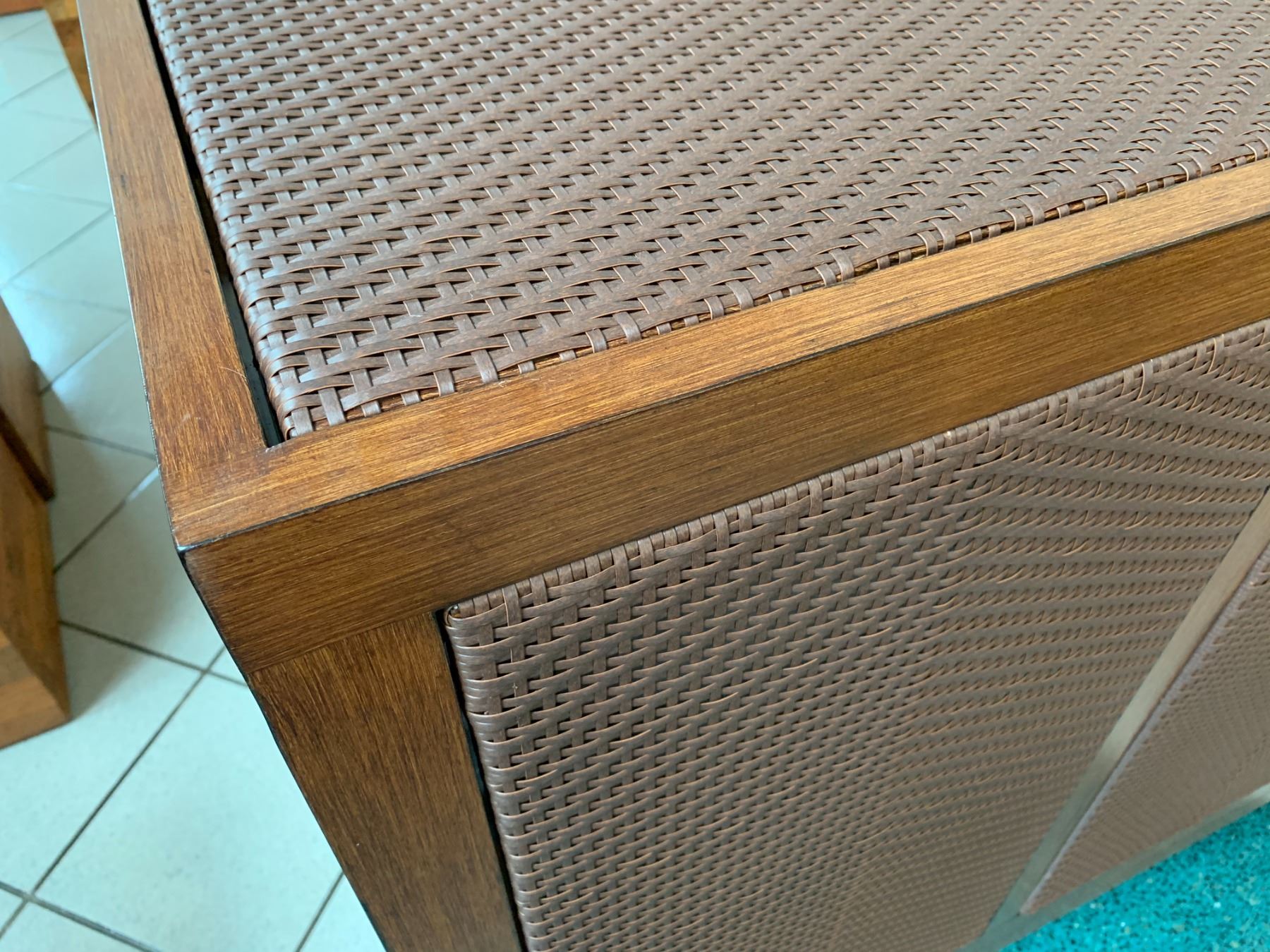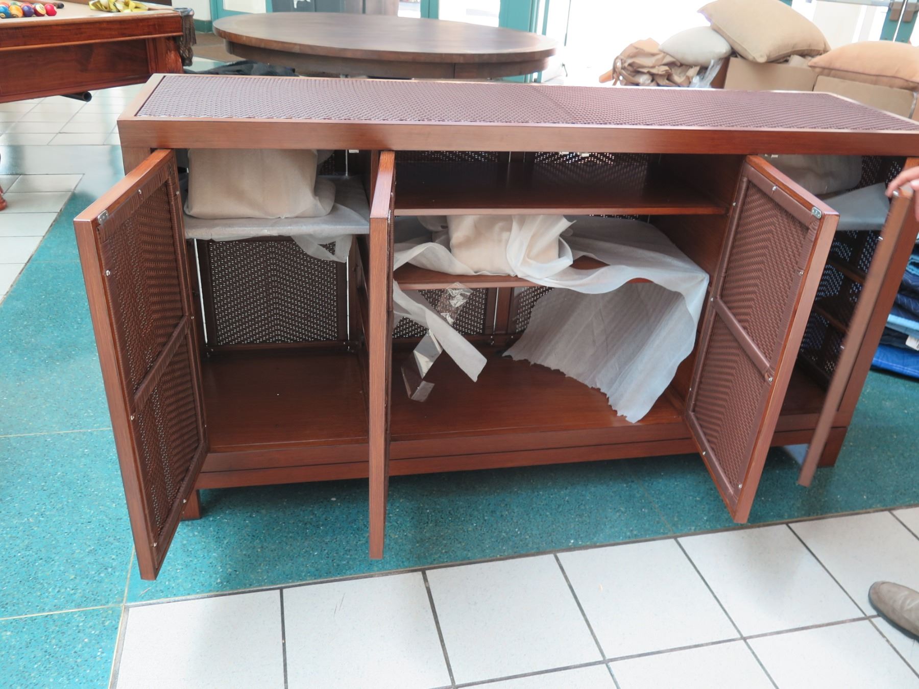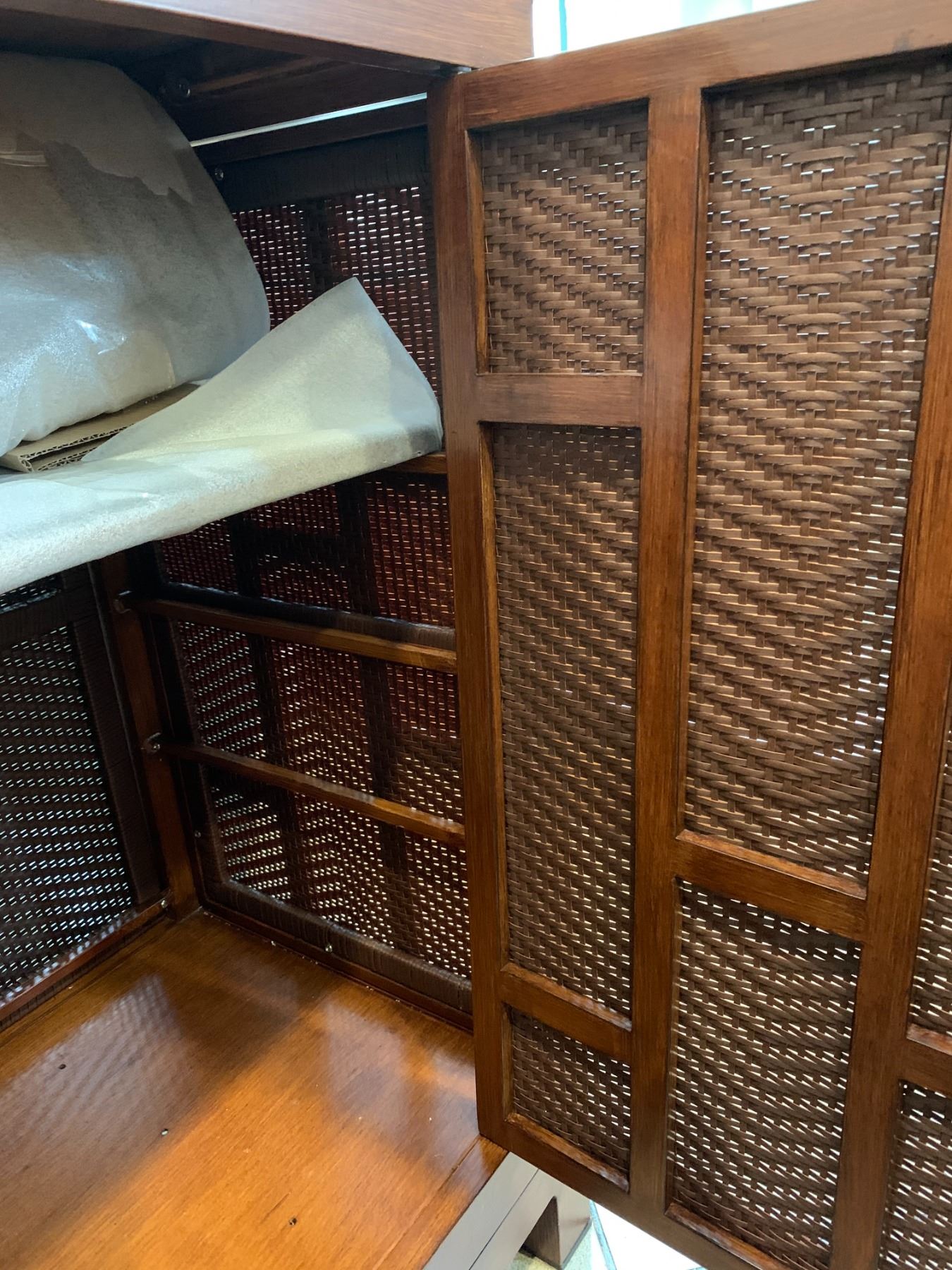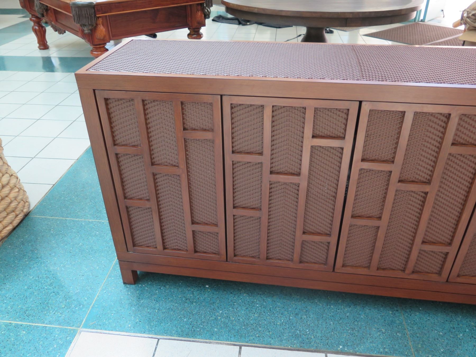 New & Unused Woven 4-Door Sideboard Cabinet 68" x 18" x 36"H. One panel door is dis-attached as shown in the second to the last photo. It stays in place in the closed position and the opened position, but comes off if you attempt to swing it outward or inward. Was just unpacked from manufacturer's box & packaging when it arrived to Honolulu from Lanai. It was never put to use.