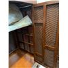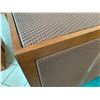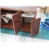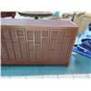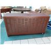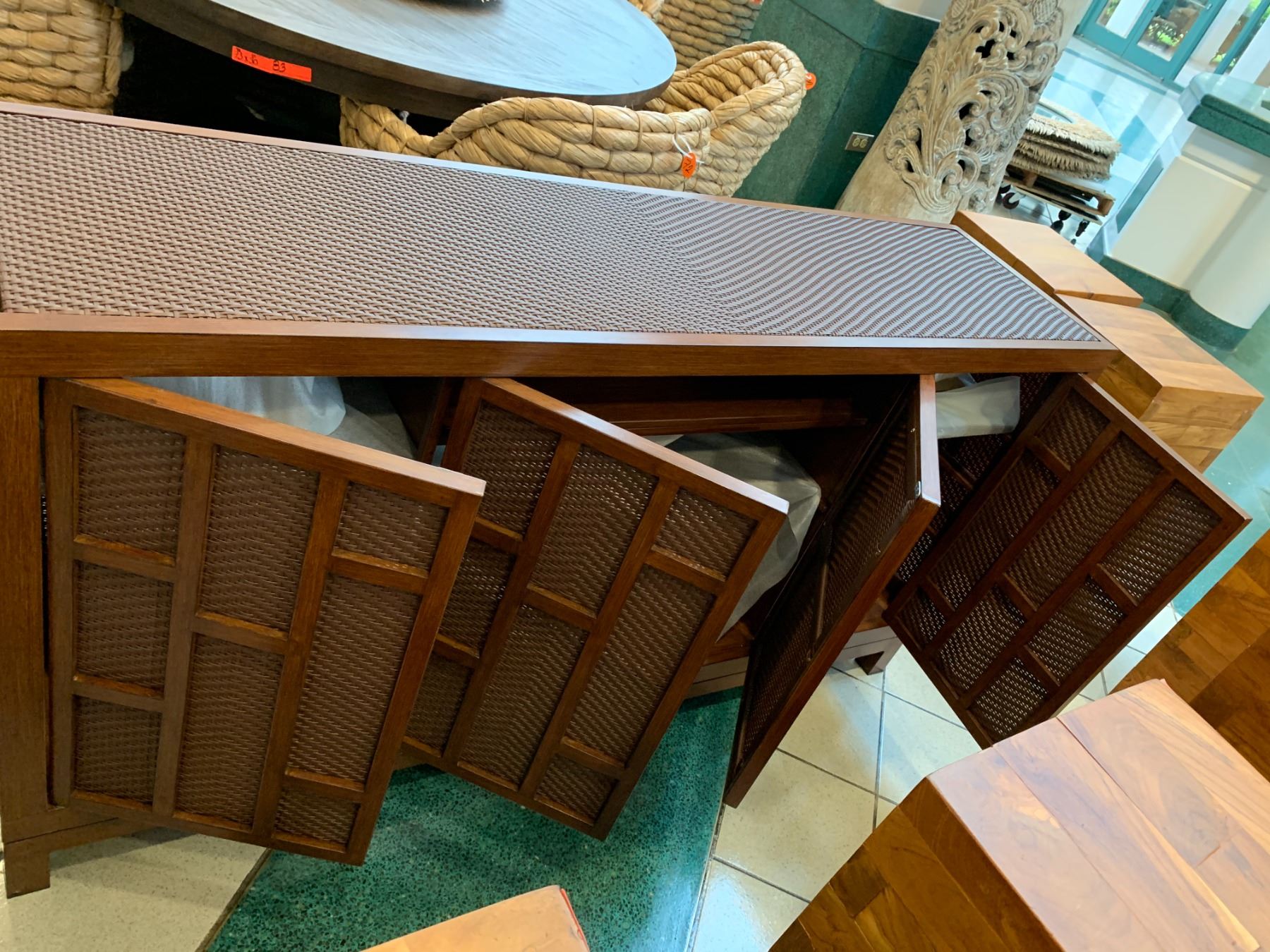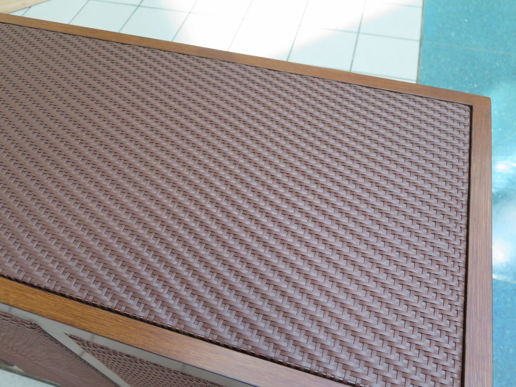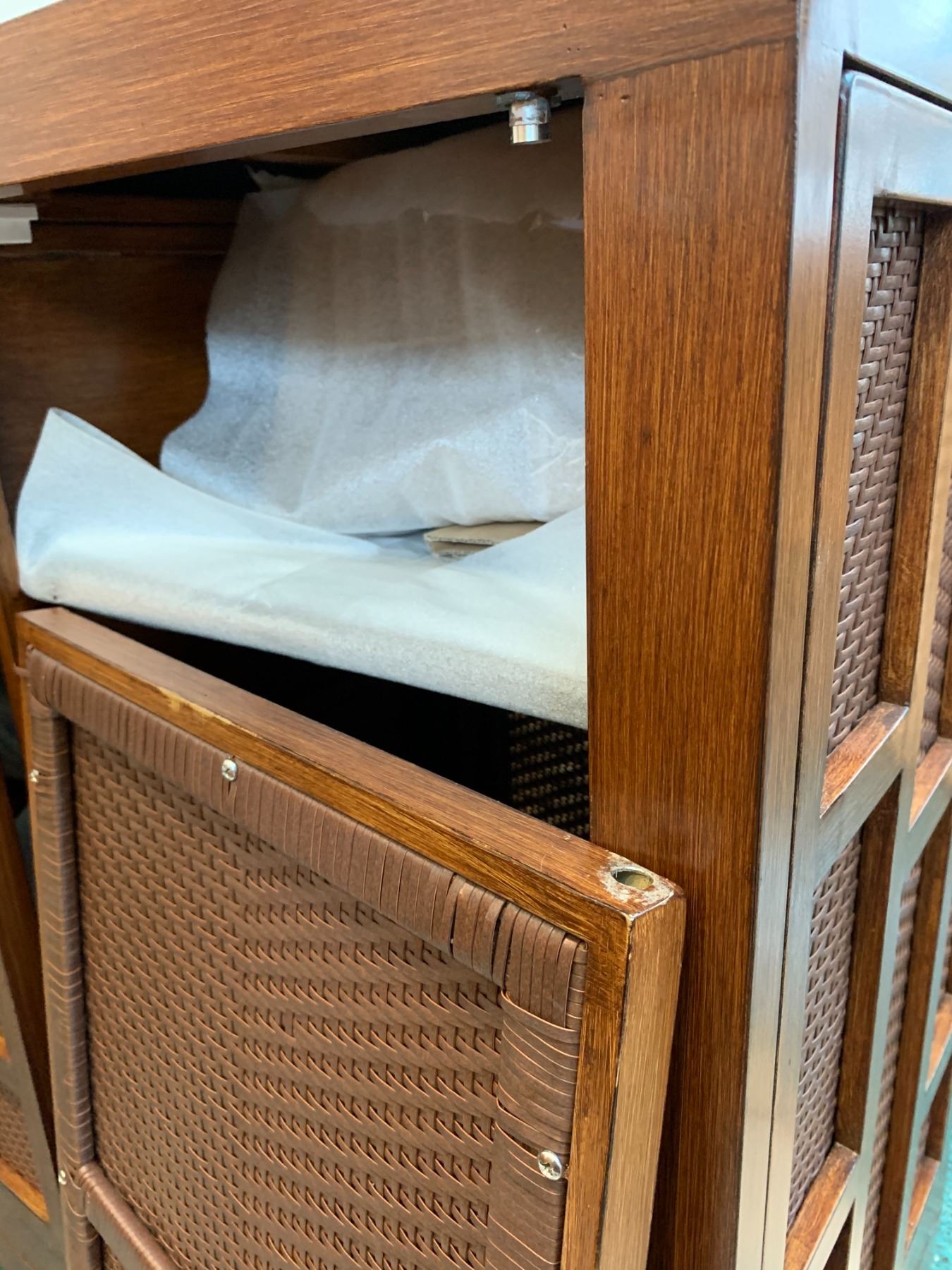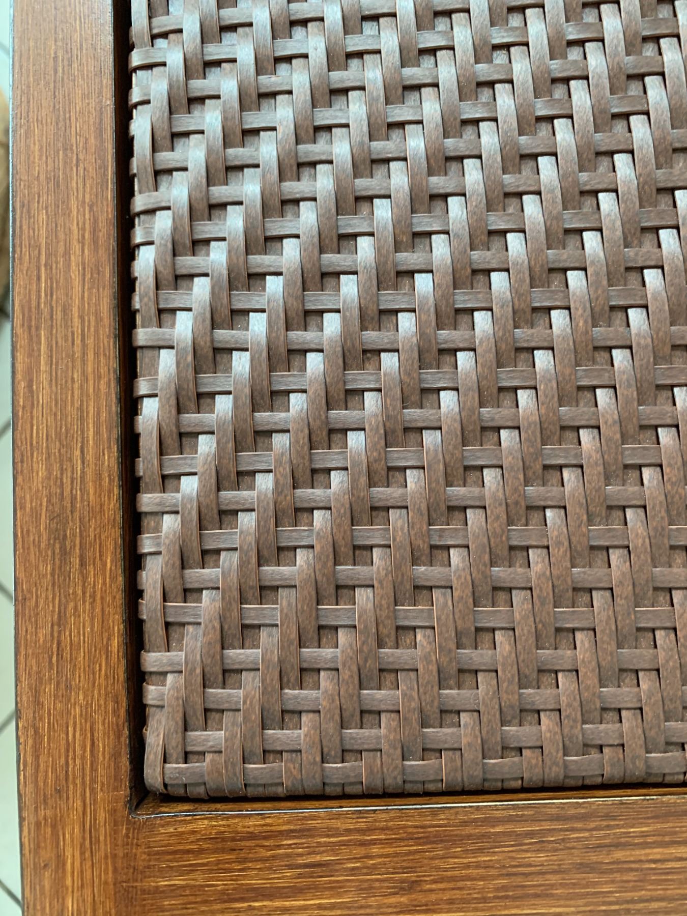 New & Unused Woven 4-Door Sideboard Cabinet 68" x 18" x 36"H. One panel door is dis-attached as shown in the second to the last photo. It stays in place in the closed position and the opened position, but comes off if you attempt to swing it outward or inward. Was just unpacked from manufacturer's box & packaging when it arrived to Honolulu from Lanai. It was never put to use.