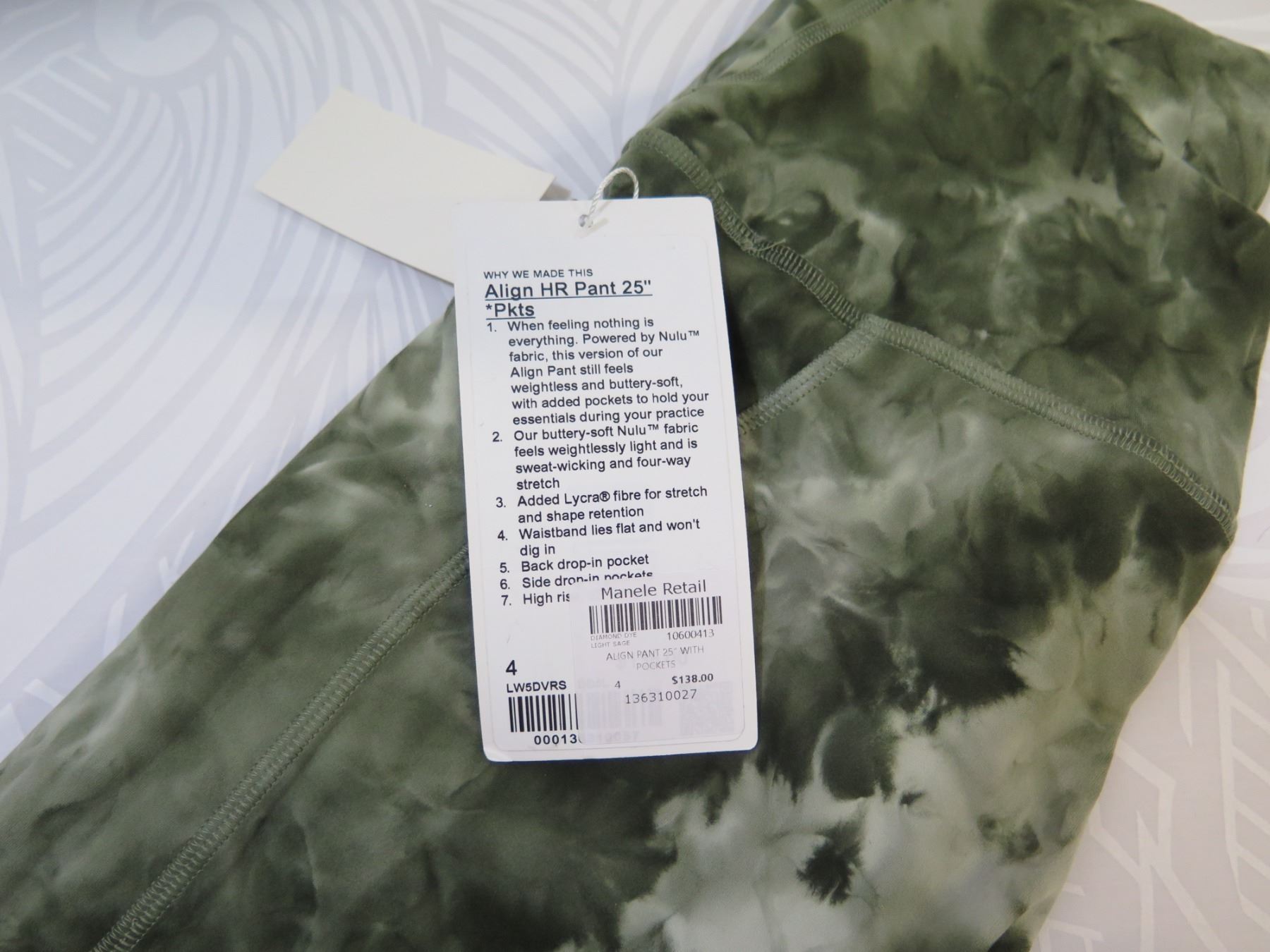New lululemon Align High Rise 25" Pants w/ Pockets, Diamond Dye Lt. Sage, Size 4. New with tags. Resort retail $138.