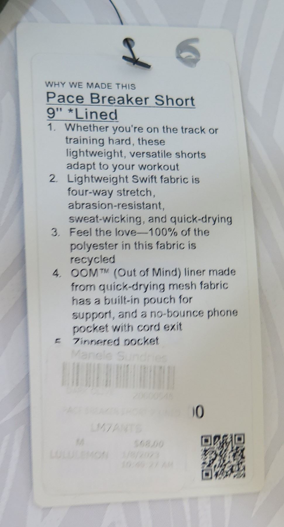New lululemon LM7ANTS Men's Pace Breaker Short 9" Lined, Size Medium. New with tags. Resort retail $68.