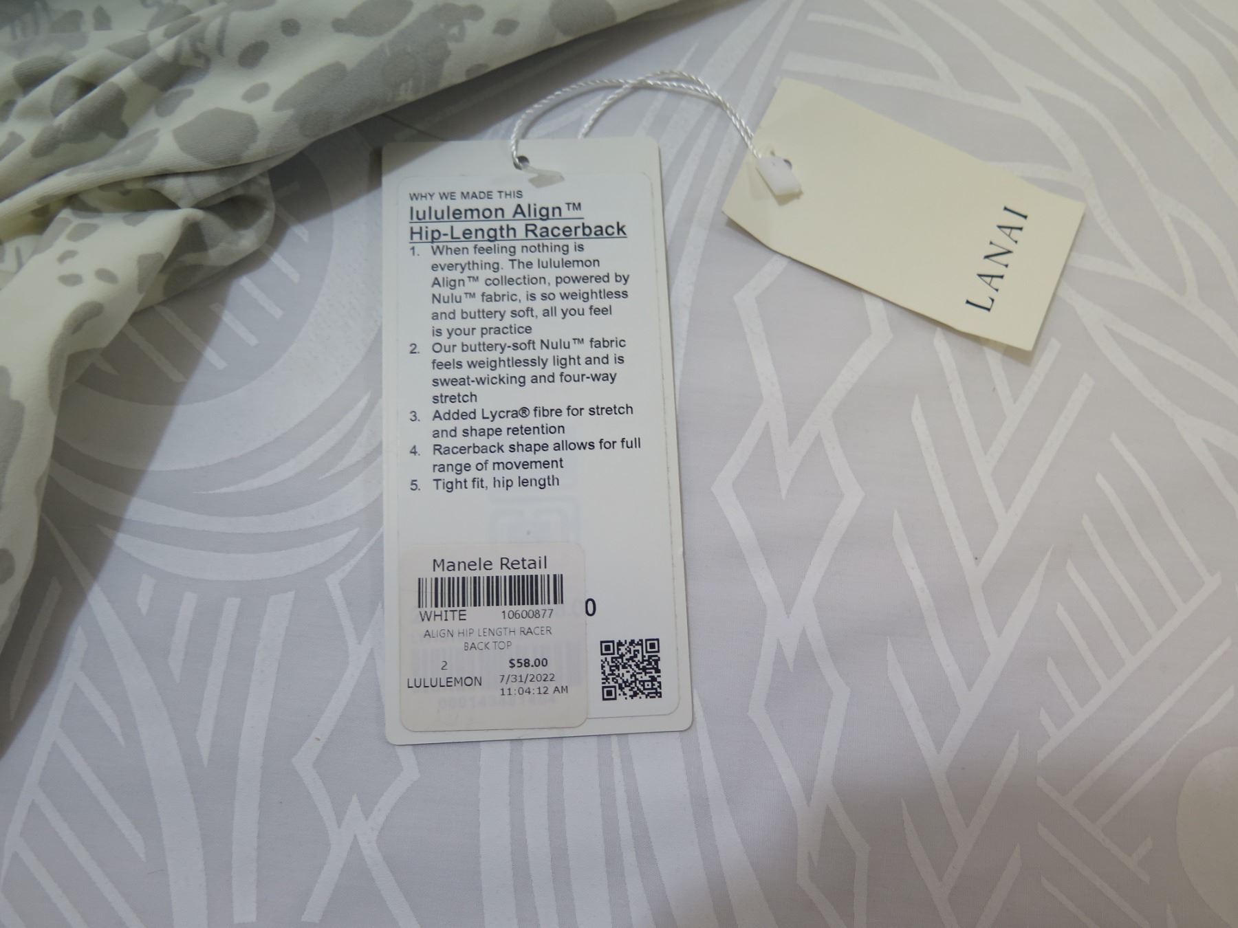 New lululemon Women's Align Hip-Length Racerback Tank, White, Size 2. New with tags. Resort retail $58.