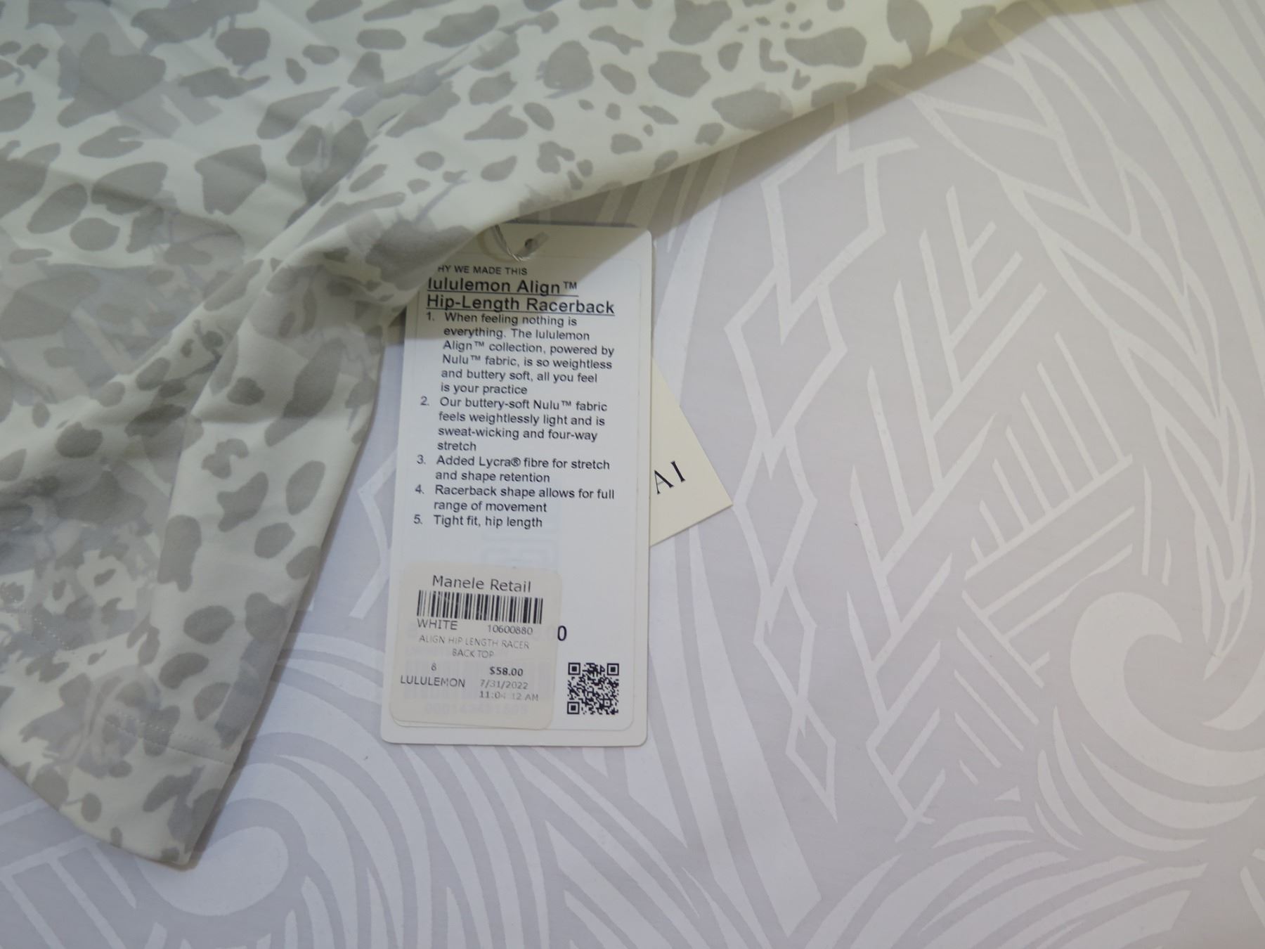 From a retail shop at a five-star resort. A new entity recently moved into the space and implemented its own retail concept. All remaining floor and stockroom inventories were sent to Oahu Auctions. Everything is new with tags. Most of these are still on the Lululemon website. The price tag shown is "resort retail," which is what these were priced at in this retail establishment. In some cases, we include a link to the brand's website for further context and illustration.