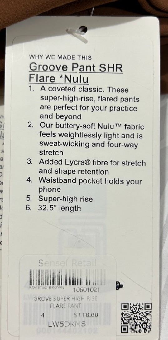 New lululemon LW5DKMS Women's Groove Pant SHR Super High Rise Flare Nulu, Roasted Brown, Size 4. New with tags. Resort retail $118.
