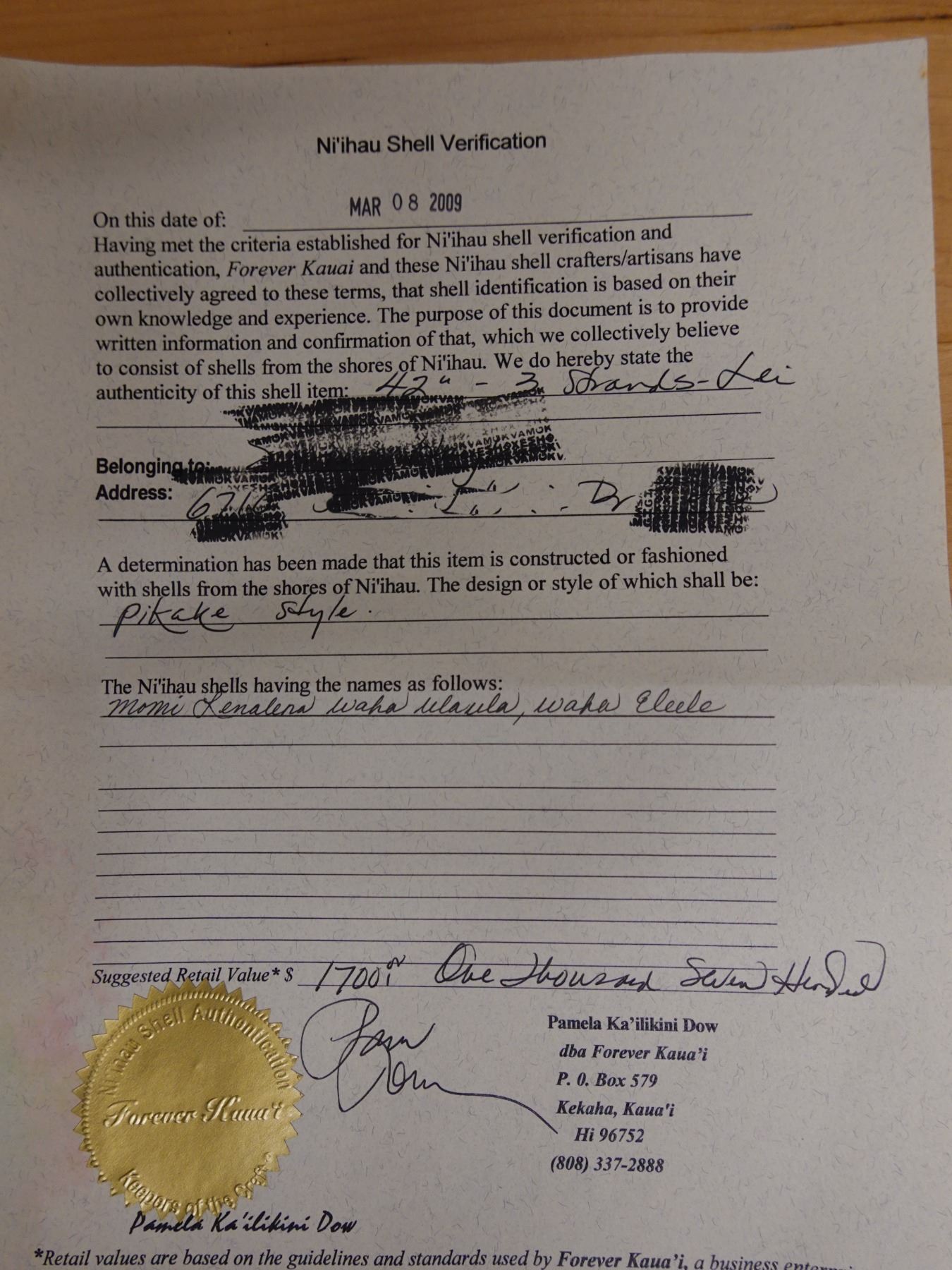 Niihau Triple-Strand Maunaloa Style Shell Lei w/ COA 42"L