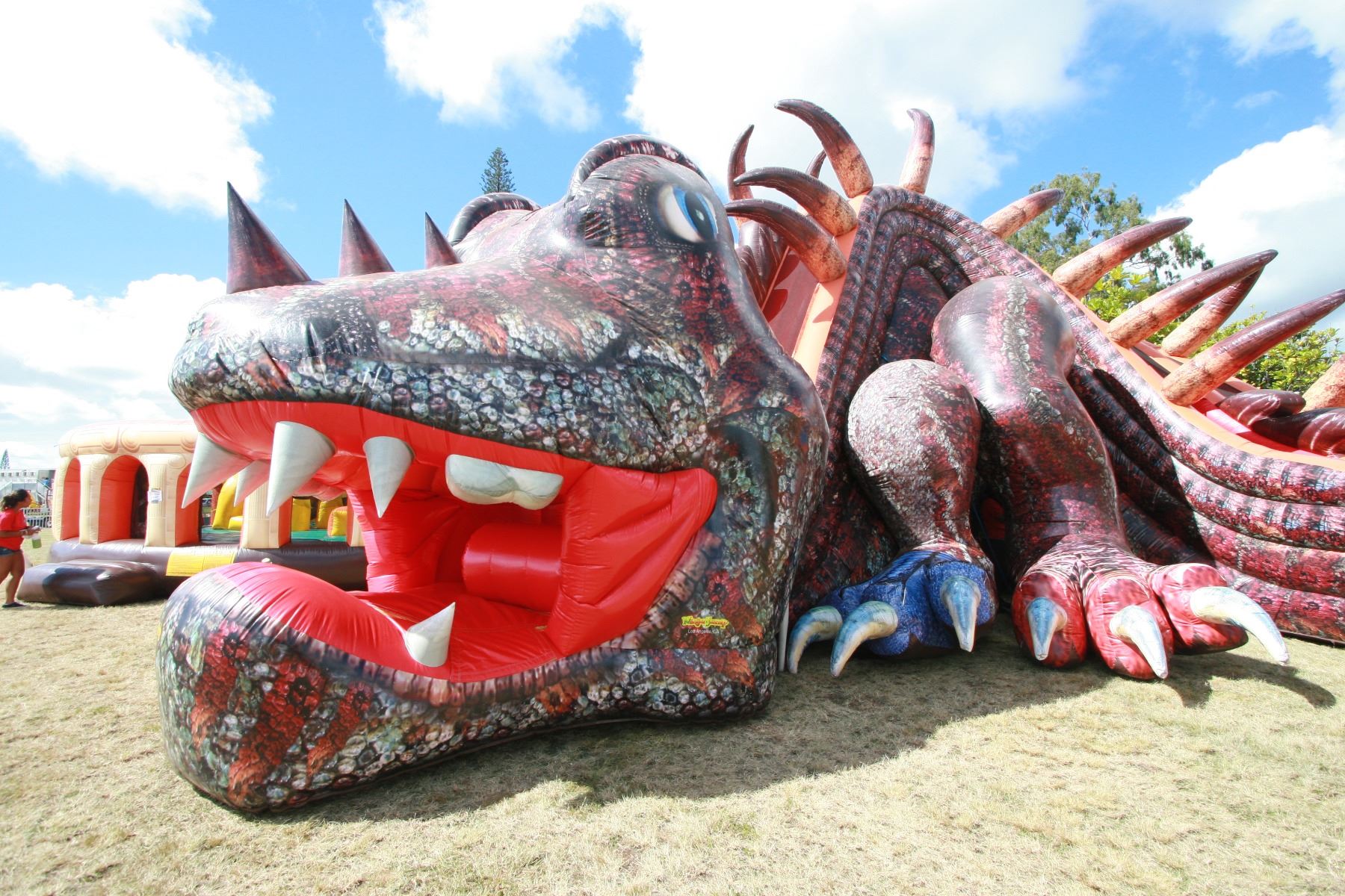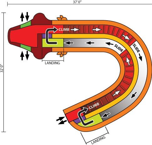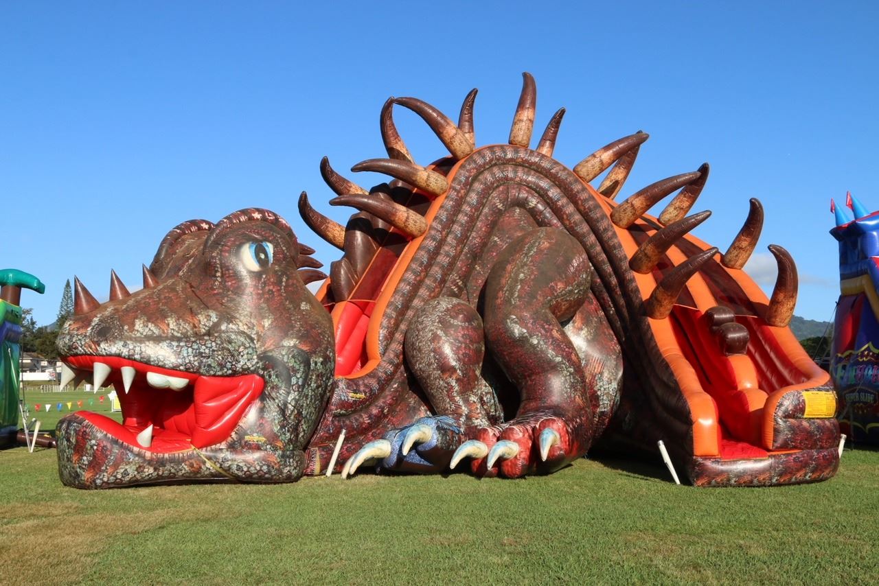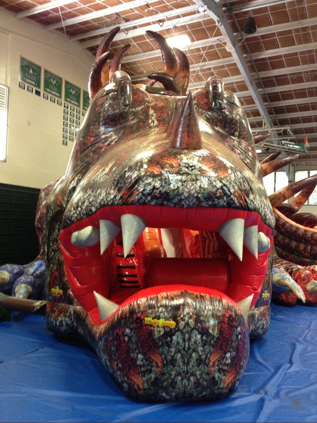 Ninjasaur Inflatable Slide. Comes in 2 pieces. The. 180-degree slide allows the journey to continue; participants can then climb back up the curving dino tail and enjoy a straight slide down through the dinosaur's mouth. This provides a 190 feet of continuous climb and slide thrill on a single full run. Dimensions: Length: 37' Width: 32' Height: 28'6" Weight 1021 lbs