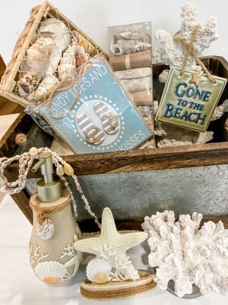 Ocean Inspired Bath Décor: Tin Basket, Coral-Like Accent Decor, Shells, Potpourri, Garland, etc