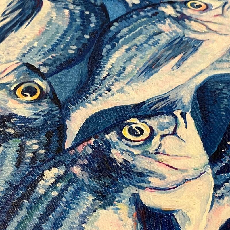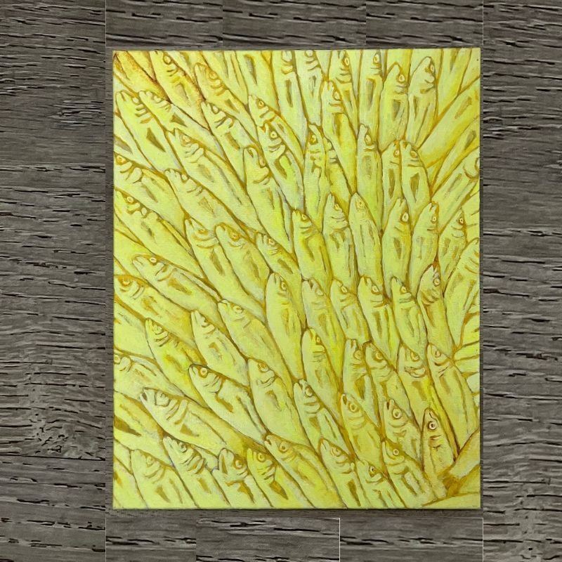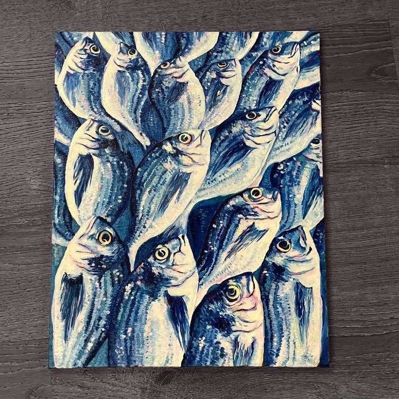 Two art pieces that measure 20” x 16”, water-mixable oil paintings on canvas: Blue Shoaling and Yellow Tail (2023, autographed).