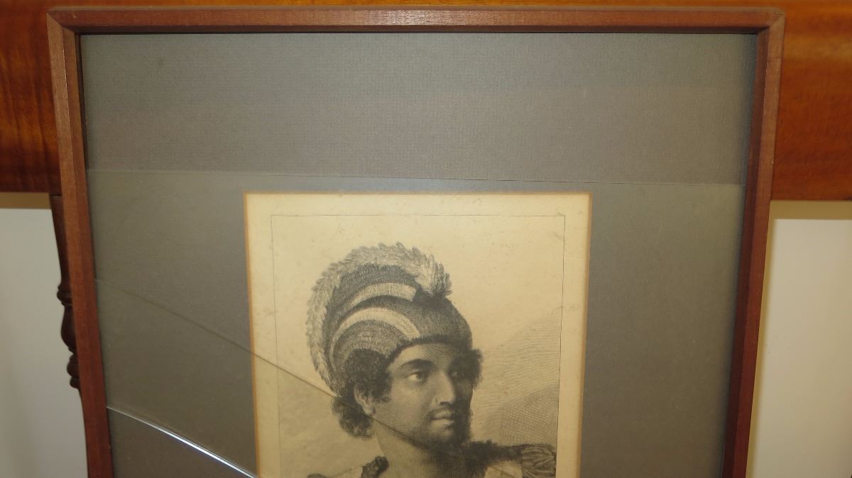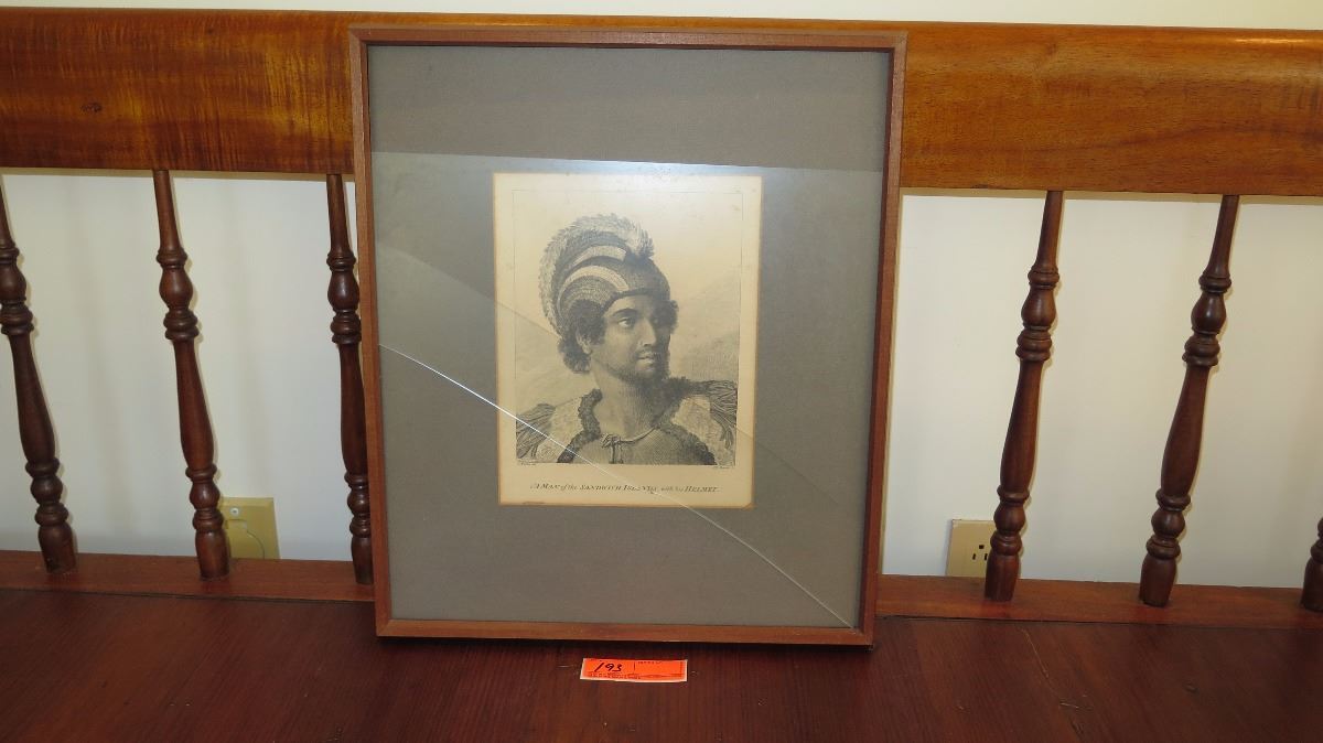 Old Framed Etching: "A Man of the Sandwich Islands" - After J. Webber (glass broken) 17X20