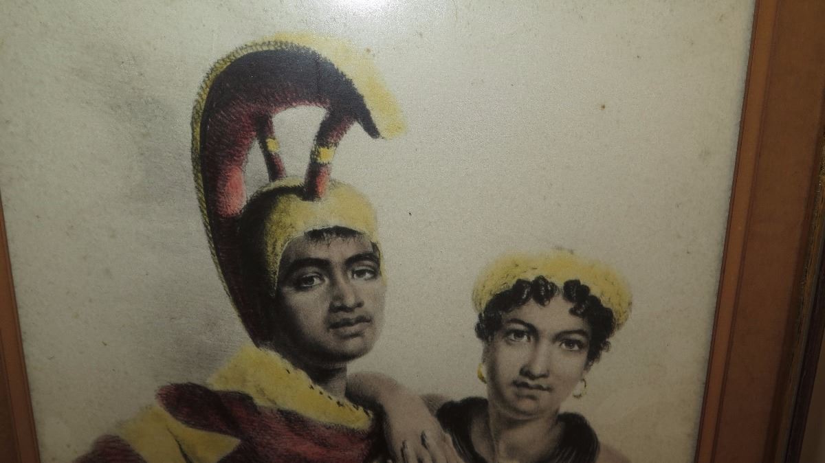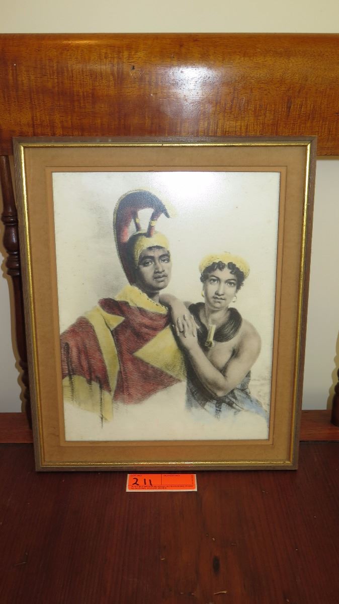 Old Framed Print: Hawaiian Royalty w/Feather Cloak & Helmet 16X14