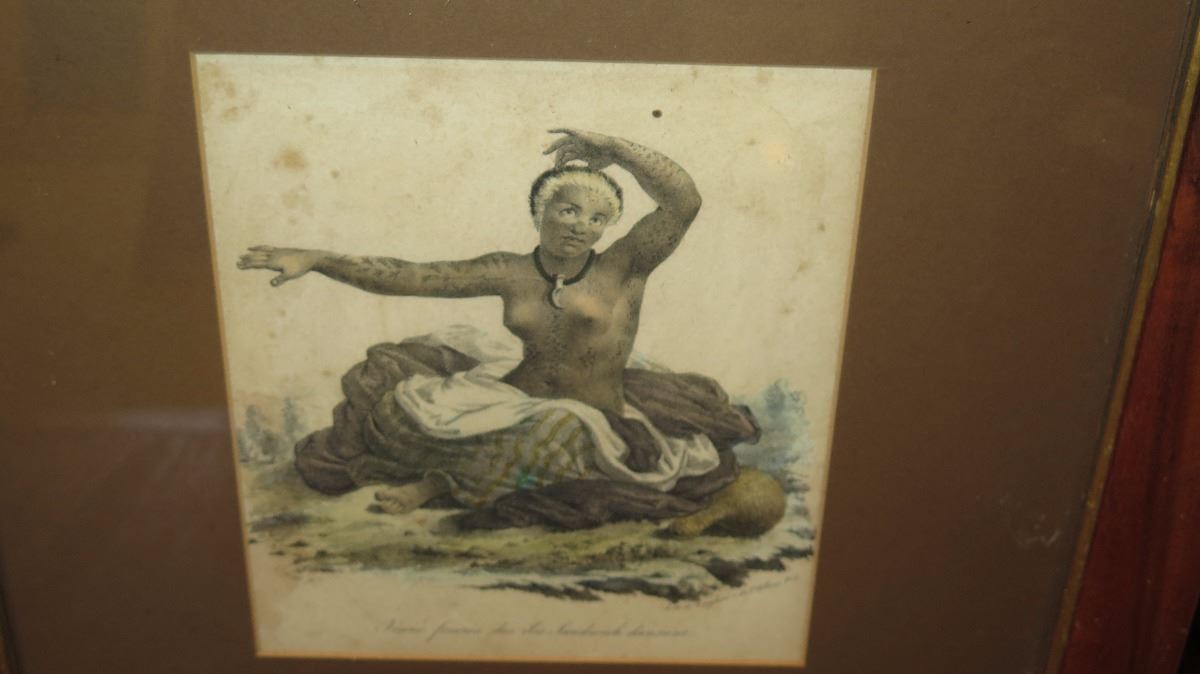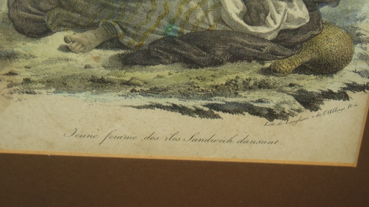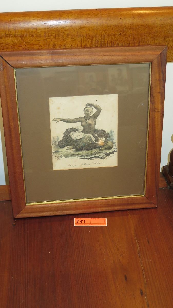 Old Framed Topographical Print: "Jeune Femme Des Iles Sandwich Dansant" 16x15
