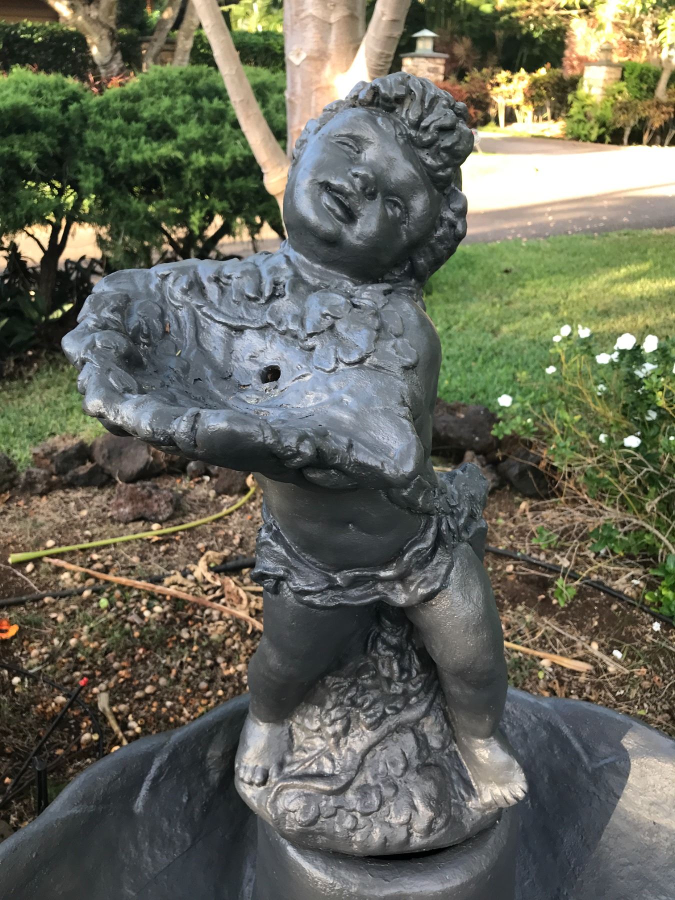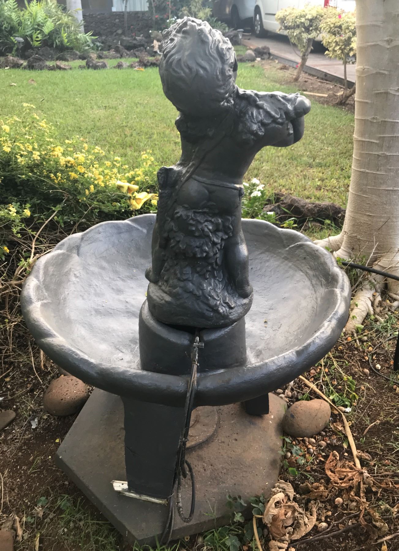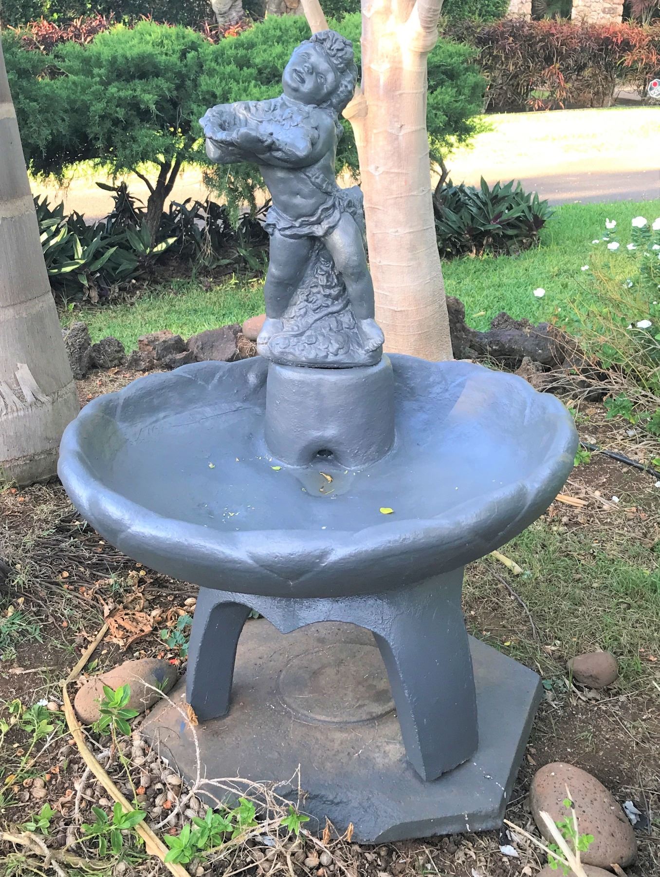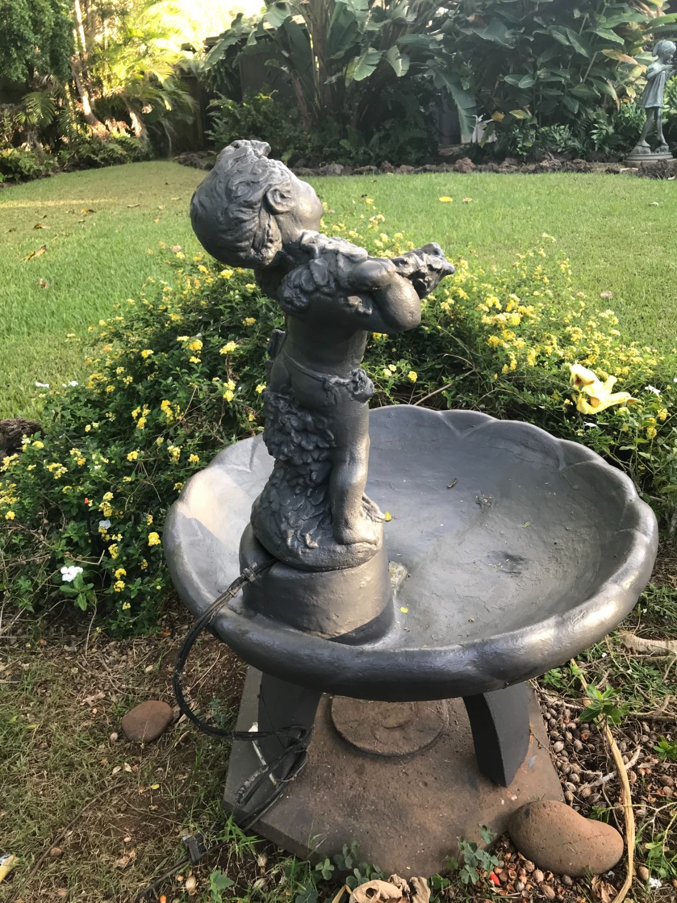 Beautiful highly-detailed cupid fountain with a very sweet face. Water pours from the bowl she is holding, into the pond below. Creates harmonious sounds of falling water. Cupid and fountain sit upon a pedestal and can be used with or without the pedestal. Excellent condition. Electric pump. Fountain: 32"x32"x49"; Bowl is 32"Wx7"H; Pedestal base to bottom of bowl 16"H. (Note: Descriptions for all items in this catalog was provided by Dianne Lassen)