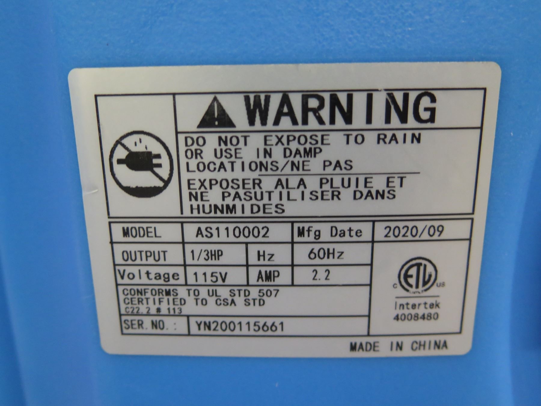 One Dry Air Scrubber Model AS110002 (works on High/Low-does not power off)