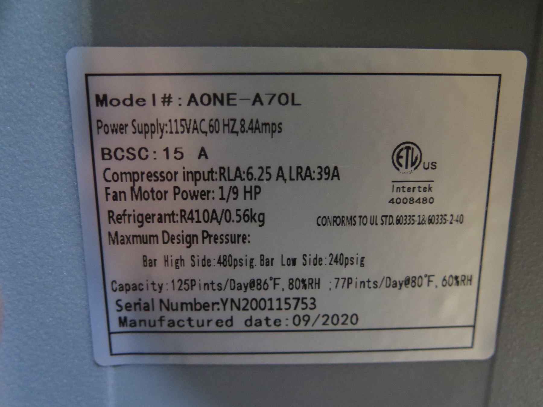 One Dry Commercial Dehumidifier Model AONE-A70L