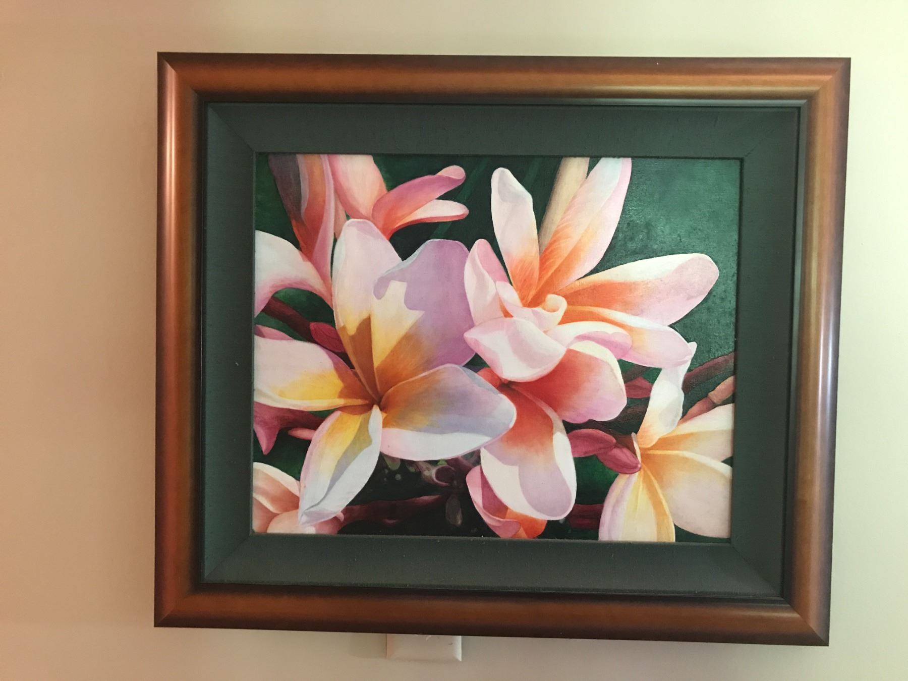Maui Magic, an original oil painting on canvas in the "glazing" technique, using hundreds of layers of paint starting out with the lightest hues and shades so that each layer would bring more depth. Framed in Koa wood. Took 2 months to paint. Painted by Dianne Lassen Winter. Framed 27'' x 4'' x 23'' without frame 20''x16''. (Note: Descriptions for all items in this catalog was provided by Dianne Lassen)