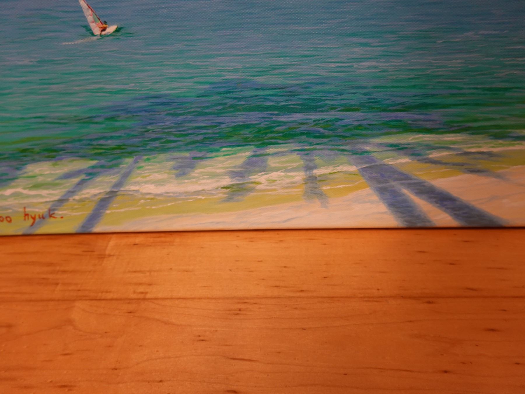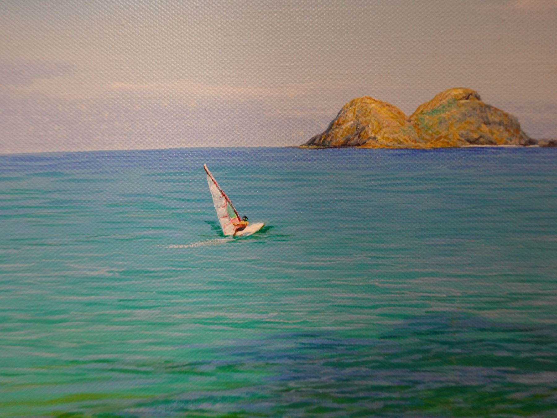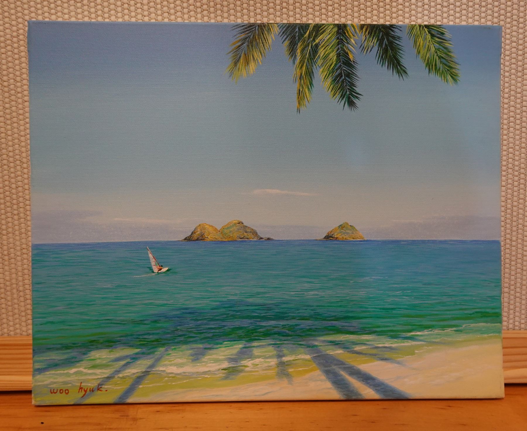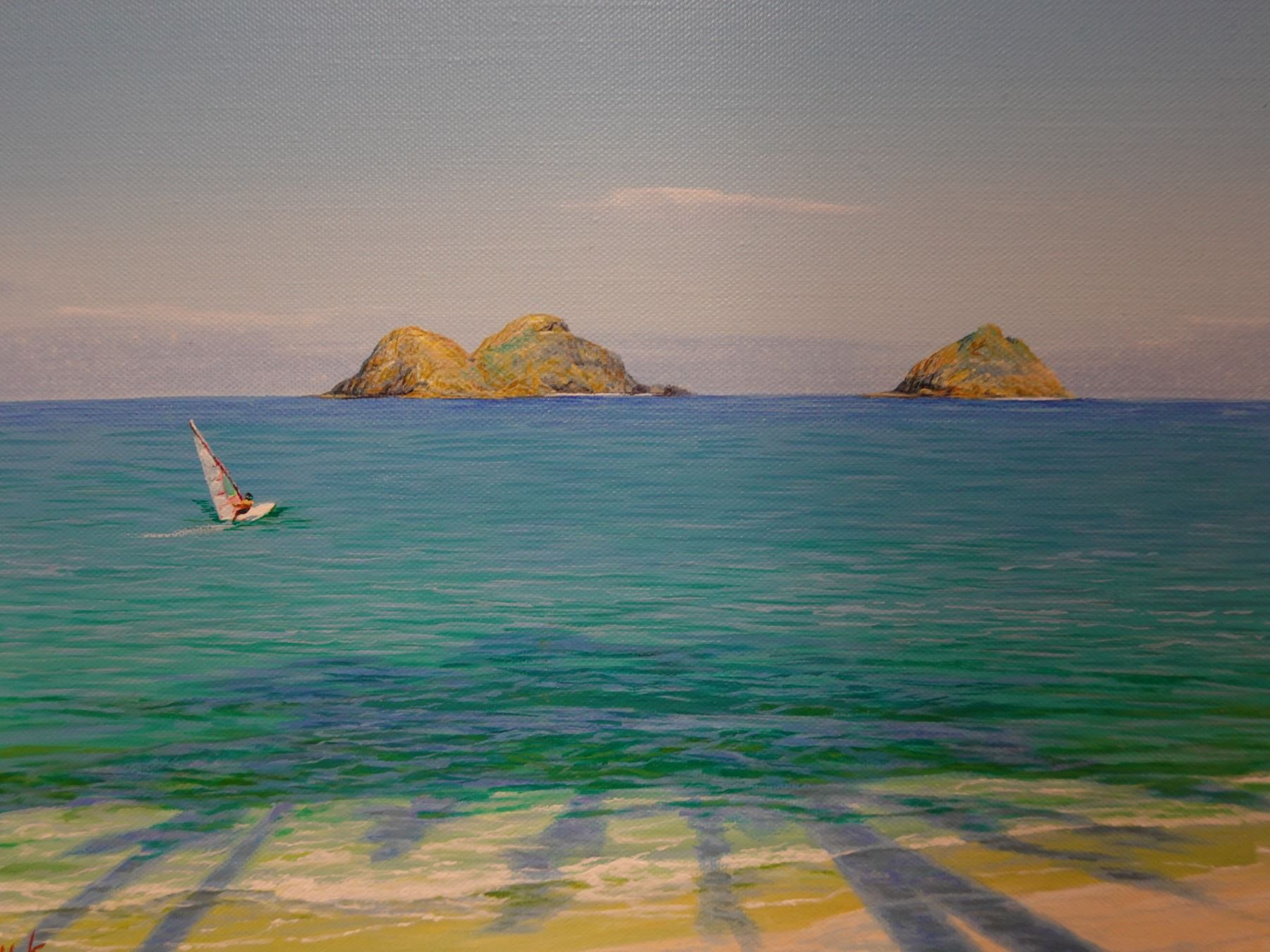 Original Painting on Canvas, Mokuloa Islands & Windsurfer by Woo Hyuk, Hawaii Artist from School of Daniel Kim. Unframed 16" x 20"