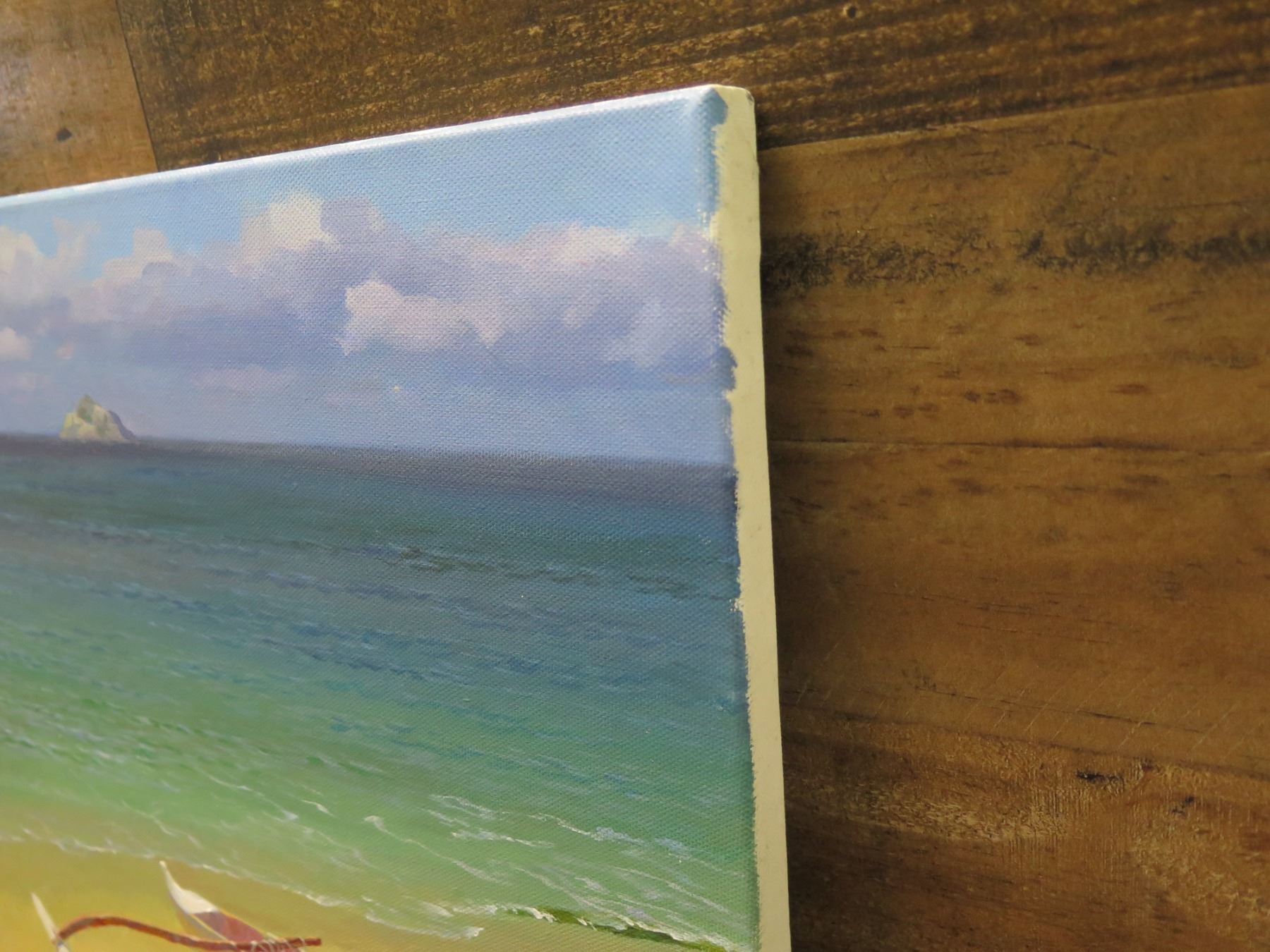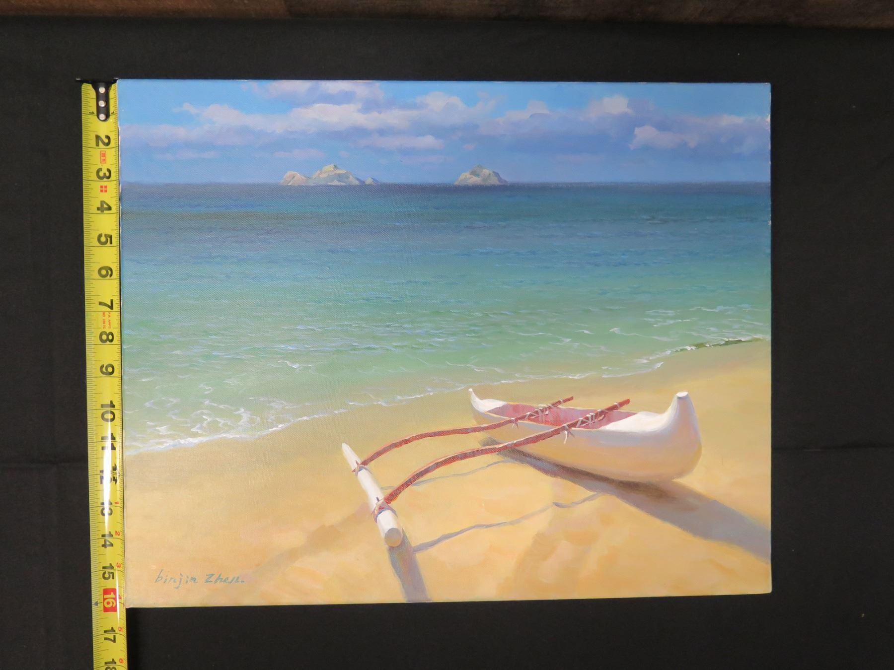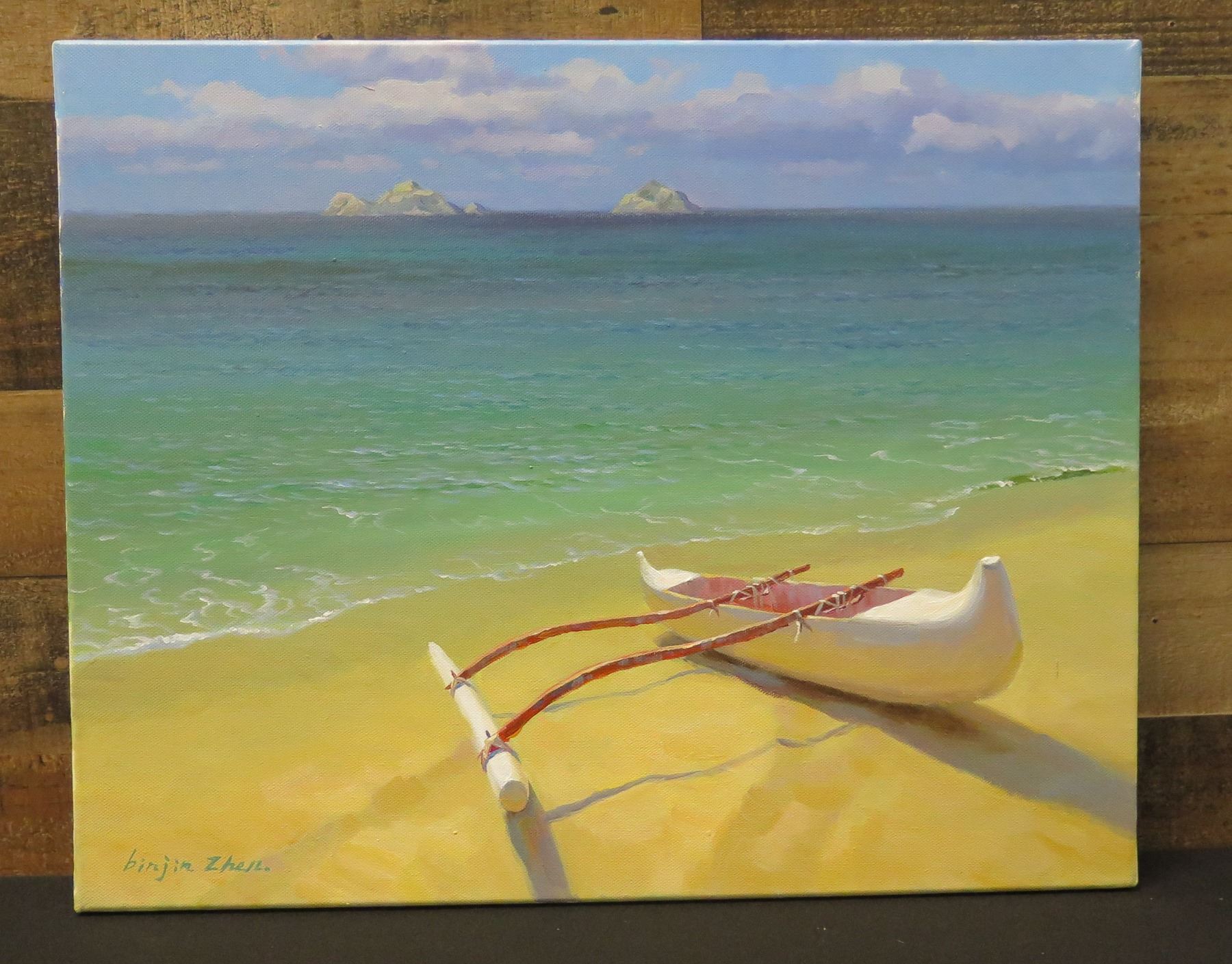 Outrigger Canoe w/ Mokulua Islands Oil on Canvas by Artist Binjim Zhen, School of Daniel Kim Hawaii, Unframed 16" x 20"