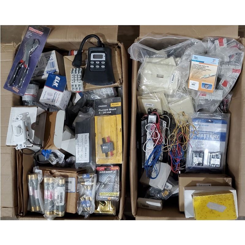 items including: Class H Fuses 15A and 25A, (13) splices (10) assorted ballasts, (8) industrial conduits (8) fluorescent Lampholders (7) dimmer switches and canopy switch, (30) Lamp Module C assorted relay sockets, (16) circuit breaker lugs, (2) digital timers, (4)Hole Seals, electric meter plus more . ** The seller has provided the SKU's as a courtesy for reference on Grainger.com SKU's: N/A