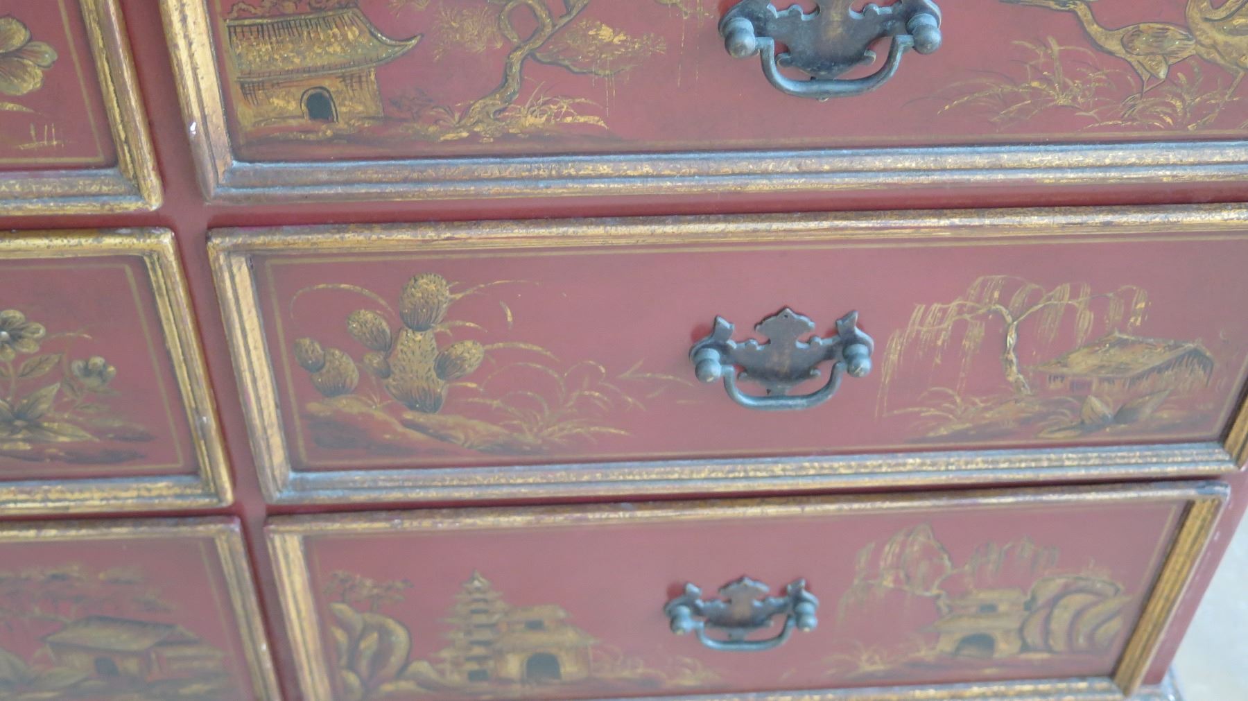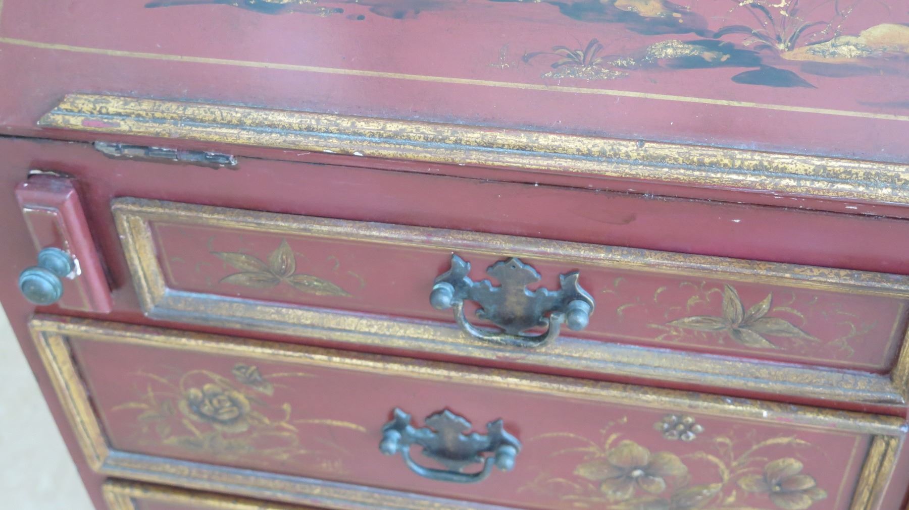 Painted Chinoiserie Secretary w/Cabinet, 2 Pcs, Approx. 34"W X 13.5"D X 90.5" H. Top top half comes off so there are two pieces.
