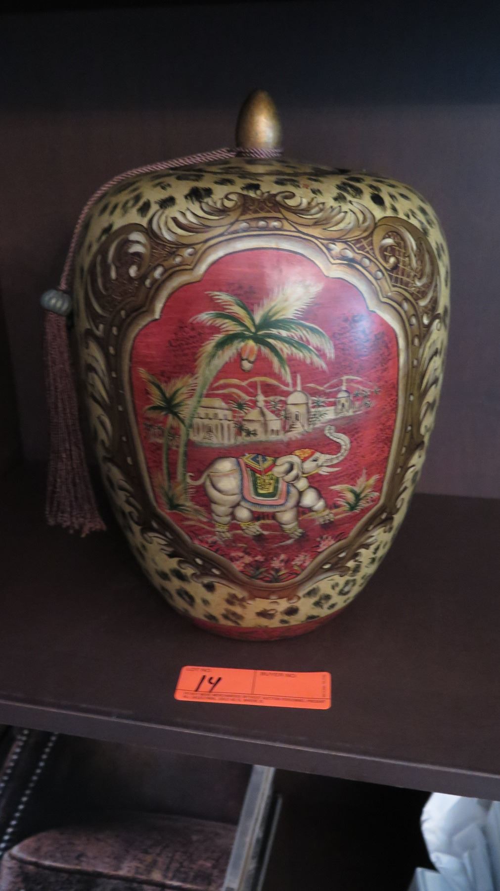 Painted Decorative Ceramic Urn w/ Lid, Elephant/Leopard Motif, Approx 12" H