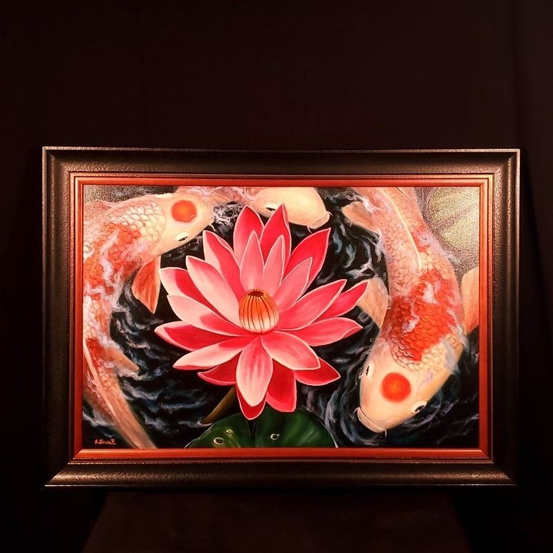 "Good Luck'' Painting 24"x36'' of a Koi Fish and Lotus Flower with Certificate of Authenticity