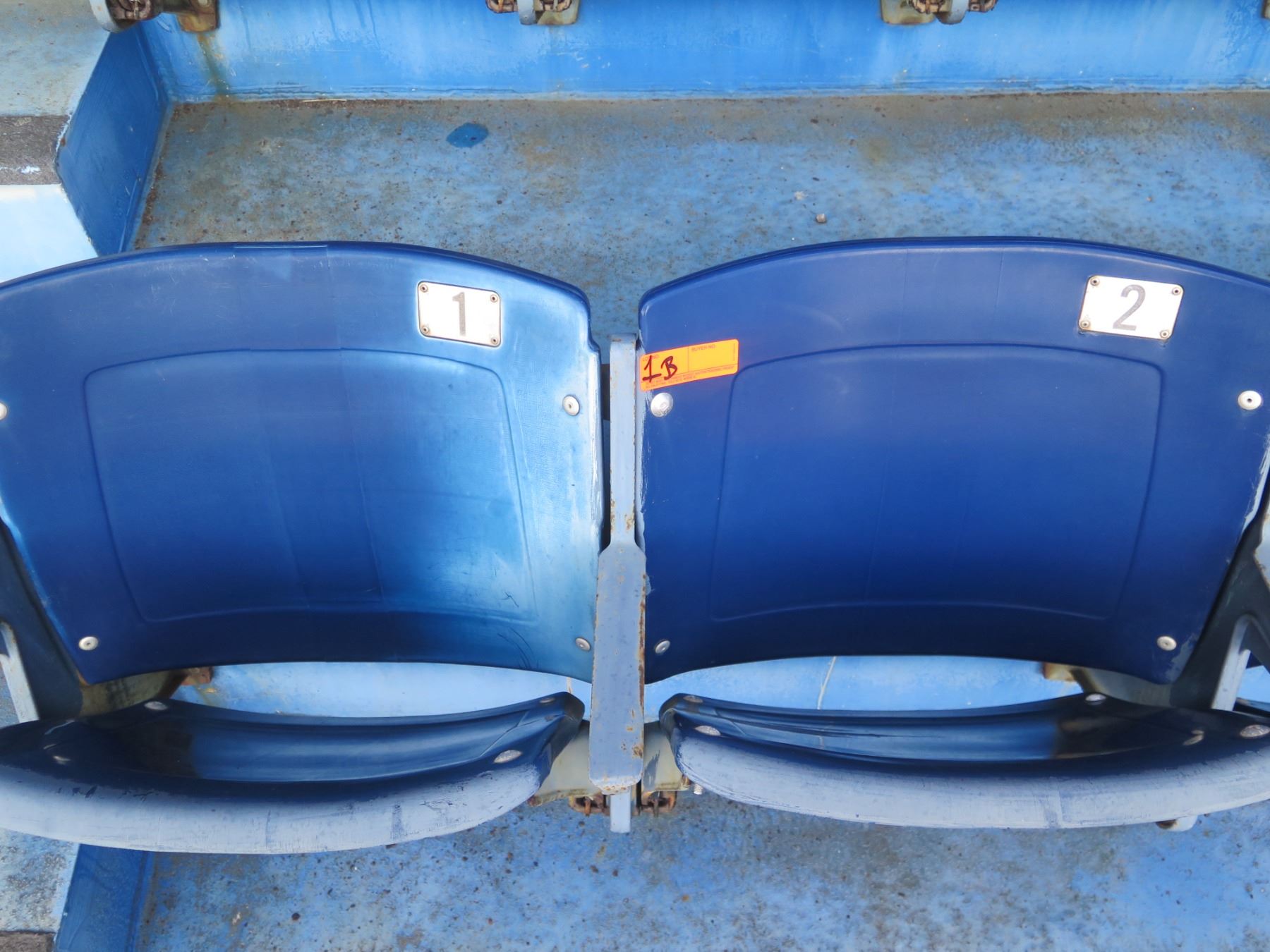 Pair Aloha Stadium Seats w/ Backs & 3 Armrests, Blue, Seats 1 & 2, 45"x13"x28"H. Note: Seats have been removed for pick up