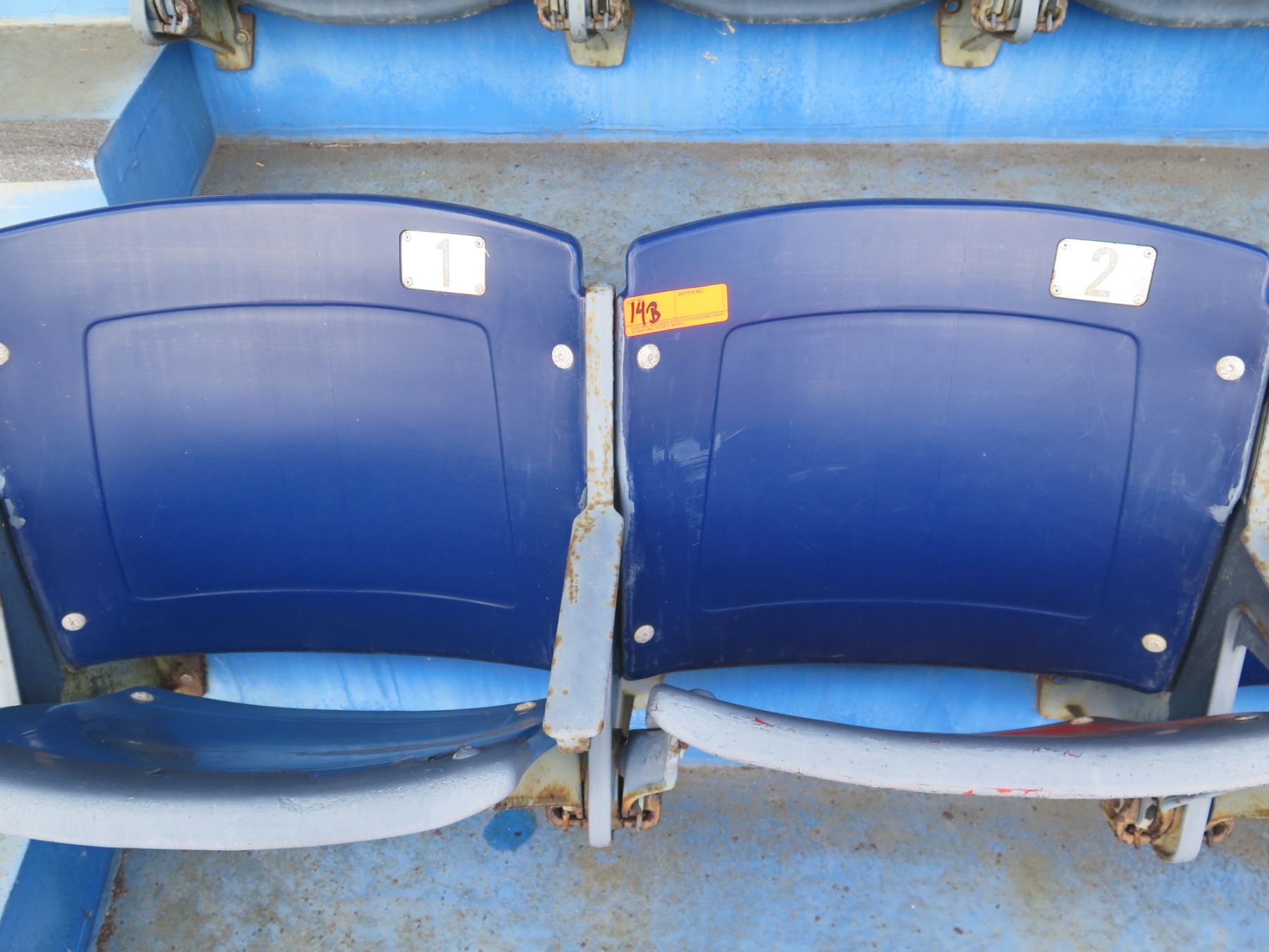 Pair Aloha Stadium Seats w/ Backs & 3 Armrests, Blue, Seats 1 & 2, 45"x13"x28"H. Note: Seats have been removed for pick up