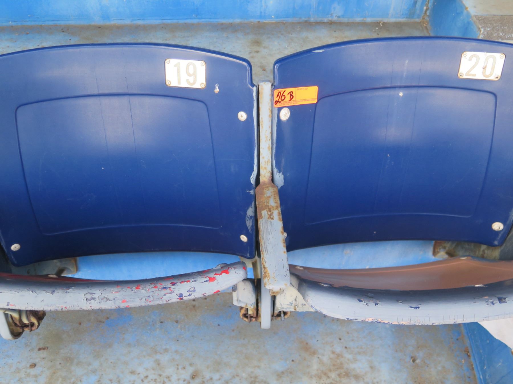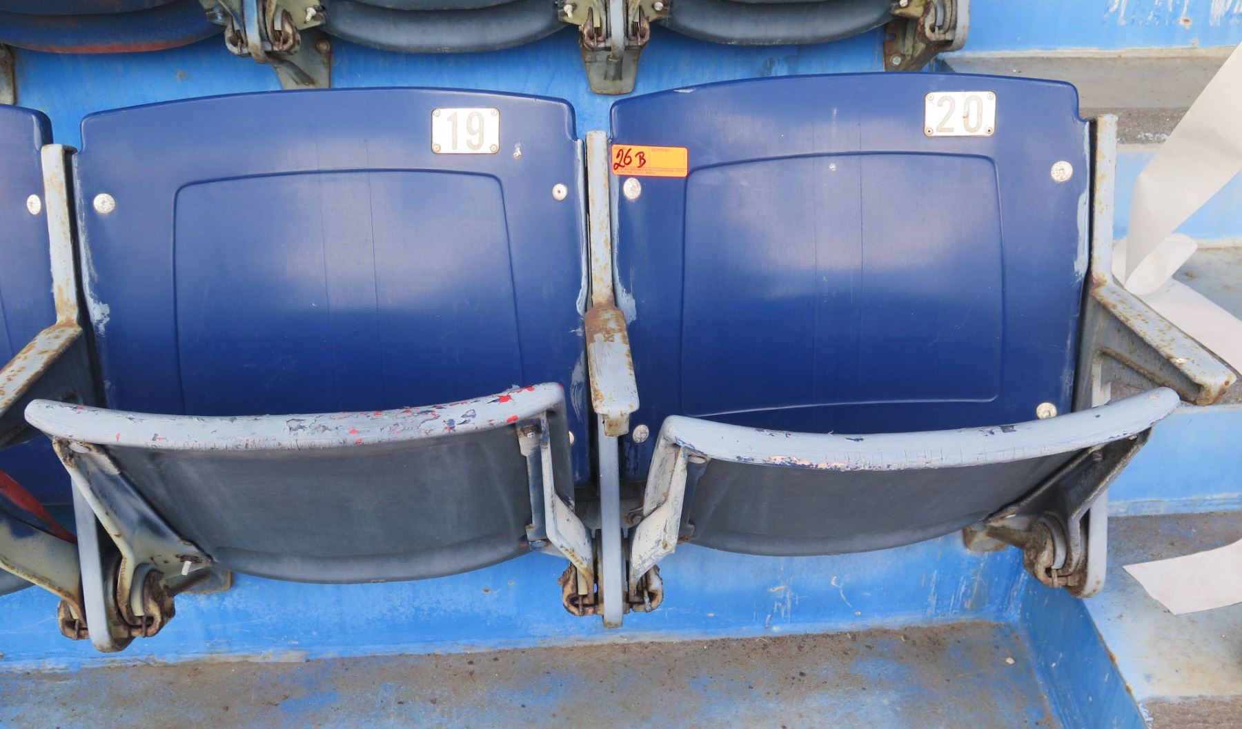 Pair Aloha Stadium Seats w/ Backs & 3 Armrests, Blue, Seats 19 & 20, 45"x13"x28"H. Note: Seats have been removed for pick up