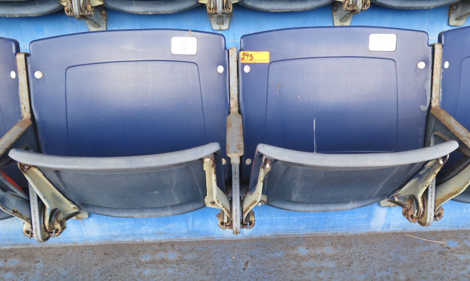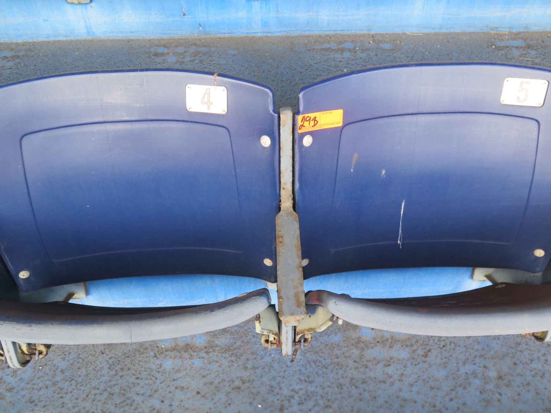 Pair Aloha Stadium Seats w/ Backs & 3 Armrests, Blue, Seats 4 & 5, 45"x13"x28"H. Note: Seats have been removed for pick up