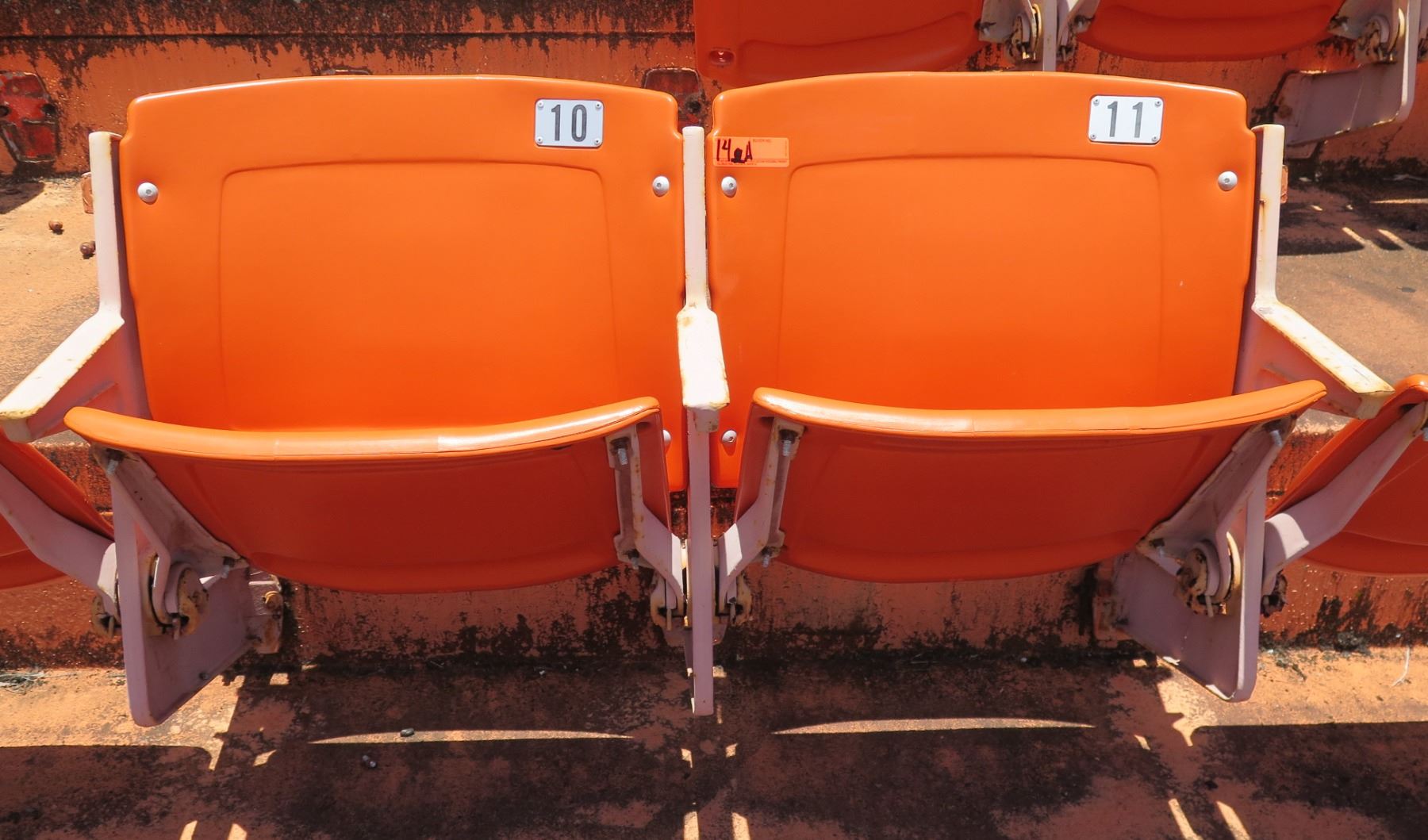 Pair Aloha Stadium Seats w/ Backs & 3 Armrests, Orange, Seats 10 & 11, 45"x13"x28"H. Note: Seats have been removed for pick up