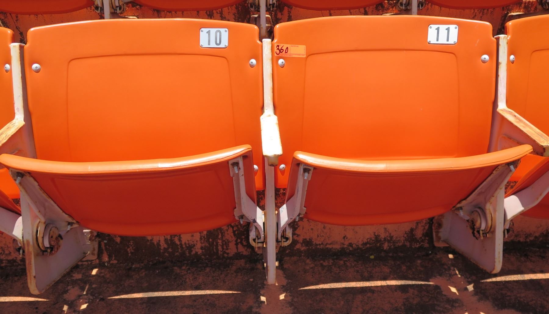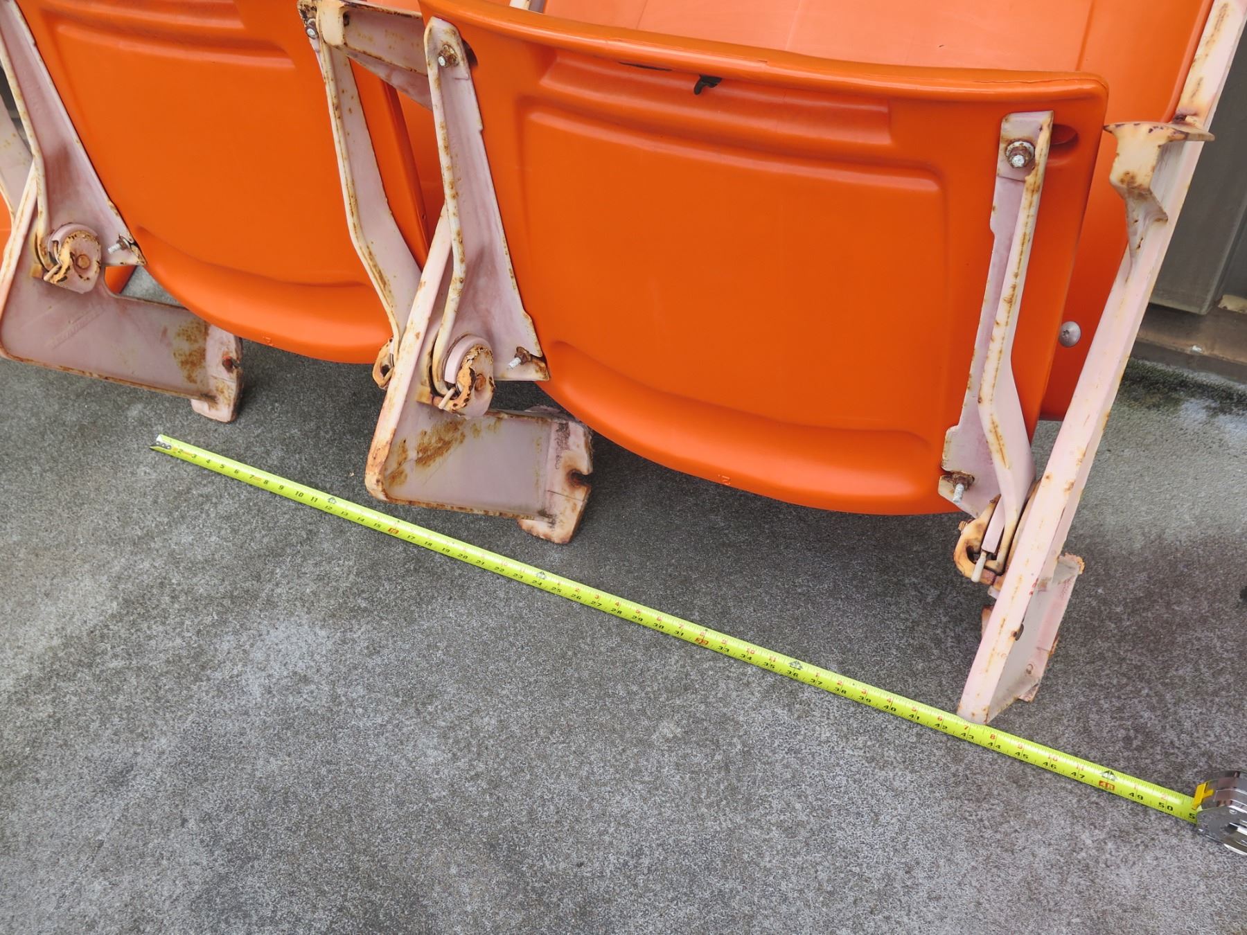 Pair Aloha Stadium Seats w/ Backs & 3 Armrests, Orange, Seats 10 & 11, 45"x13"x28"H. Note: Seats have been removed for pick up