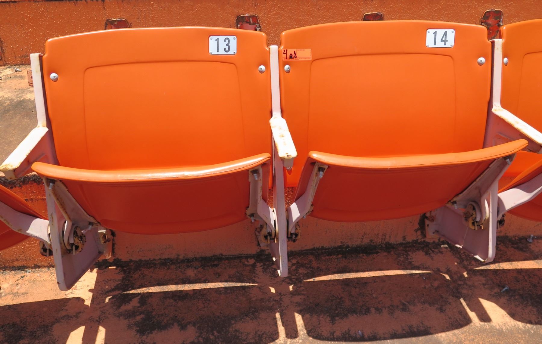 Pair Aloha Stadium Seats w/ Backs & 3 Armrests, Orange, Seats 13 & 14, 45"x13"x28"H. Note: Seats have been removed for pick up