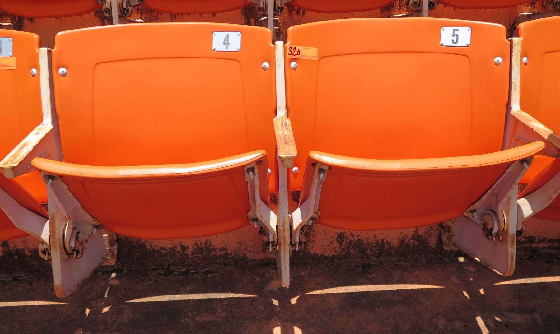 Pair Aloha Stadium Seats w/ Backs & 3 Armrests, Orange, Seats 4 & 5, 45"x13"x28"H. Note: Seats have been removed for pick up
