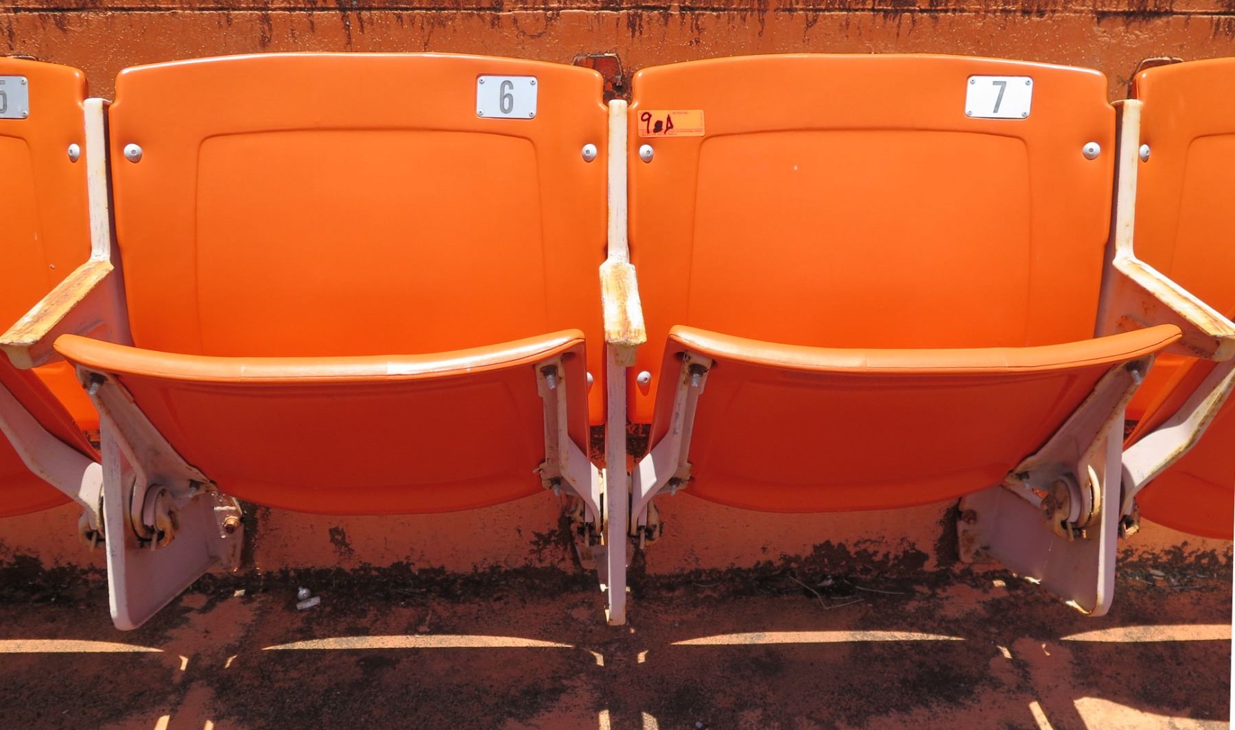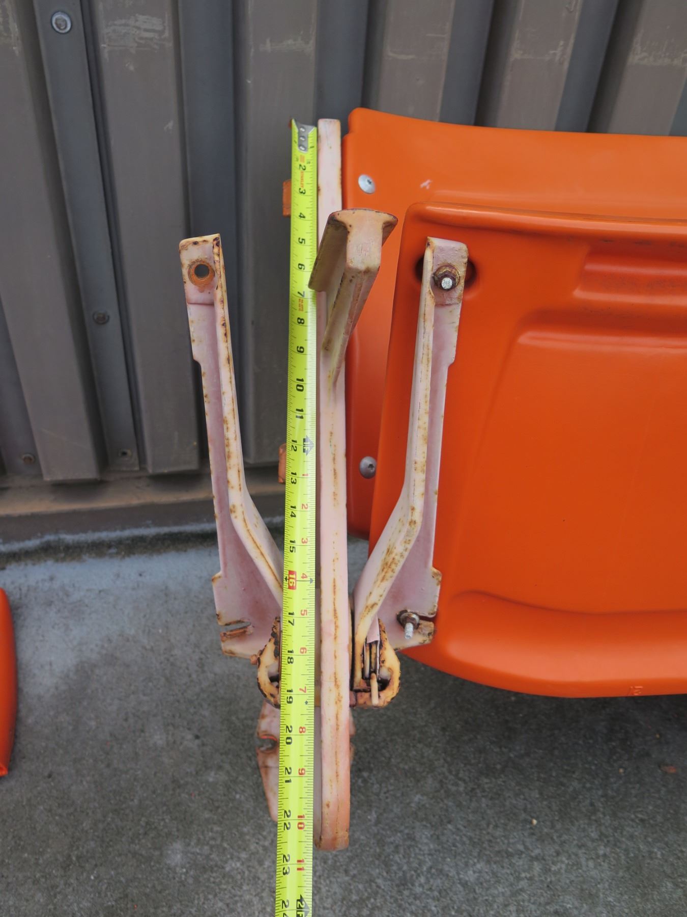 Pair Aloha Stadium Seats w/ Backs & 3 Armrests, Orange, Seats 6 & 7, 45"x13"x28"H. Note: Seats have been removed for pick up